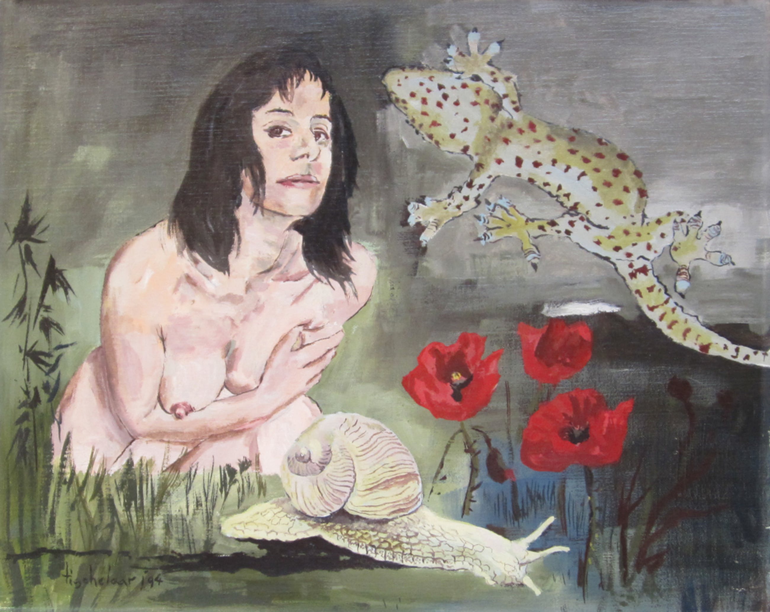 Aan de waterkant ontmoet een jonge vrouw o.a. een salamander. André Tigchelaar maakte dit olieverf schilderij op linnen in 1994; het is linksonder gesigneerd en gedateerd. Het formaat van het schilderij is 50x40 cm; het is ingelijst in een alu Nielsen-lijst (met enkele lichte beschadingen).