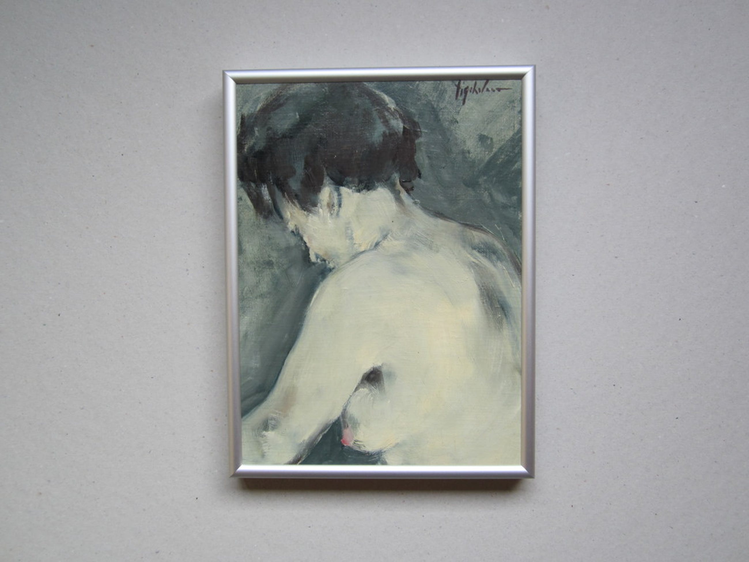 Dit model is door André Tigchelaar geschilderd op linnen en is rechtsboven gesigneerd. De datering ontbreekt maar is vermoedelijk omstreeks 1970. Het schilderij is recent schoongemaakt, gevernist en op mdf gelijmd. De lijst is een strakke Nielsen alu-lijst; het formaat van het schilderij is incl. lijst 31 x 41 cm.