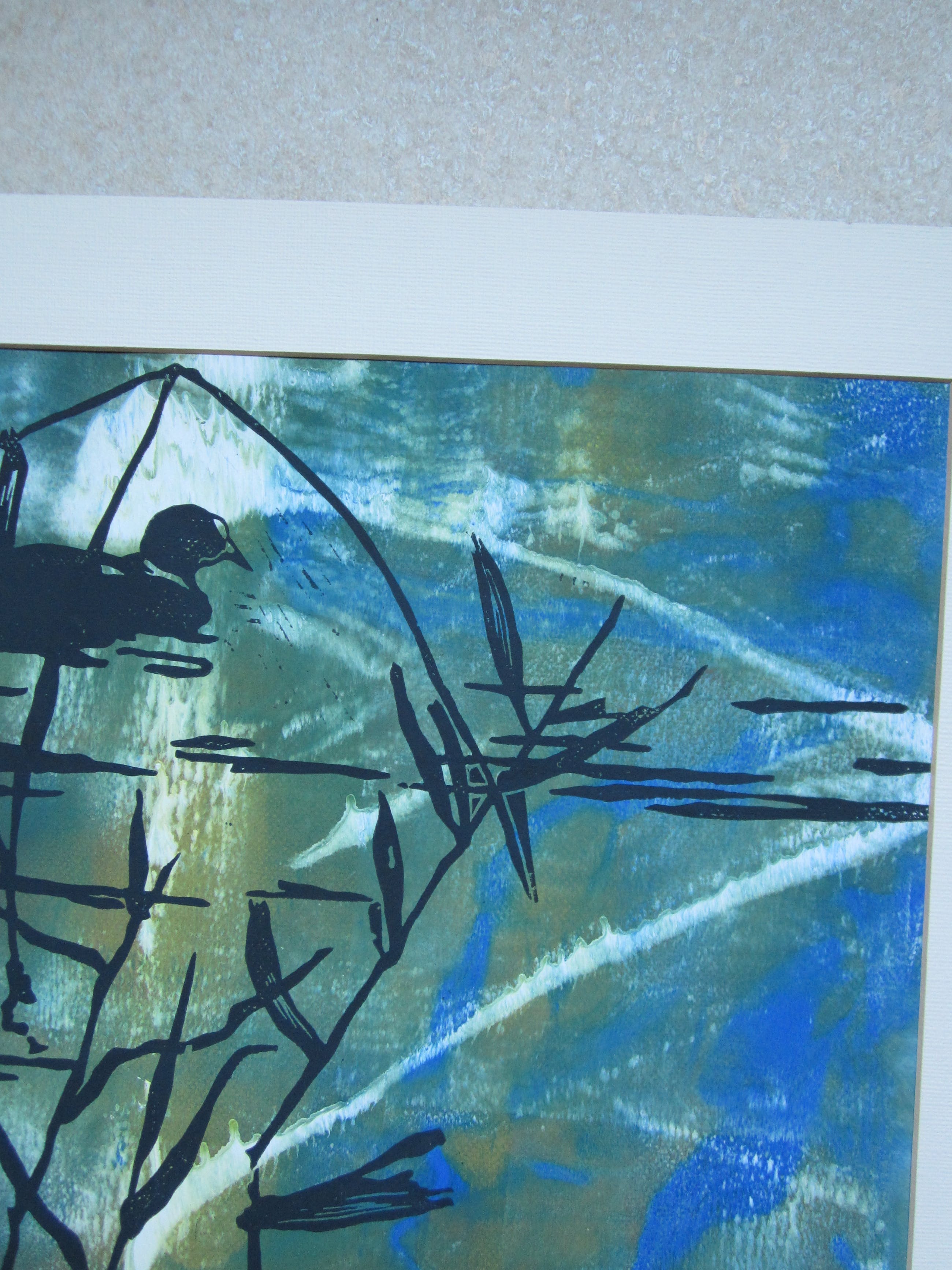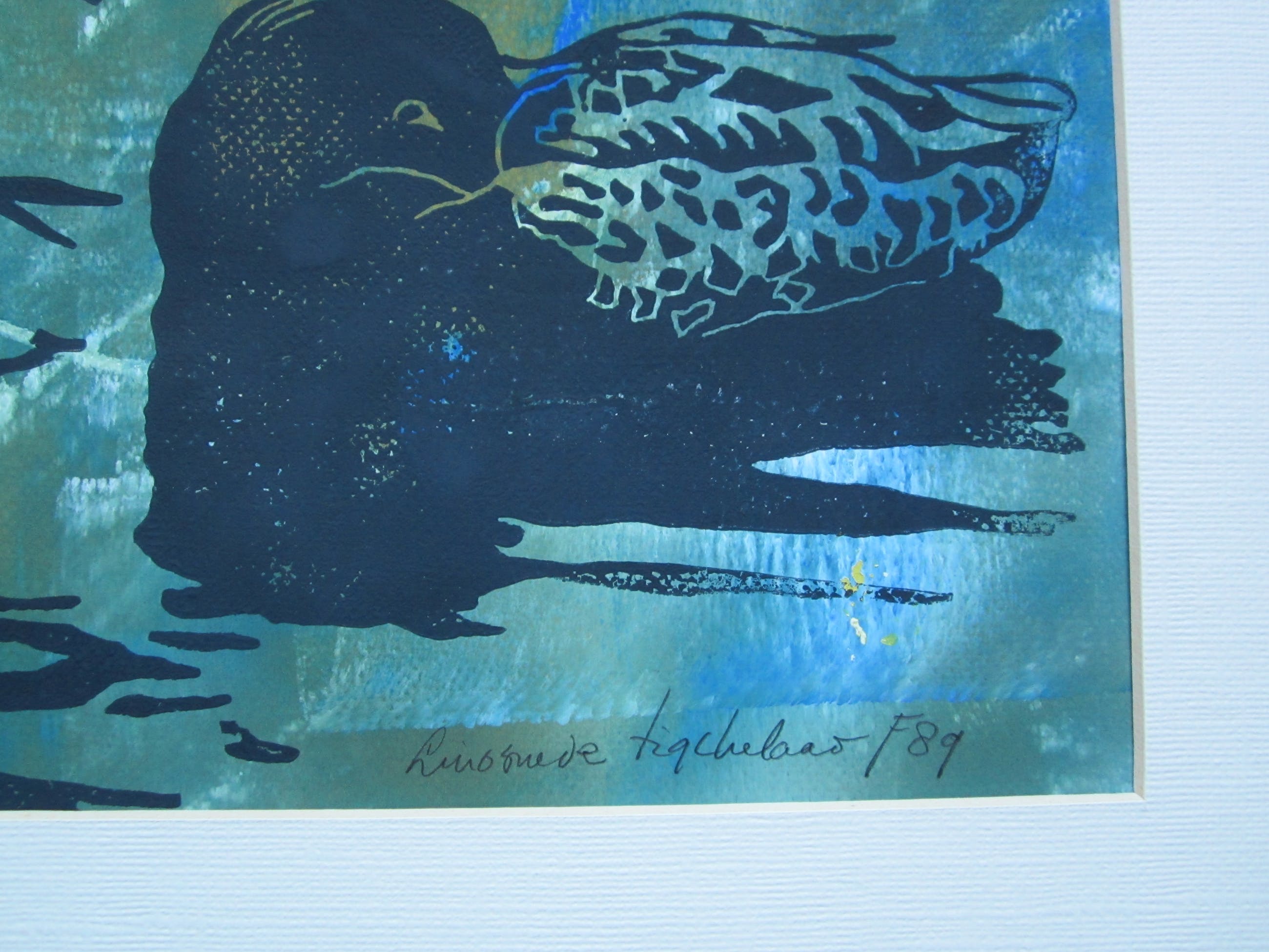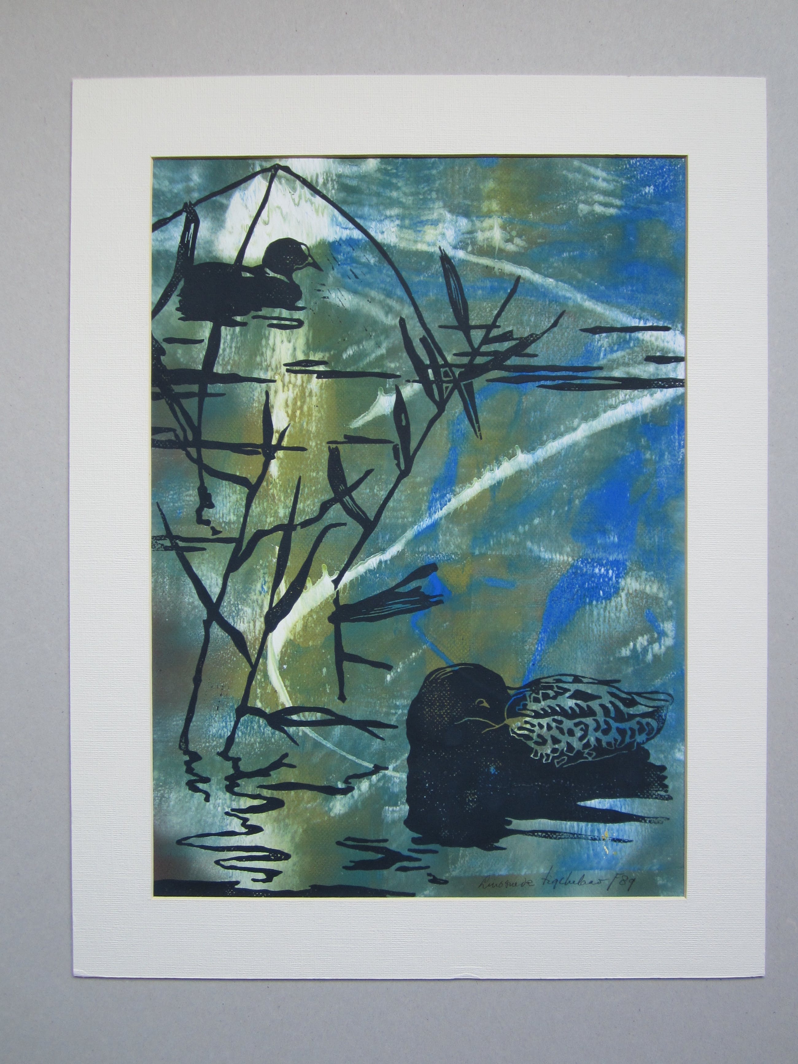 Sfeervolle linosnede van een eend en een meerkoet in het riet. De linosnede is in zwart afgedrukt nadat eerst de achtergrond is aangebracht. De linosnede is rechtsonder gesigneerd en gedateerd. De oplage is niet vermeld, maar bedroeg vermoedelijk slechts 3 exemplaren. Dit is het laatste exemplaar.Dit werk is niet ingelijst, maar wel voorzien van een creme-kleurig passe-partout. Het werk wordt aangetekend verzonden, maar kan ook worden afgehaald.