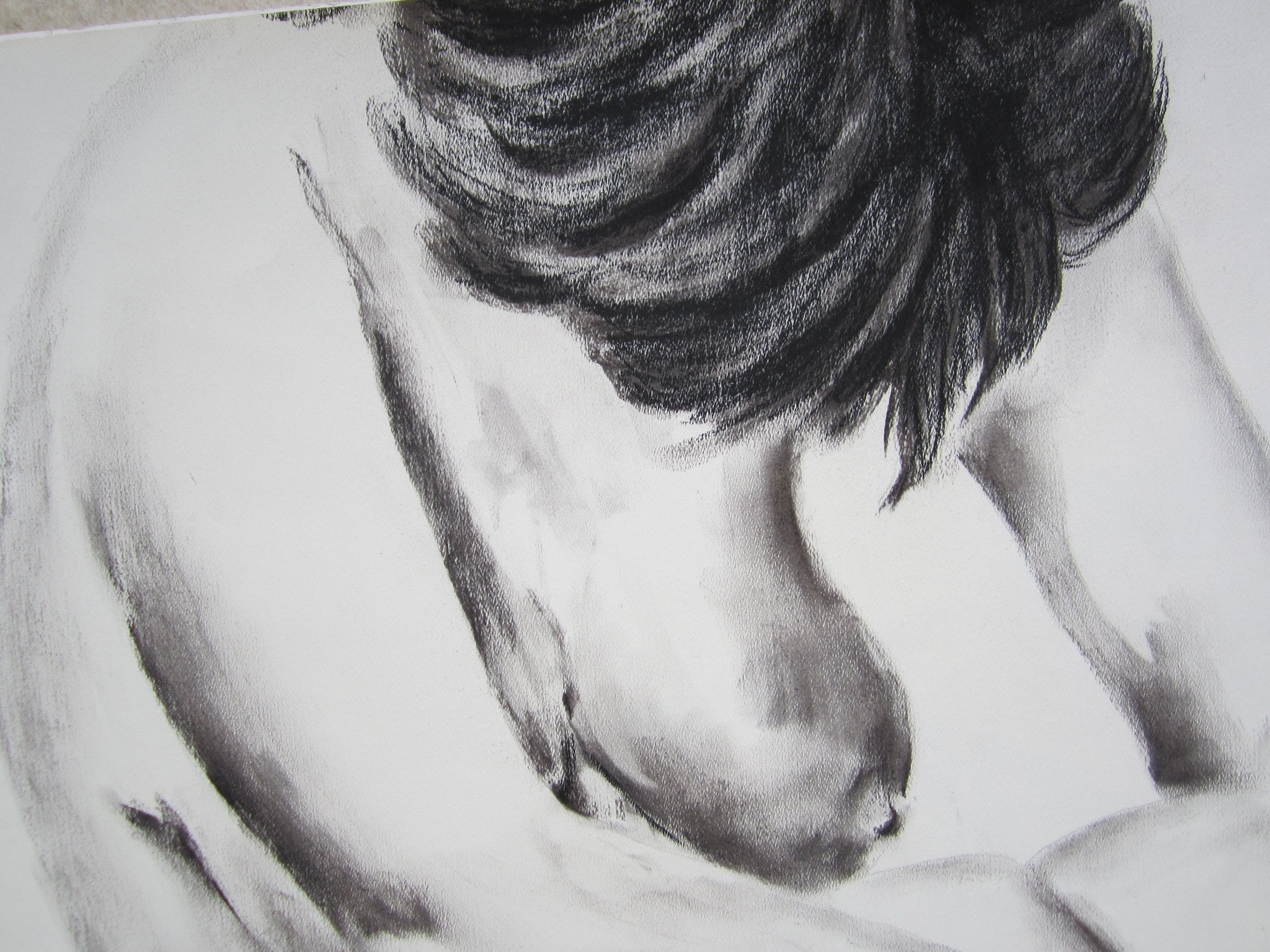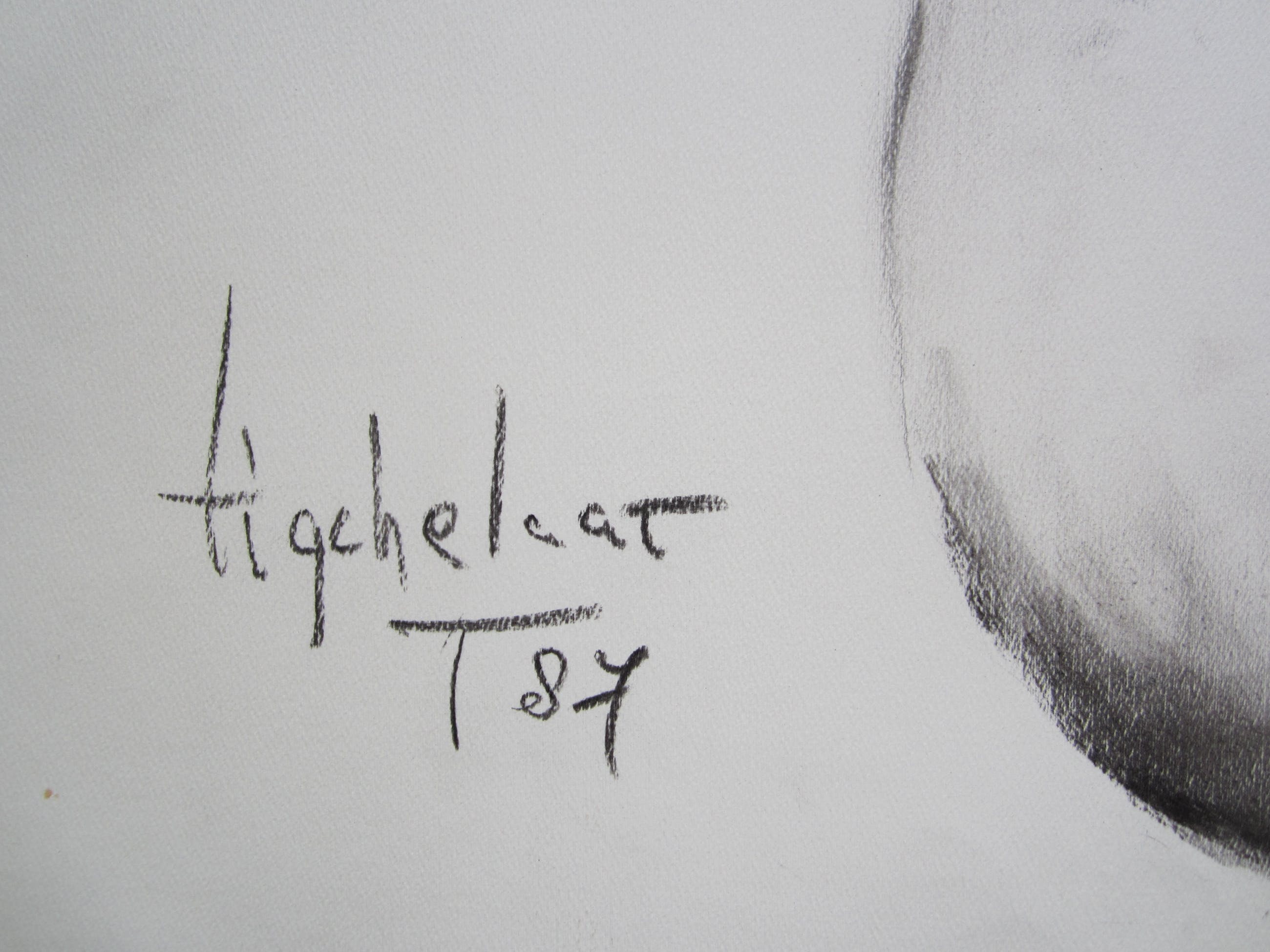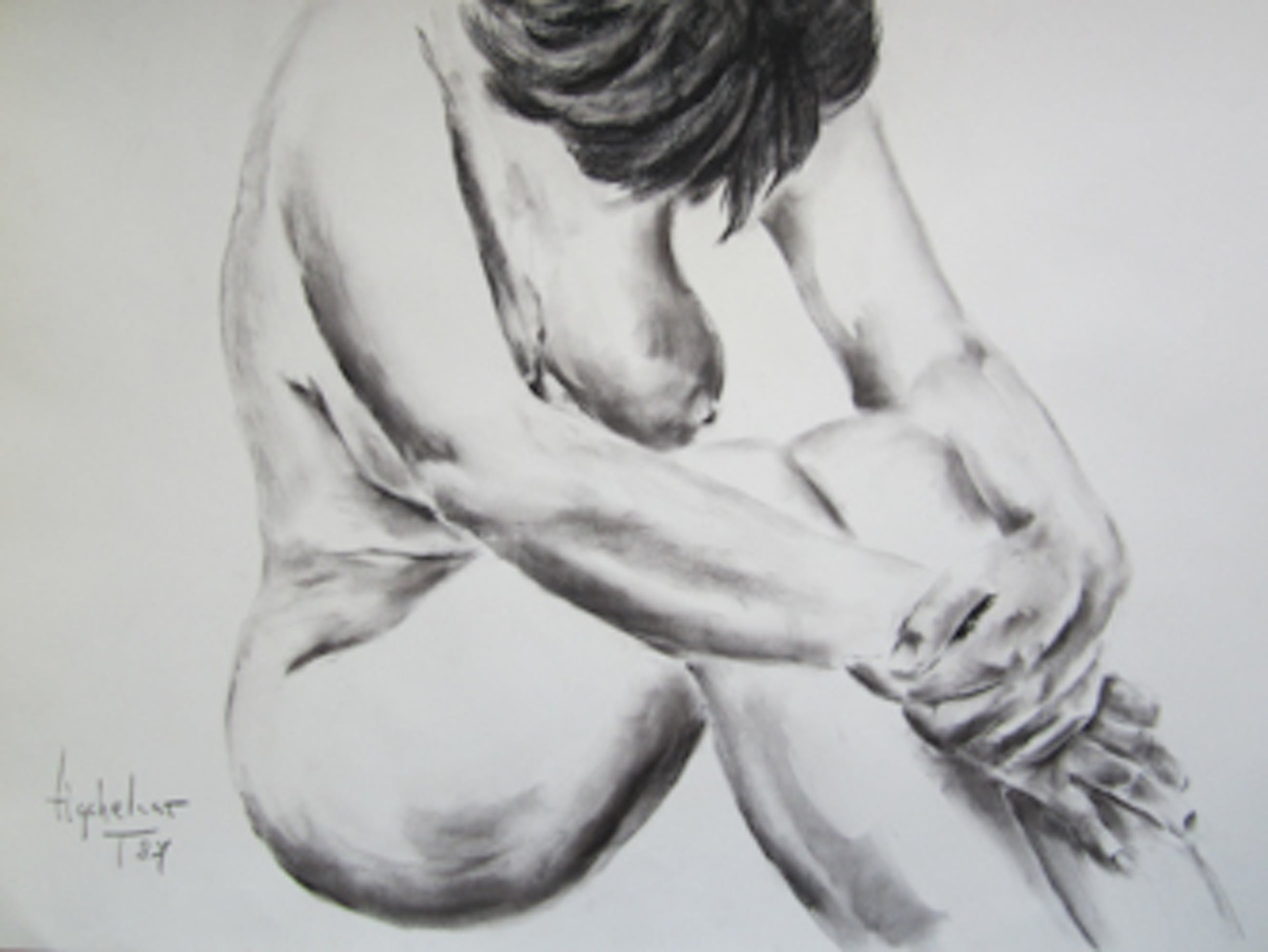Fraaie houtskool tekening van een model. Het werk is linksonder gesigneerd en gedateerd. De randen van het papier zijn licht verkleurd. Dit werk komt rechtstreeks uit de nalatenschap van de in 2011 overleden kunstenaar. Gezien het formaat en de kwetsbaarheid, is het wenselijk de tekening in Zoetermeer af te halen. De verpakkings- en verzendkosten zijn relatief hoog. Verzending naar het buitenland is niet mogelijk.