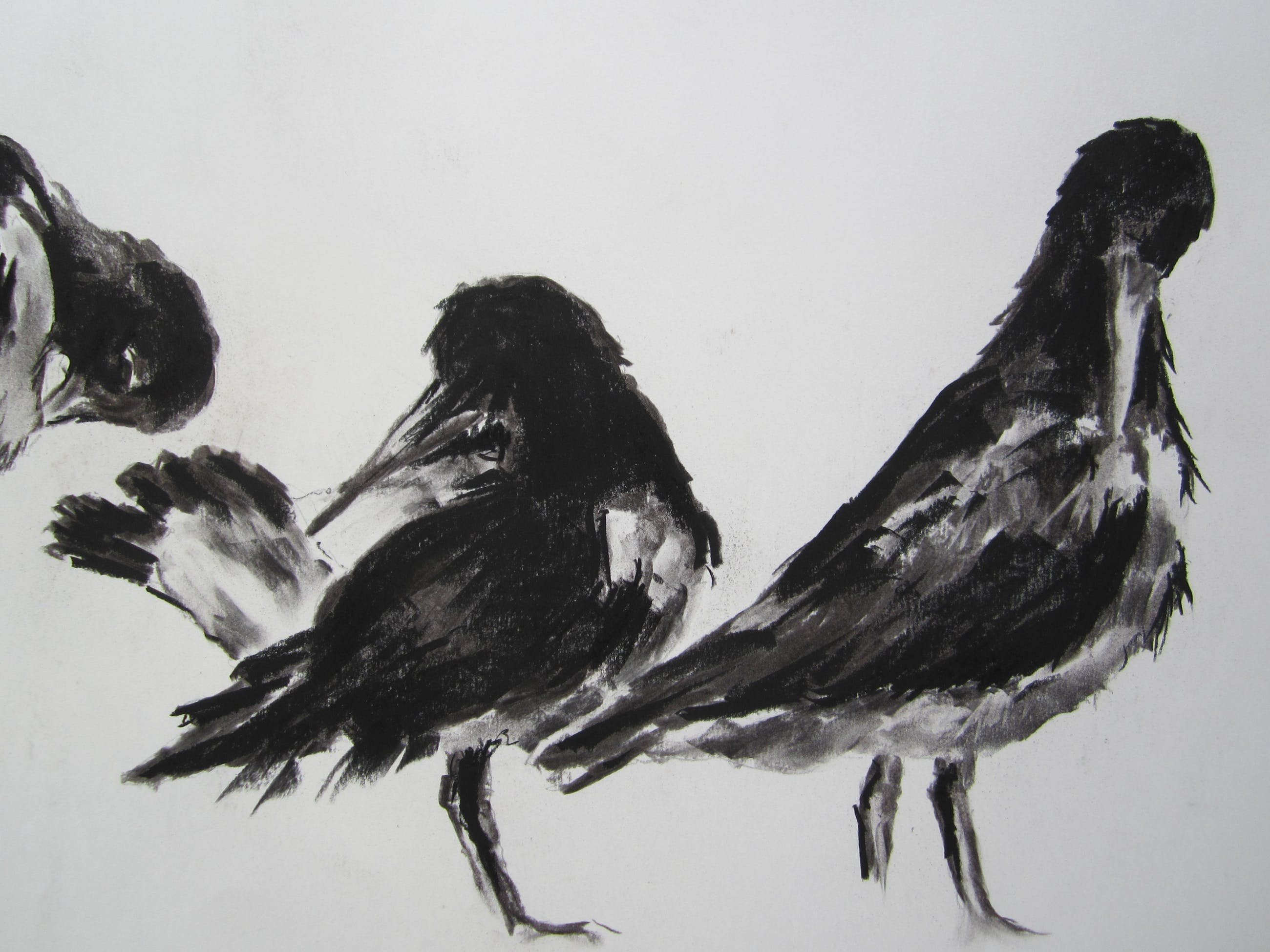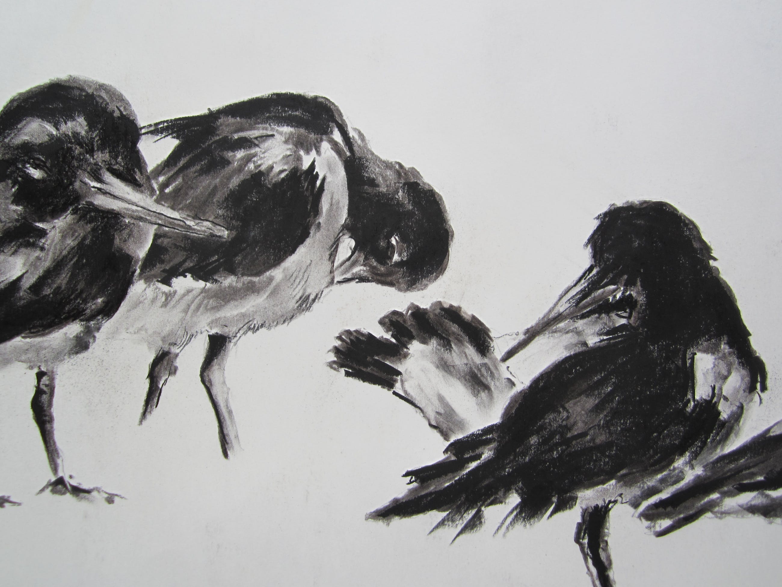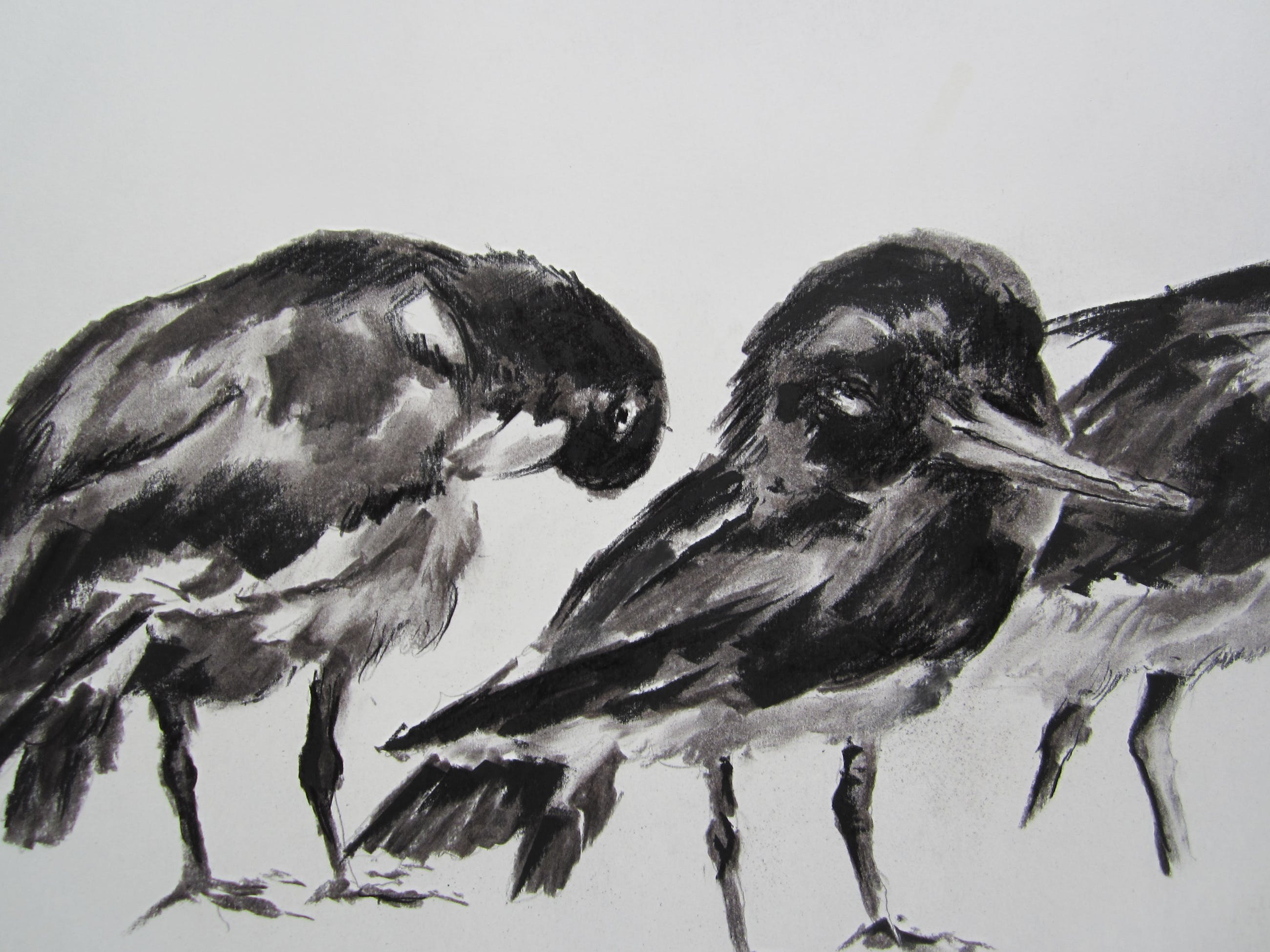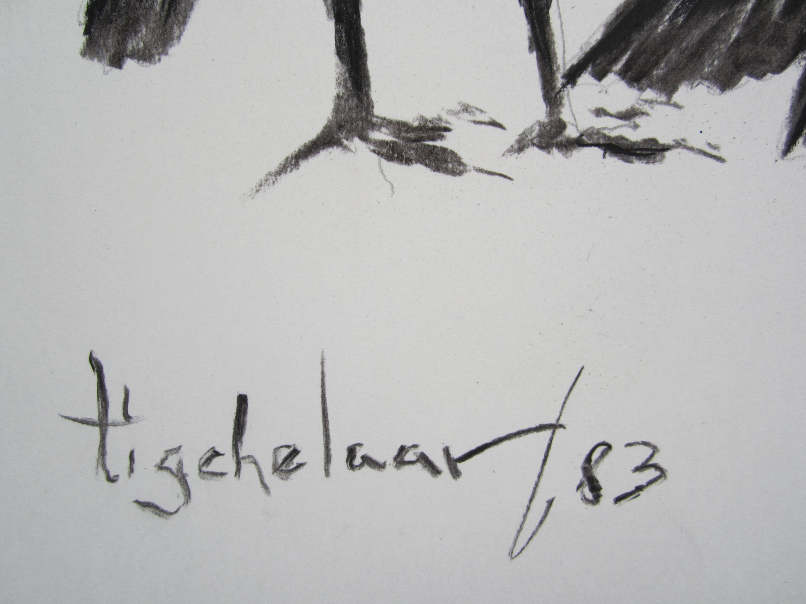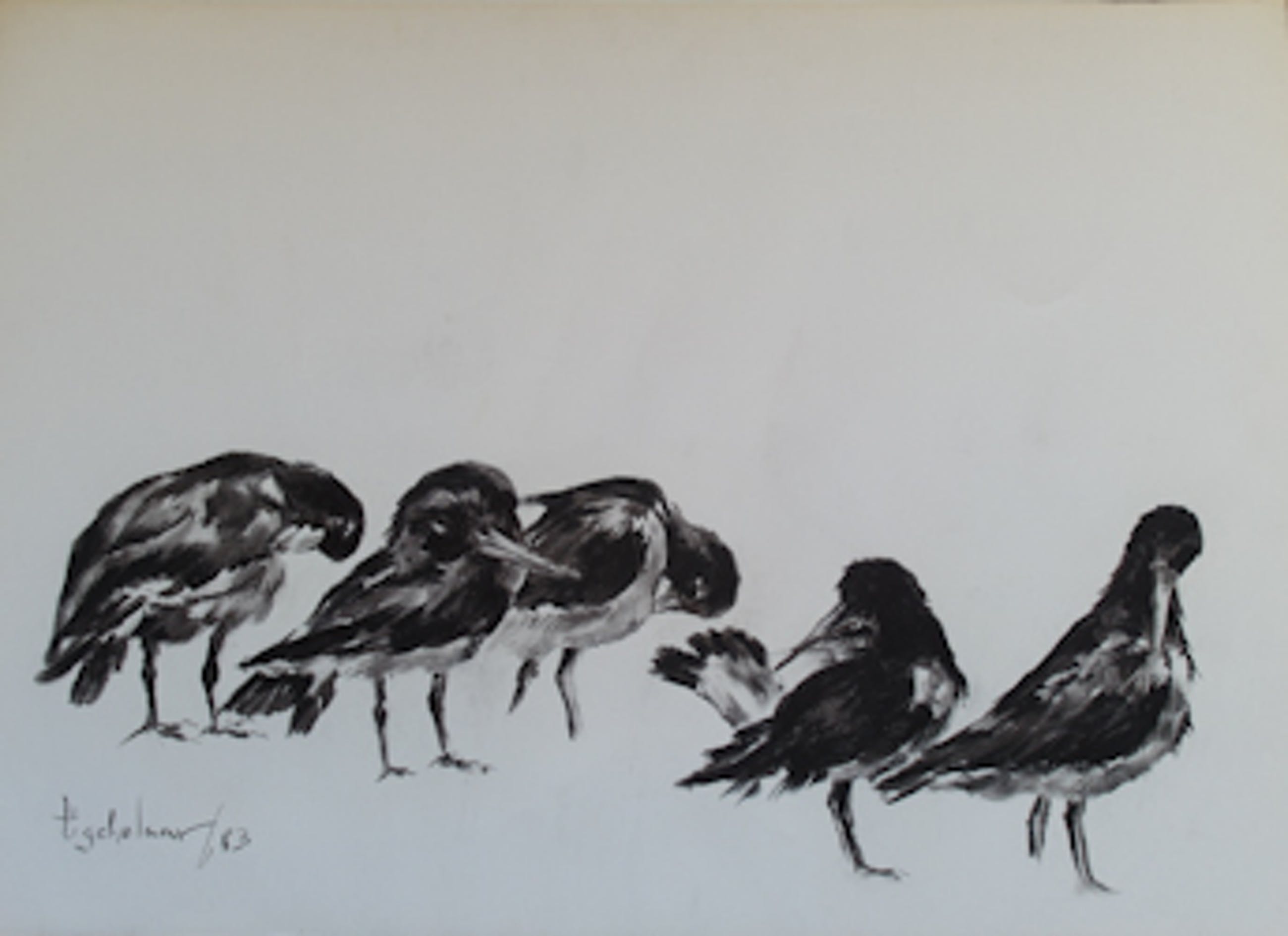 Fraaie tekening van scholeksters in houtskool en siberisch krijt. De randen van het papier zijn licht verkleurd. Dit werk komt rechtstreeks uit de nalatenschap van de in 2011 overleden kunstenaar.Gezien het formaat en de kwetsbaarheid, is het wenselijk om de tekening af te halen in Zoetermeer. De verpakkings- en verzendkosten zijn relatief hoog. Verzending naar het buitenland is niet mogelijk.