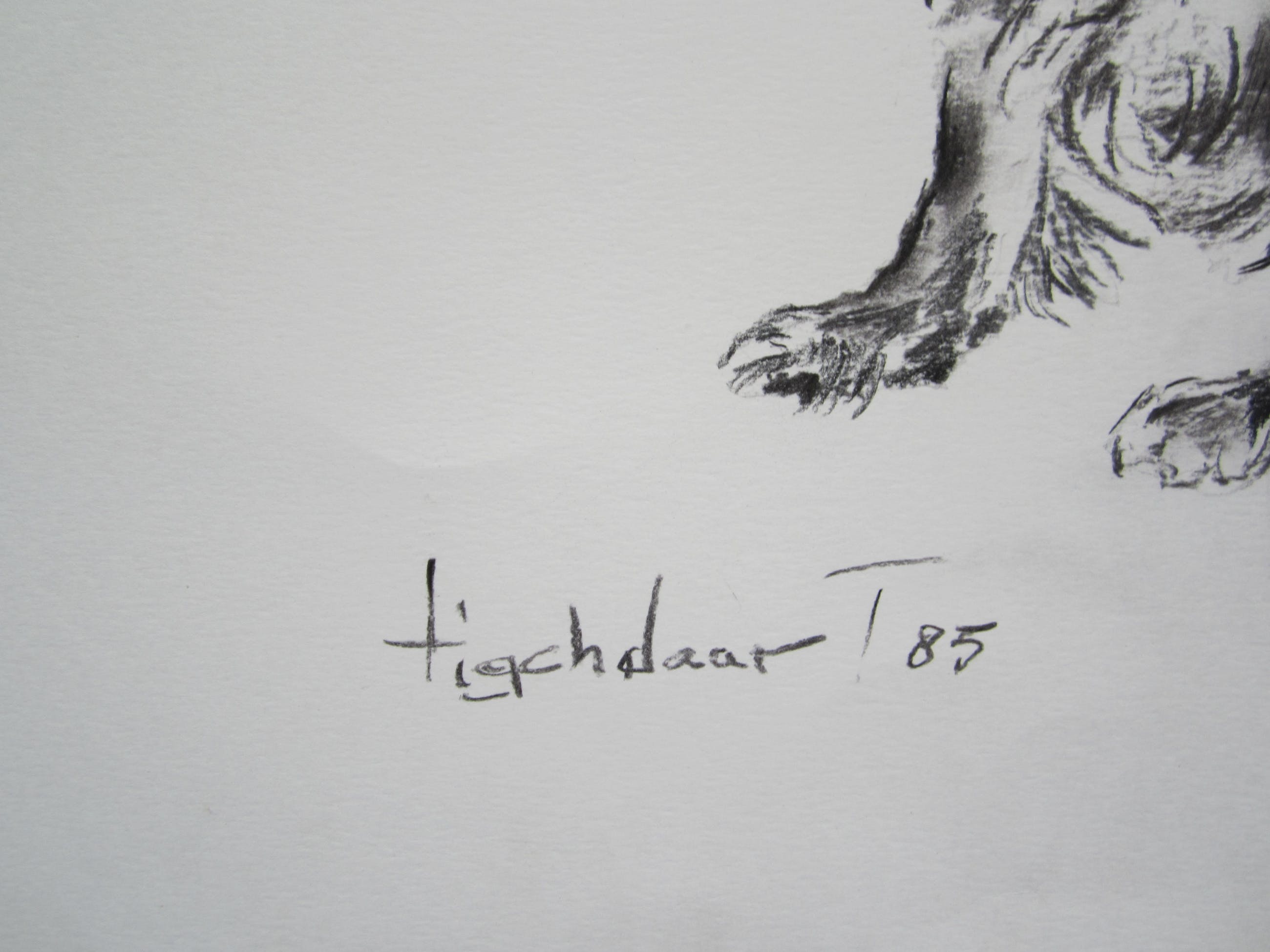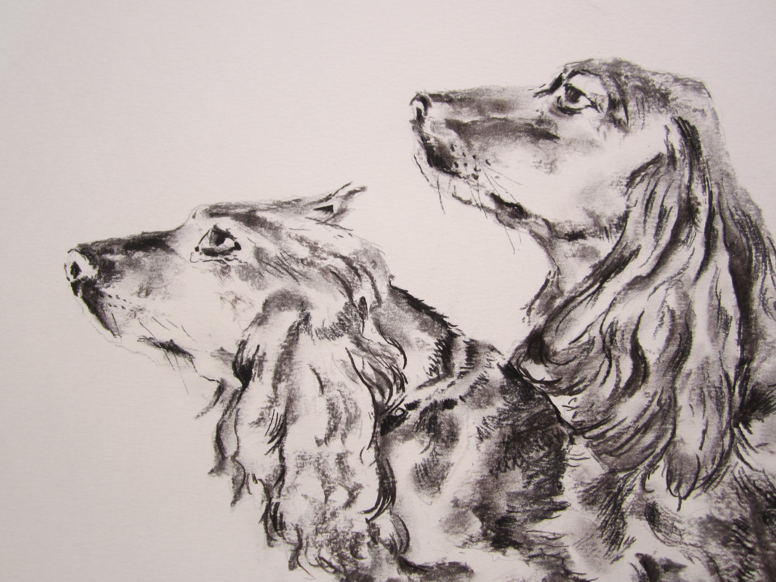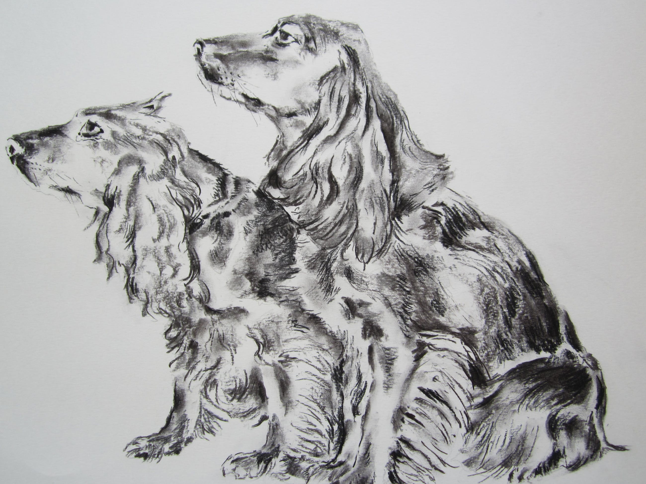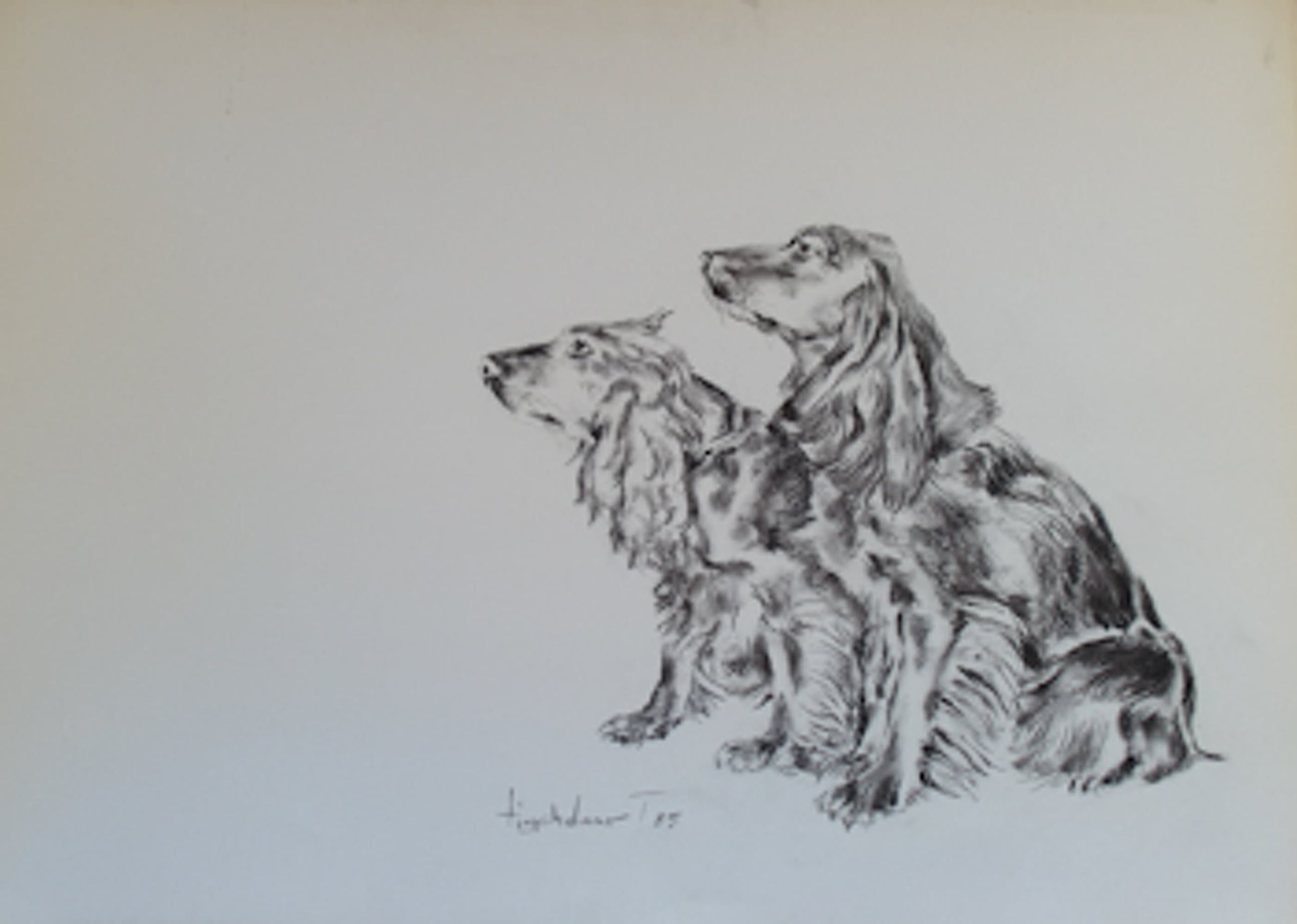 Mooie houtskool tekening van twee spaniels. De tekening is middenonder gesigneerd en gedateerd. De randen van het papier zijn licht verkleurd. Dit werk komt rechtstreeks uit de nalatenschap van de in 2011 overleden kunstenaar. Gezien het formaat en de kwetsbaarheid van de tekening is het wenselijk om de tekening af te halen in Zoetermeer. De verpakkings- en verzendkosten zijn relatief hoog. Verzending naar het buitenland is niet mogelijk.