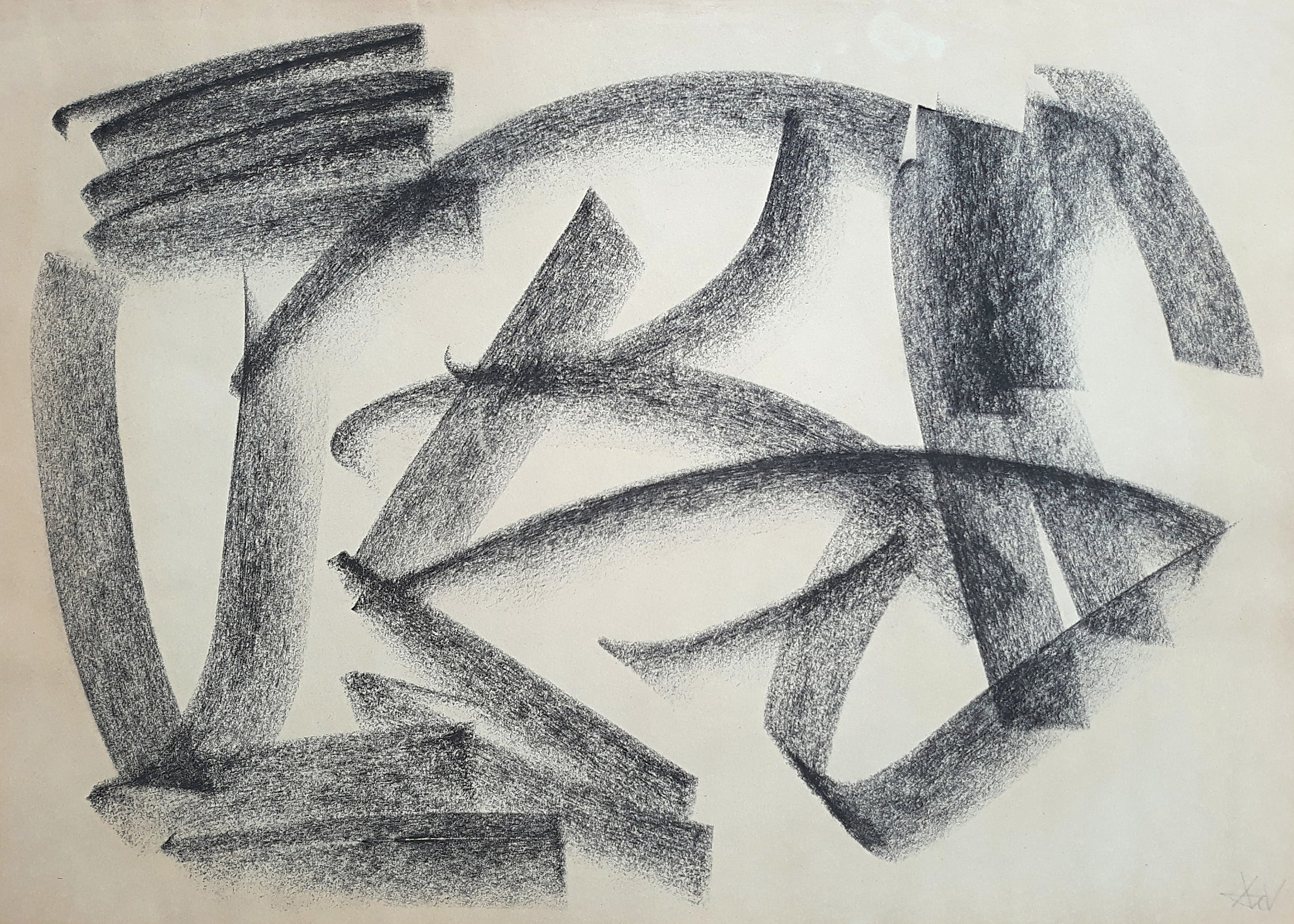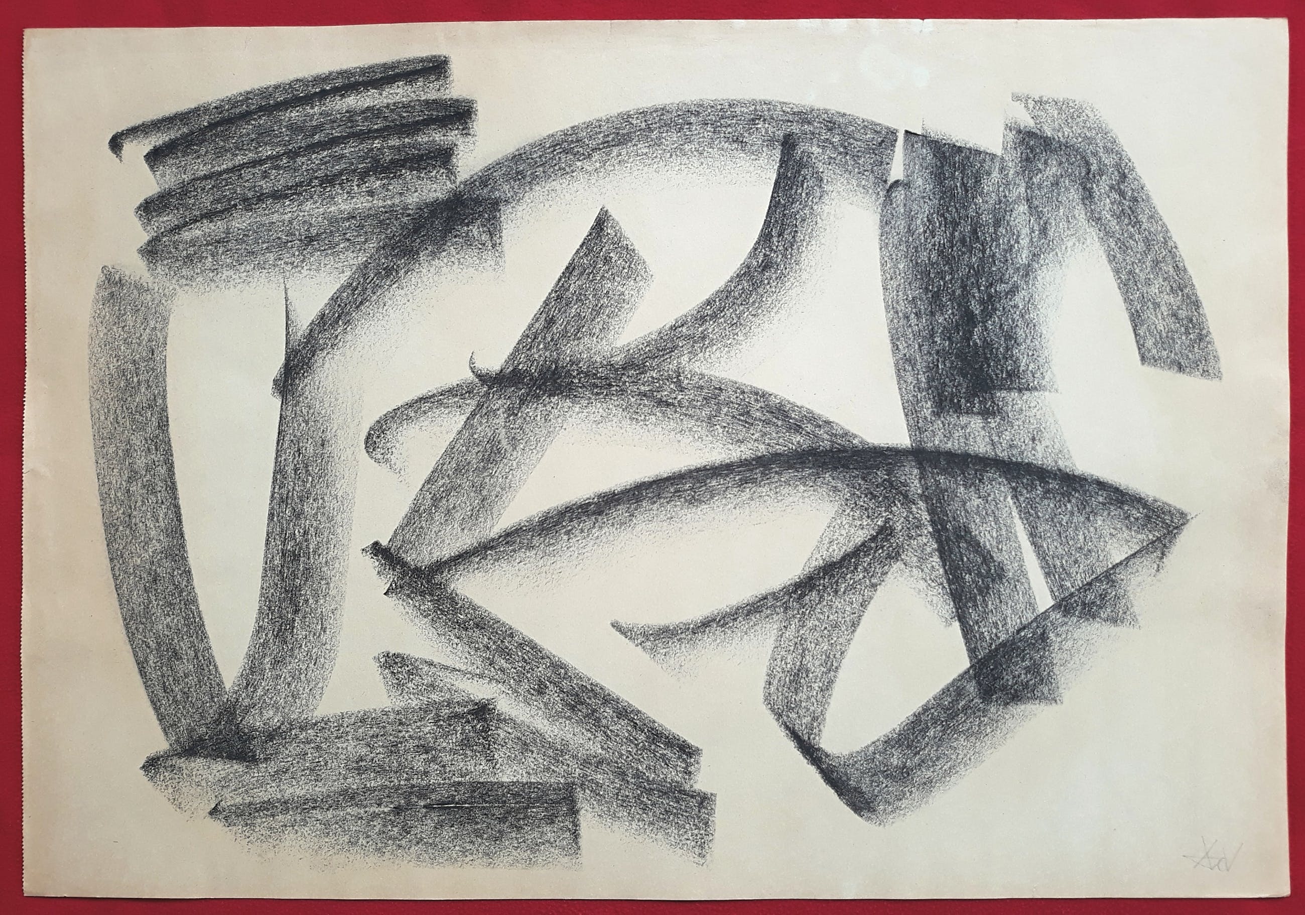 Krachtig, monochroom werk van Andre van der Vossen. Tekening met pastelkrijt op lichtbruin papier, met potlood gemonogrammeerd. In goede conditie; wat verkleuringen langs, en scheurtjes in, de randen van het blad. Ingelijst met passe-partout is het werk goed toonbaar.