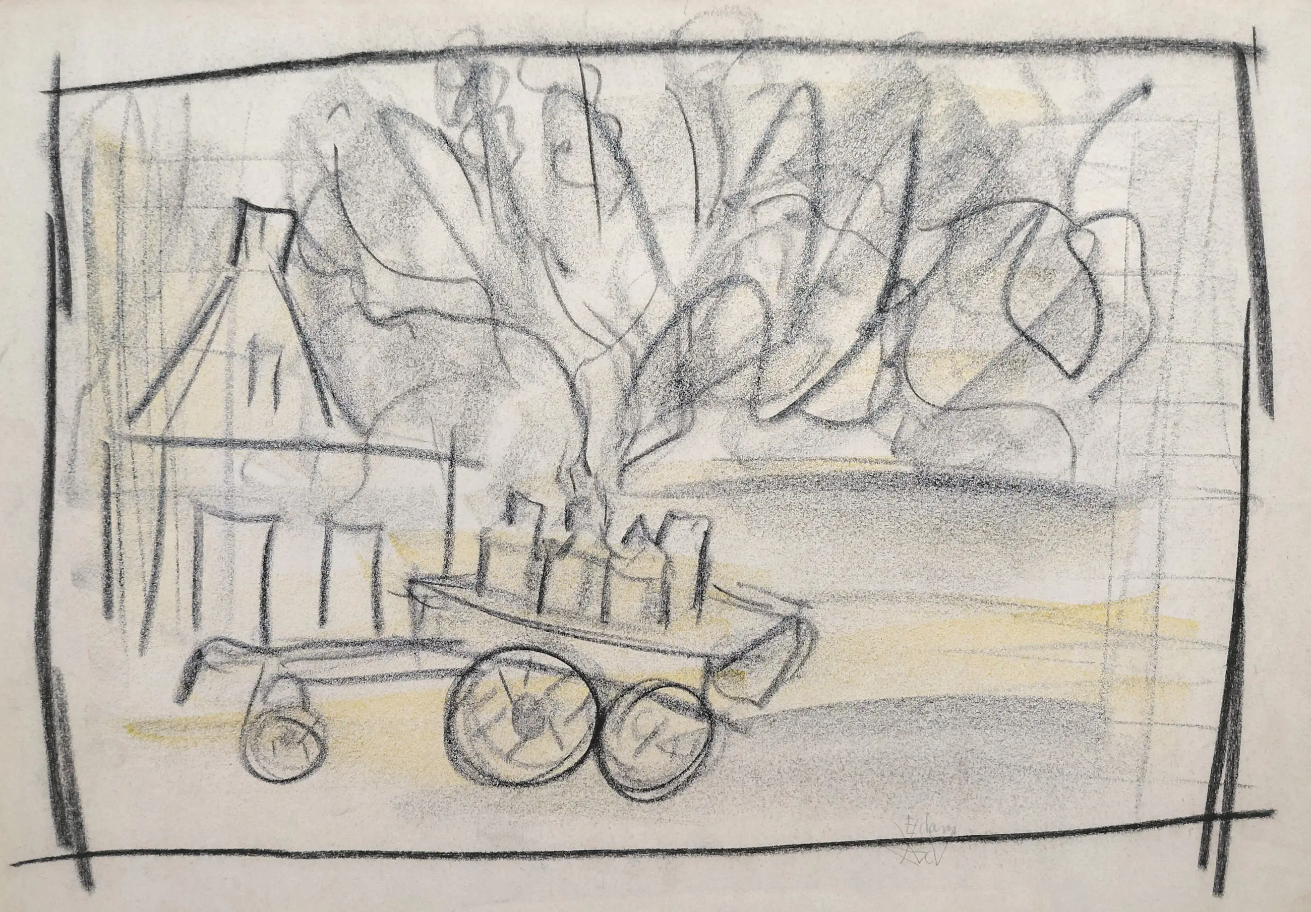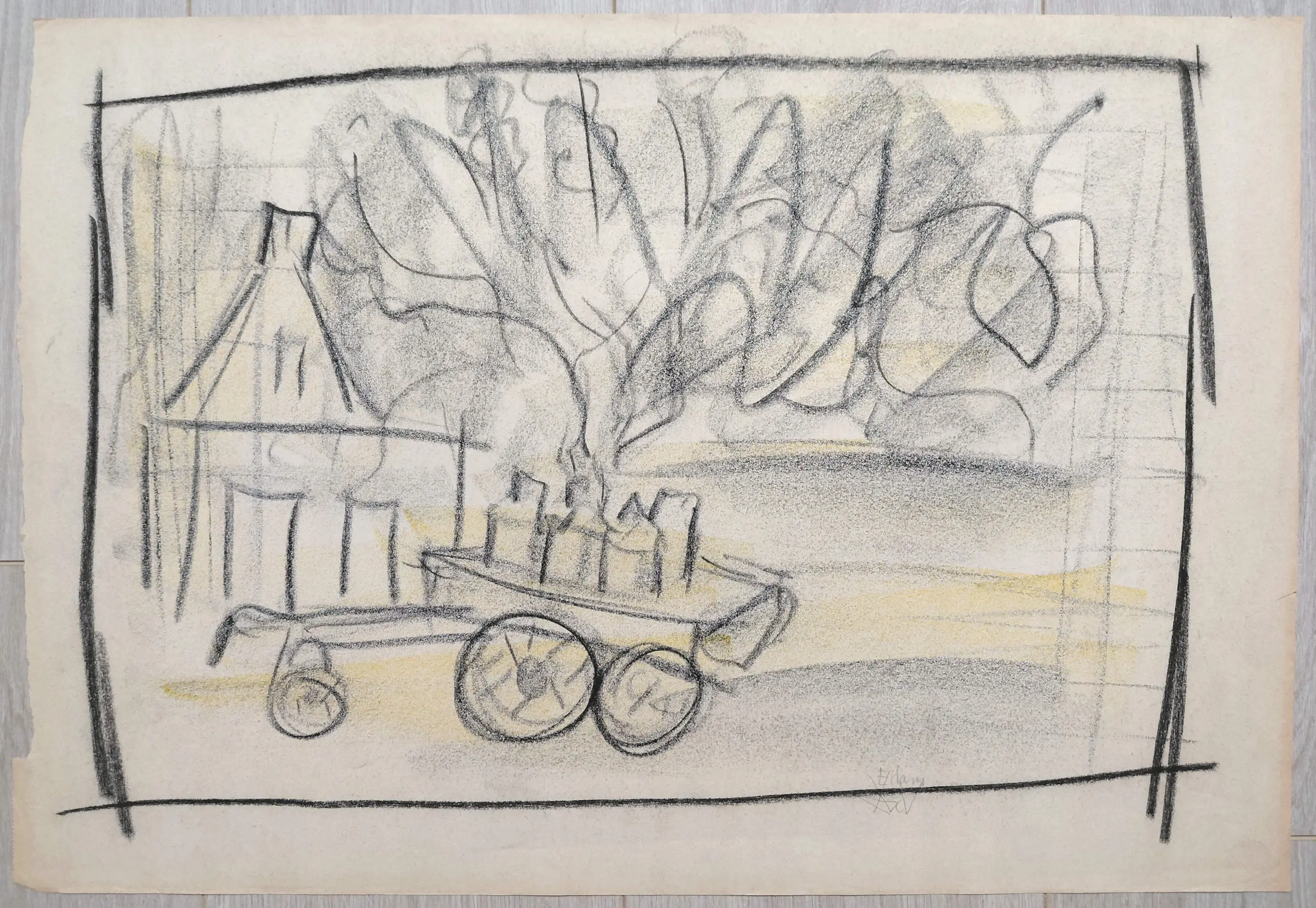 Vlotte tekening van Andre van der Vossen. Pastelkrijt tekening op papier, rechtsonder met potlood gemonogrammeerd en gesitueerd. In goede conditie.