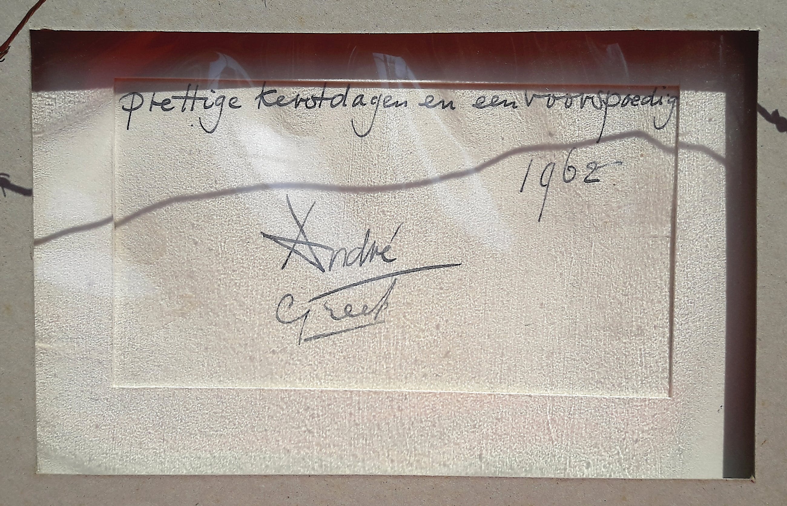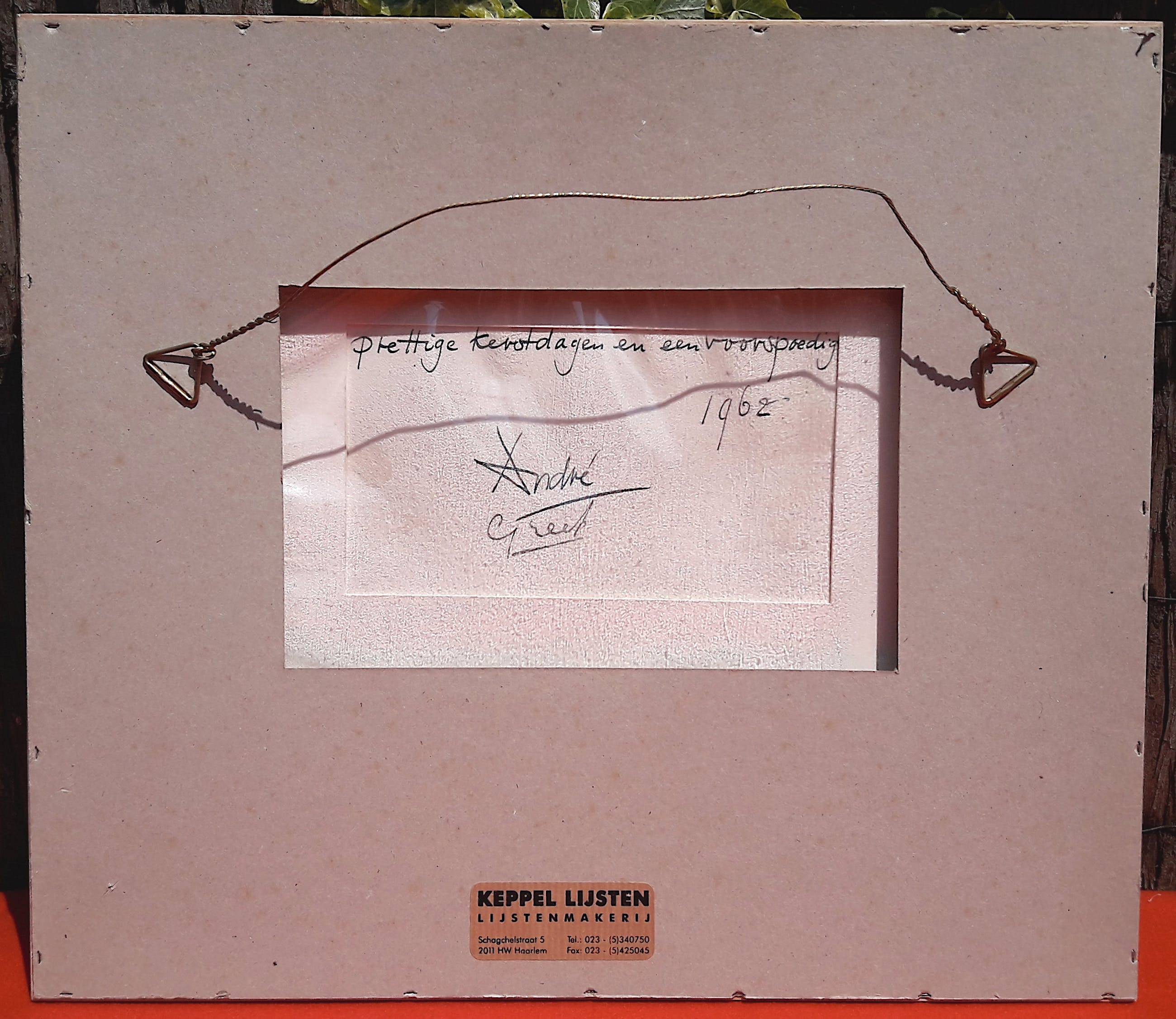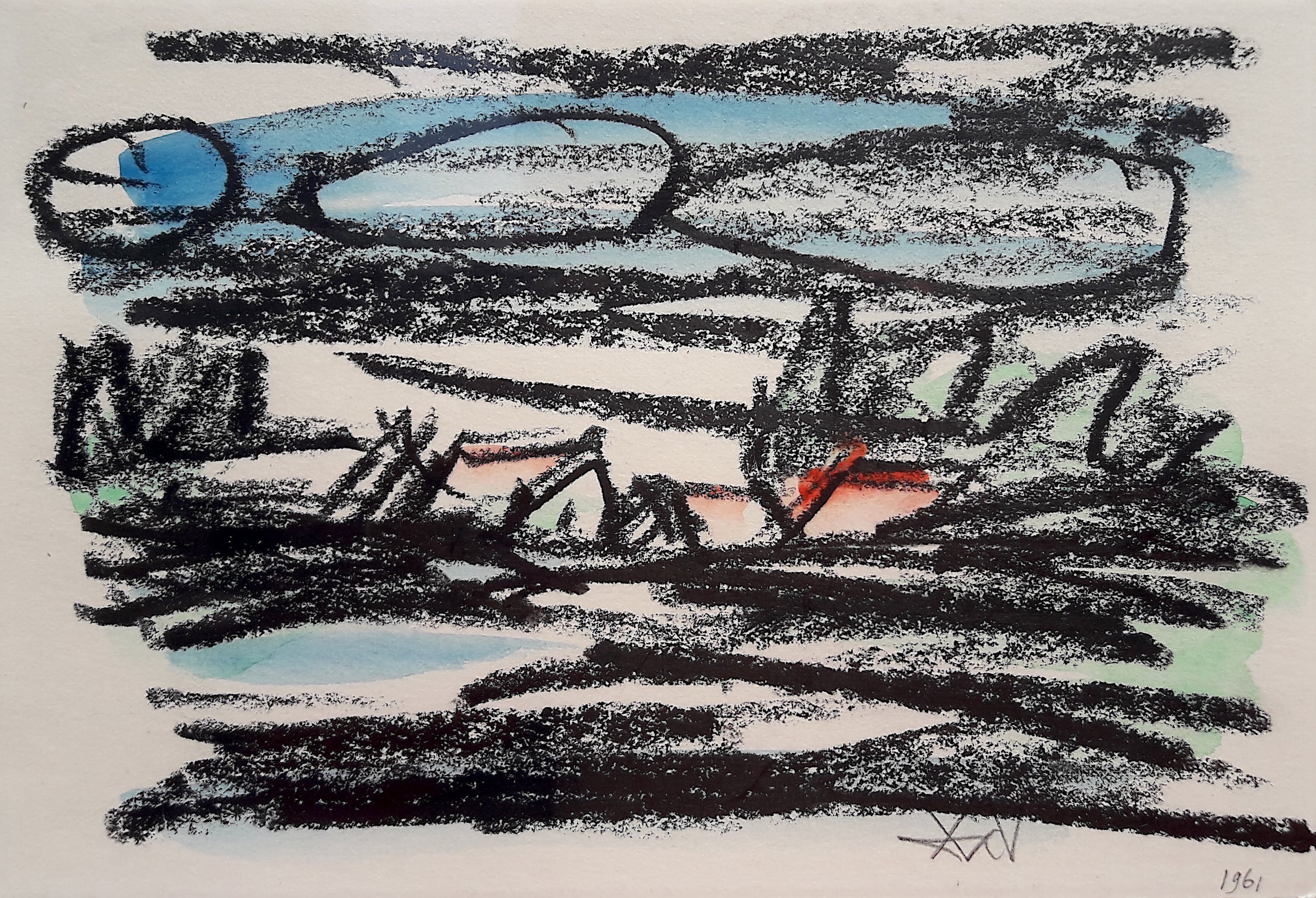 Vlot landschapje door Andre van der Vossen. Tekening met pastelkrijt (gedeeltelijk ingekleurd) op papier, met potlood gemonogrammeerd en gedateerd (1961), in verso nogmaals gesigneerd (“André”), ook door “Greet” en met opdracht (“Prettige Kerstdagen en een voorspoedig 1962”). In nette houten lijst, achter glas en met smetteloos, zuurvrij passe-partout. In zeer goede conditie.