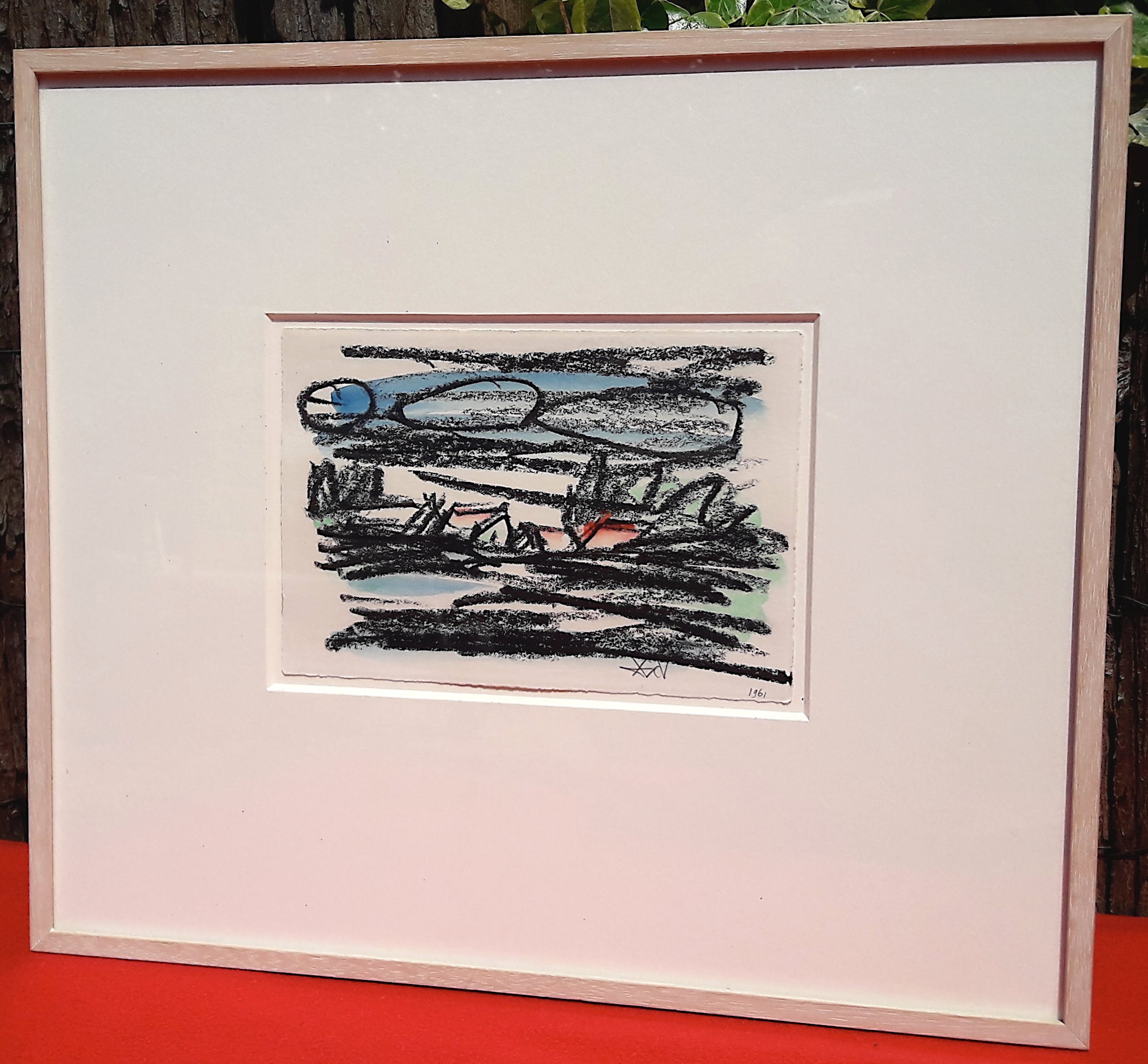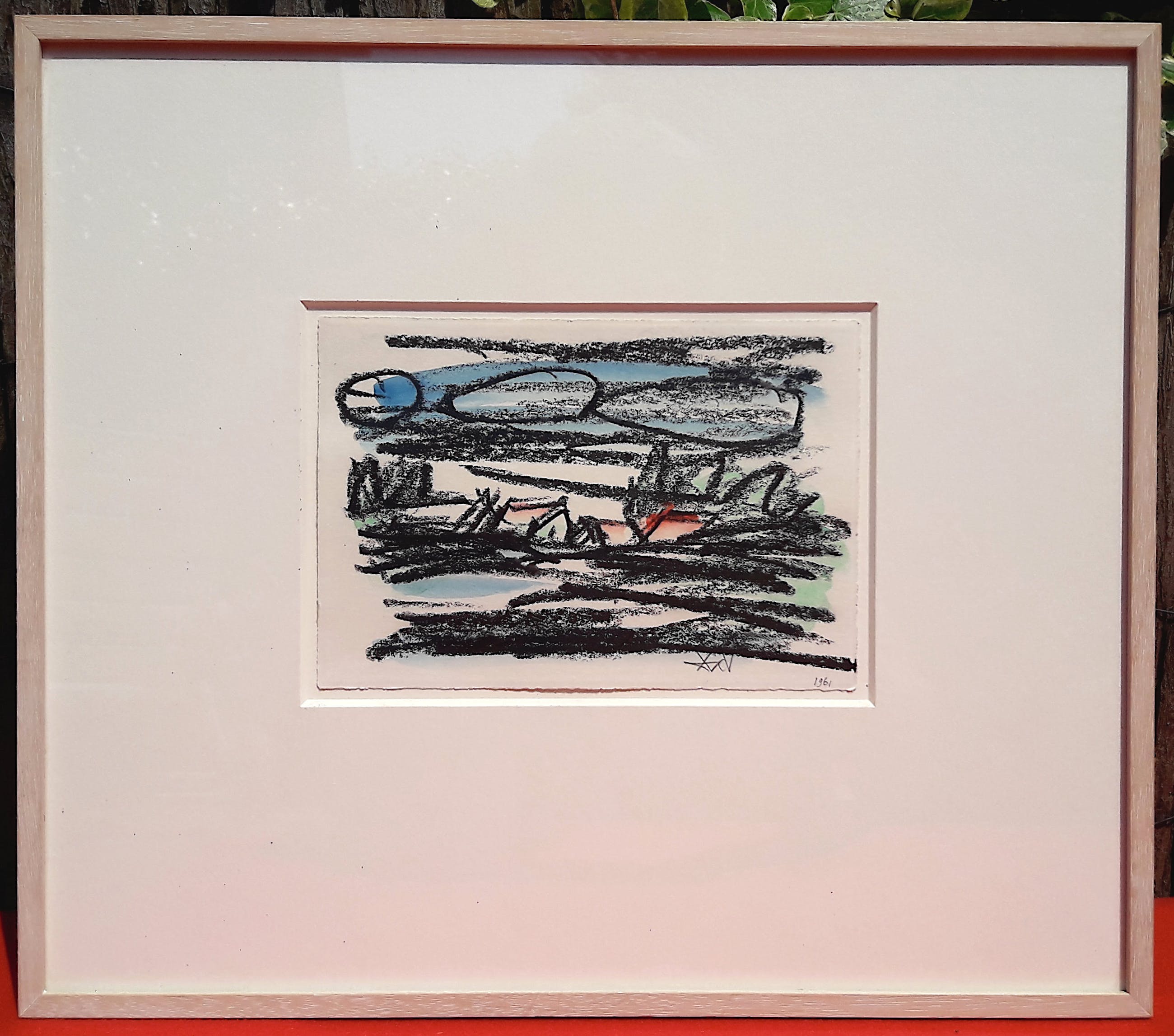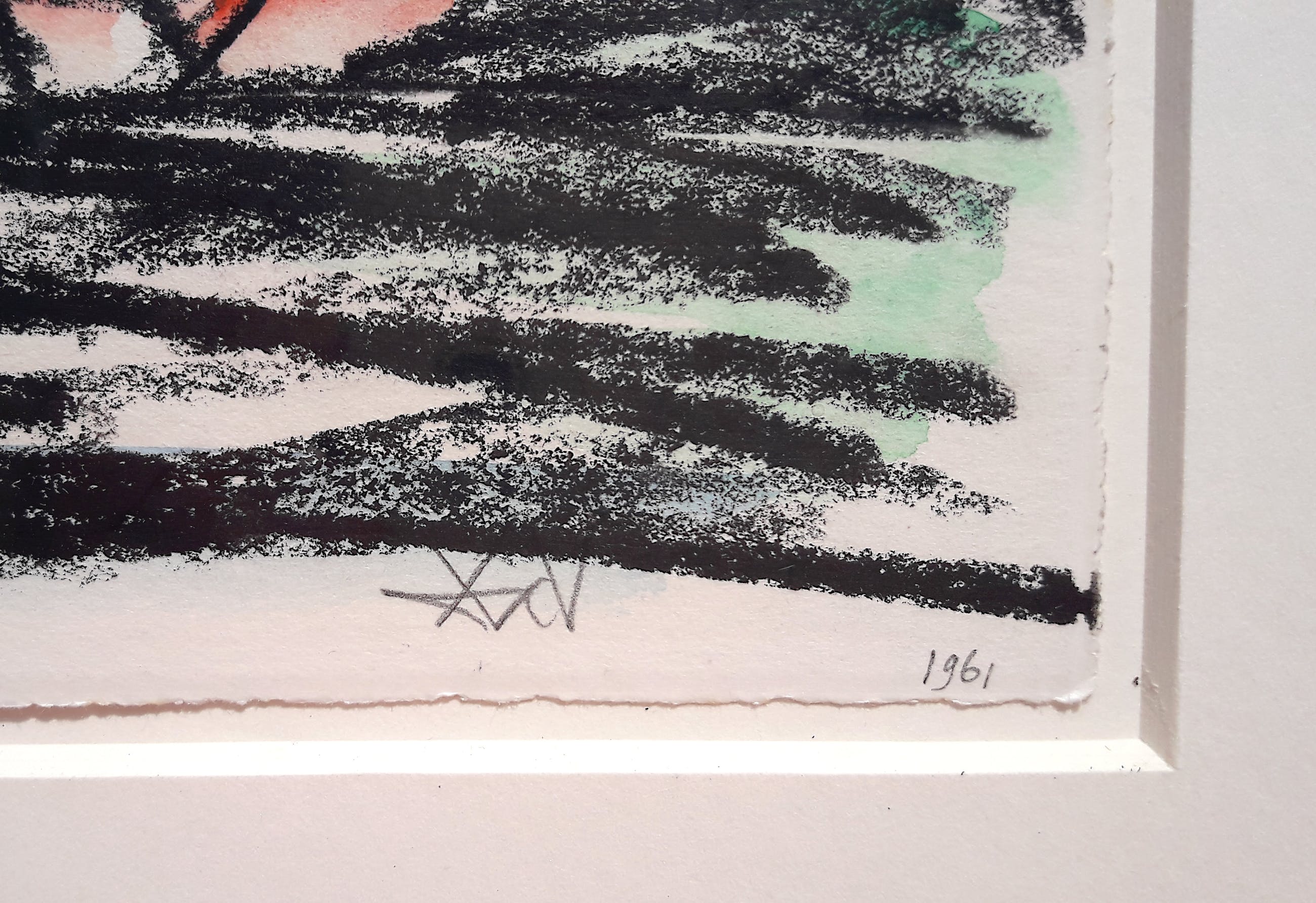 Vlot landschapje door Andre van der Vossen. Tekening met pastelkrijt (gedeeltelijk ingekleurd) op papier, met potlood gemonogrammeerd en gedateerd (1961), in verso nogmaals gesigneerd (“André”), ook door “Greet” en met opdracht (“Prettige Kerstdagen en een voorspoedig 1962”). In nette houten lijst, achter glas en met smetteloos, zuurvrij passe-partout. In zeer goede conditie.