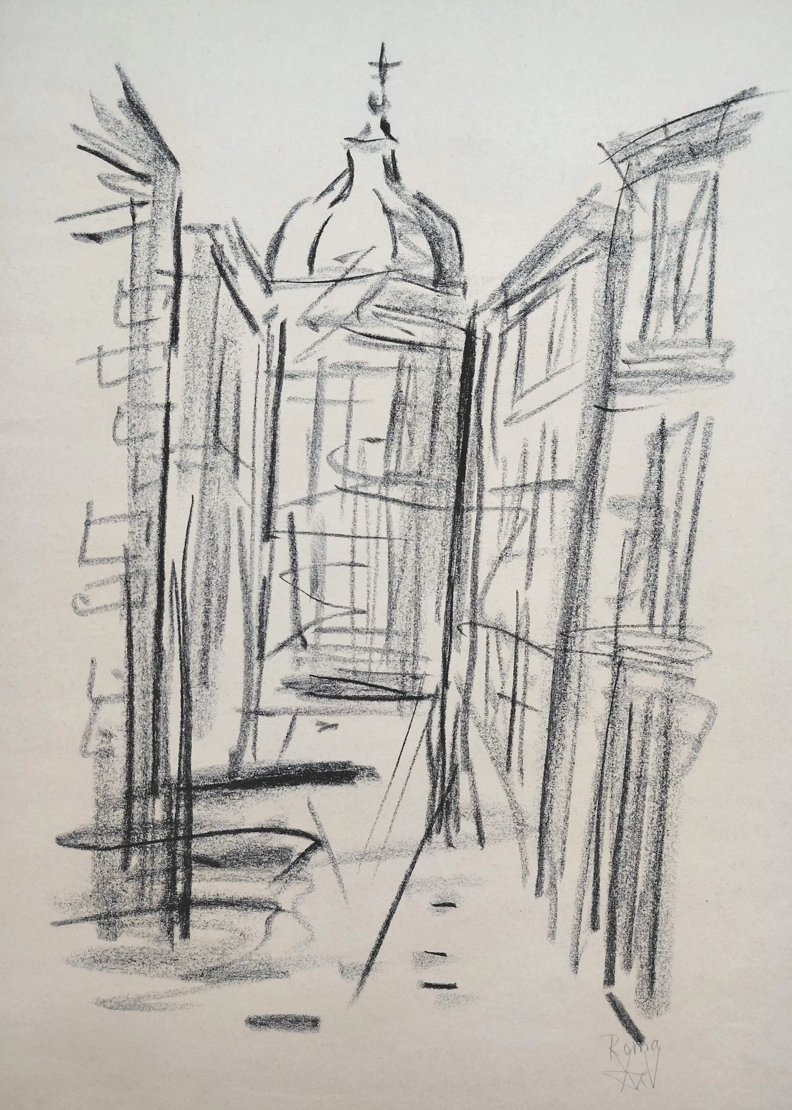 Vlotte tekening van Andre van der Vossen. Pastelkrijt tekening op papier, rechtsonder met potlood gemonogrammeerd en gesitueerd. In zeer goede staat.