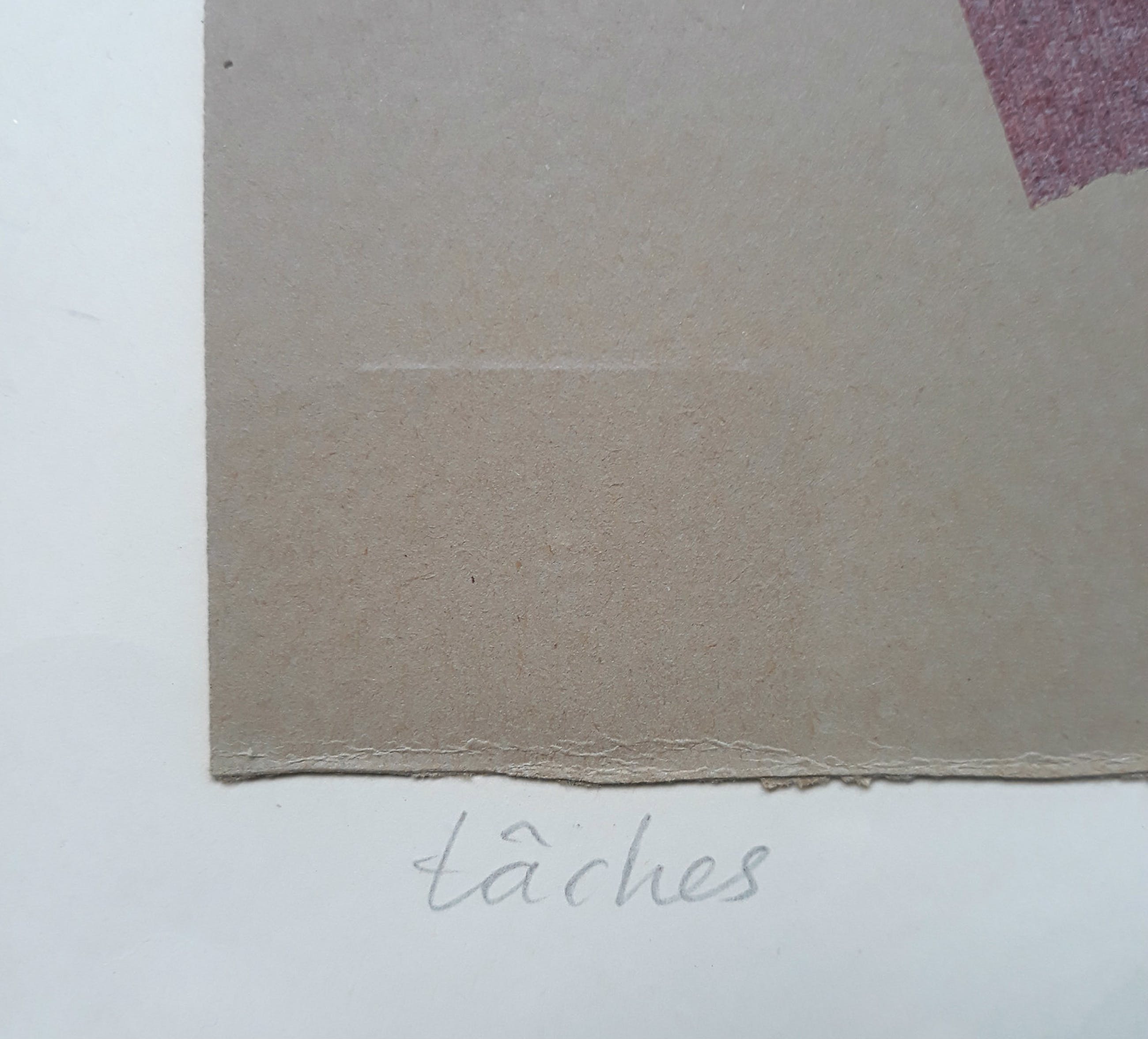 Blad met collage is zeer goed maar het passe-partout is oud, niet mooi en moet, mijns inziens, vervangen worden. Collage is gelukkig ruim ingelijst; het blad is overal meer dan 26mm van passe-partout rand verwijderd, onderaan zelfs 37 mm. | |