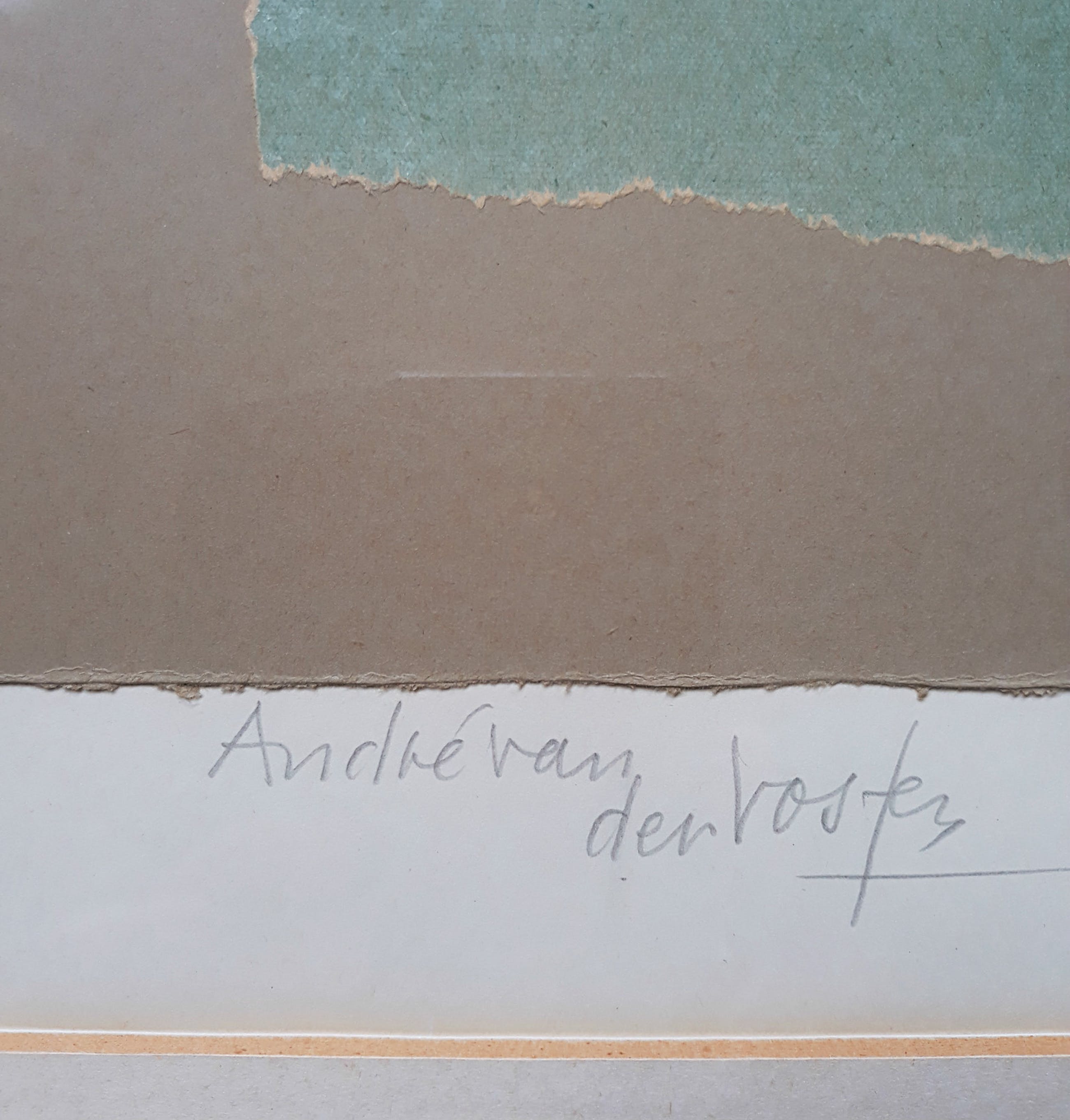 Mooi, krachtig werk van Andre van der Vossen. Collage van papier op papier, met potlood gesigneerd en getiteld. In strakke metalen lijst, achter glas en met passe-partout. In goede conditie; blad met collage is zeer goed maar het passe-partout is oud, niet mooi en moet, mijns inziens, vervangen worden. Collage is gelukkig ruim ingelijst; het blad is overal meer dan 26mm van passe-partout rand verwijderd, onderaan zelfs 37 mm.