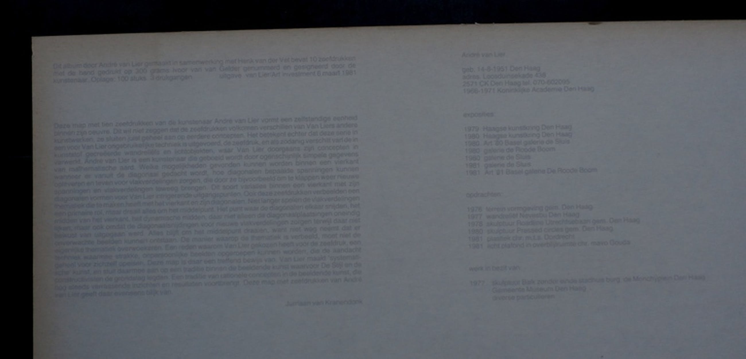 Map met 10 abstracte litho's van Andre van Lier uit 1981. De werken zijn, met potlood, rechtsonder gesigneerd door de kunstenaar. Afmetingen blad: H50 x b50 cm. Afmetingen voorstelling: h40 x b40 cm. Deze werken zijn, zoals u kunt zien lastig te fotograferen. Op foto 5 kunt u goed zien wat de diverse voorstellingen zijn. De authenticiteit van dit werk wordt volledig gegarandeerd. Een certificaat van echtheid kan, op verzoek, worden meegeleverd.