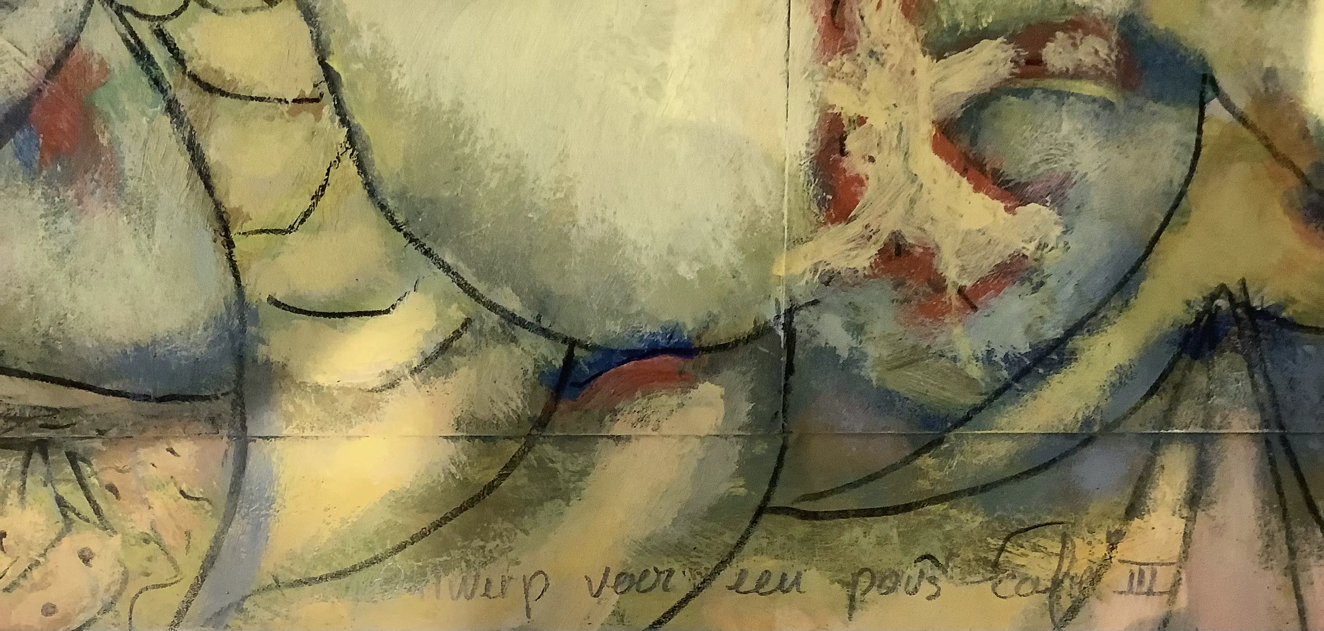 Mooi groot werk van Andre Vereecken Kleuren zijn nog mooier in het daglicht, Werk is uit zijn kader gehaald voor verzending. Getekend Vereecken Titel : ontwerp voor een poes cafe André Vereecken was een Vlaams beeldend kunstenaar, geboren op 17 juni 1932 te Sint-Pauwels (België), die een atelier en een galerie had te Sint-Niklaas. Op 16-jarige leeftijd volgde hij de opleiding "Kleine Sieraden" aan de academie voor Schone Kunsten te Sint-Niklaas, waar hij afstudeerde en de eerste prijs won.