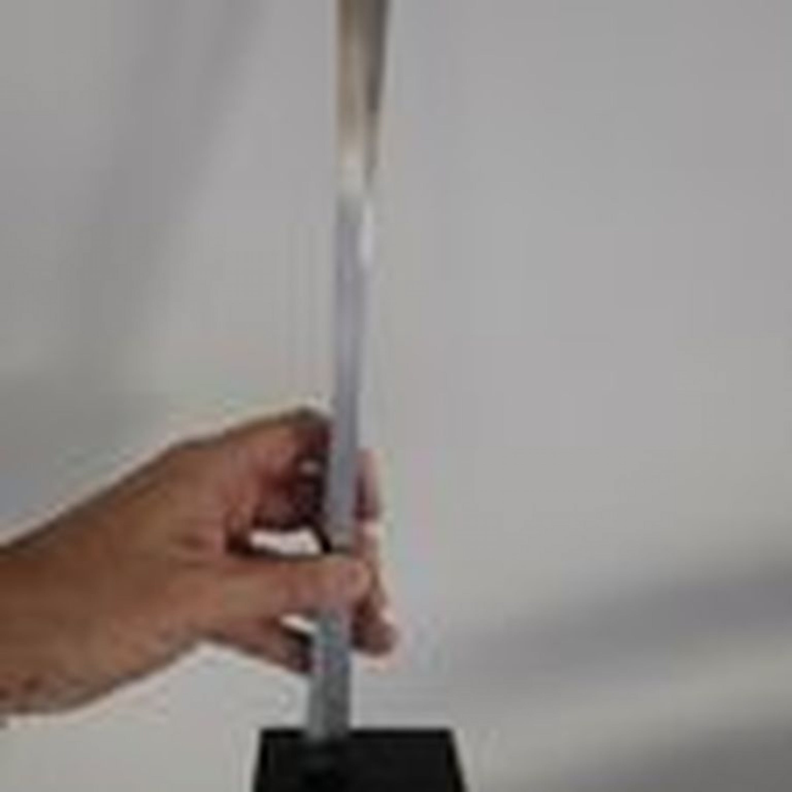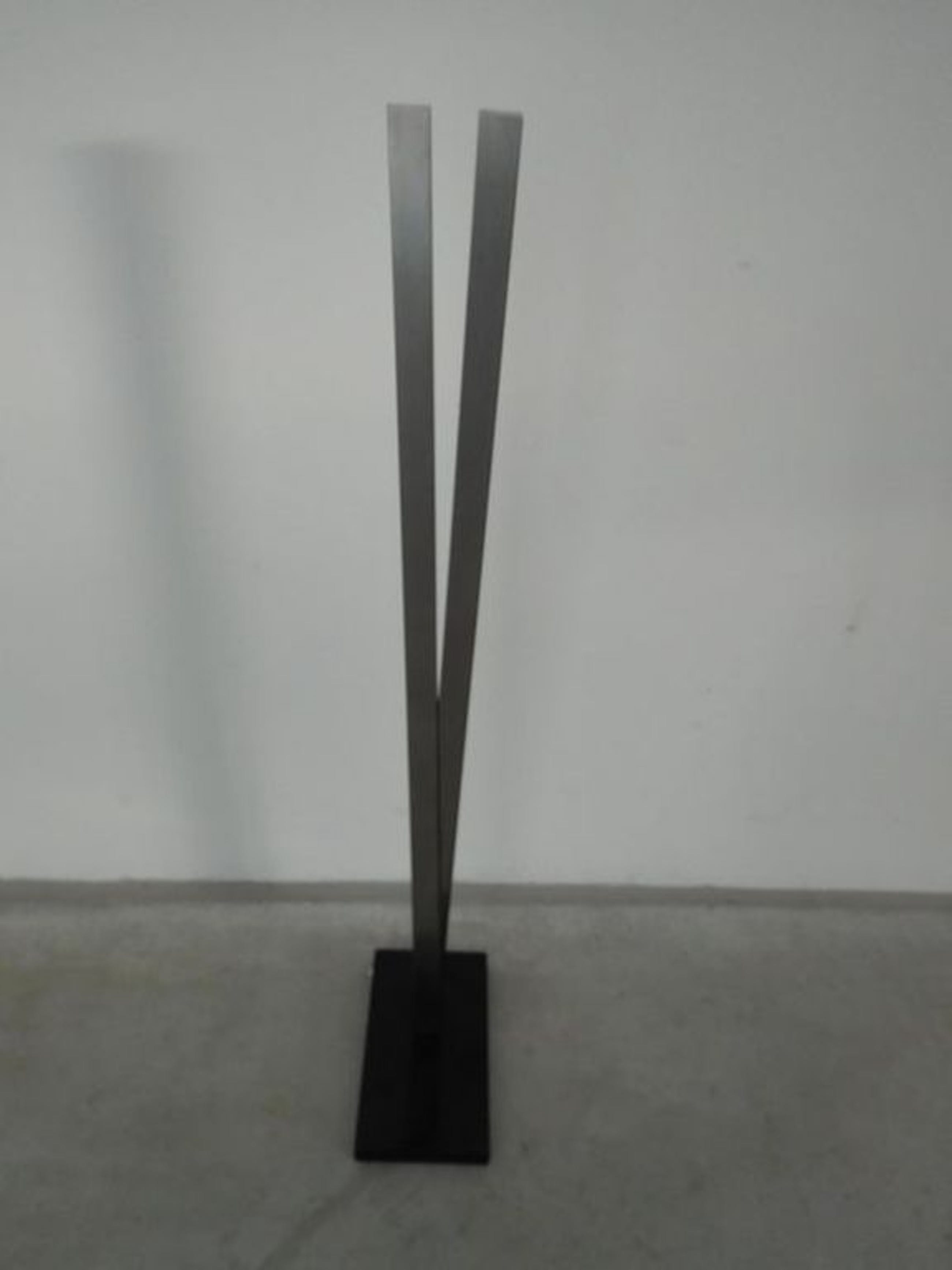 RVS stalen object "de Hemel" op gezwart stalen voet, ontwerp & uitvoering André Volten (1925 - 2002), multiple object uitgevoerd in een gelimiteerde oplage van 300 stuks in 1986.