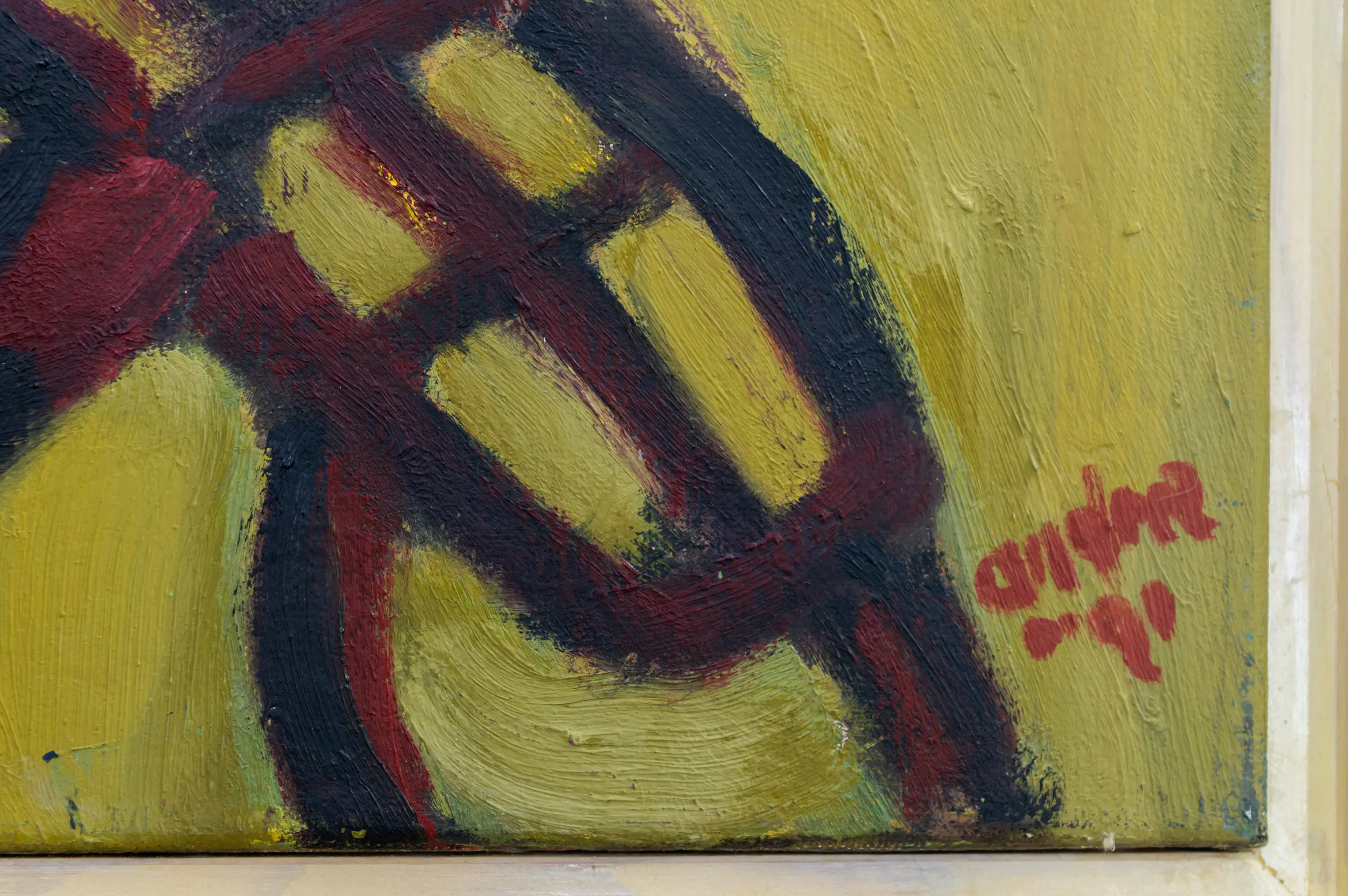 Het schilderij kan langs de randen wat gebruikssporen vertonen.Rechts onder is het schilderij gesigneerd en gedateerd. zie foto.