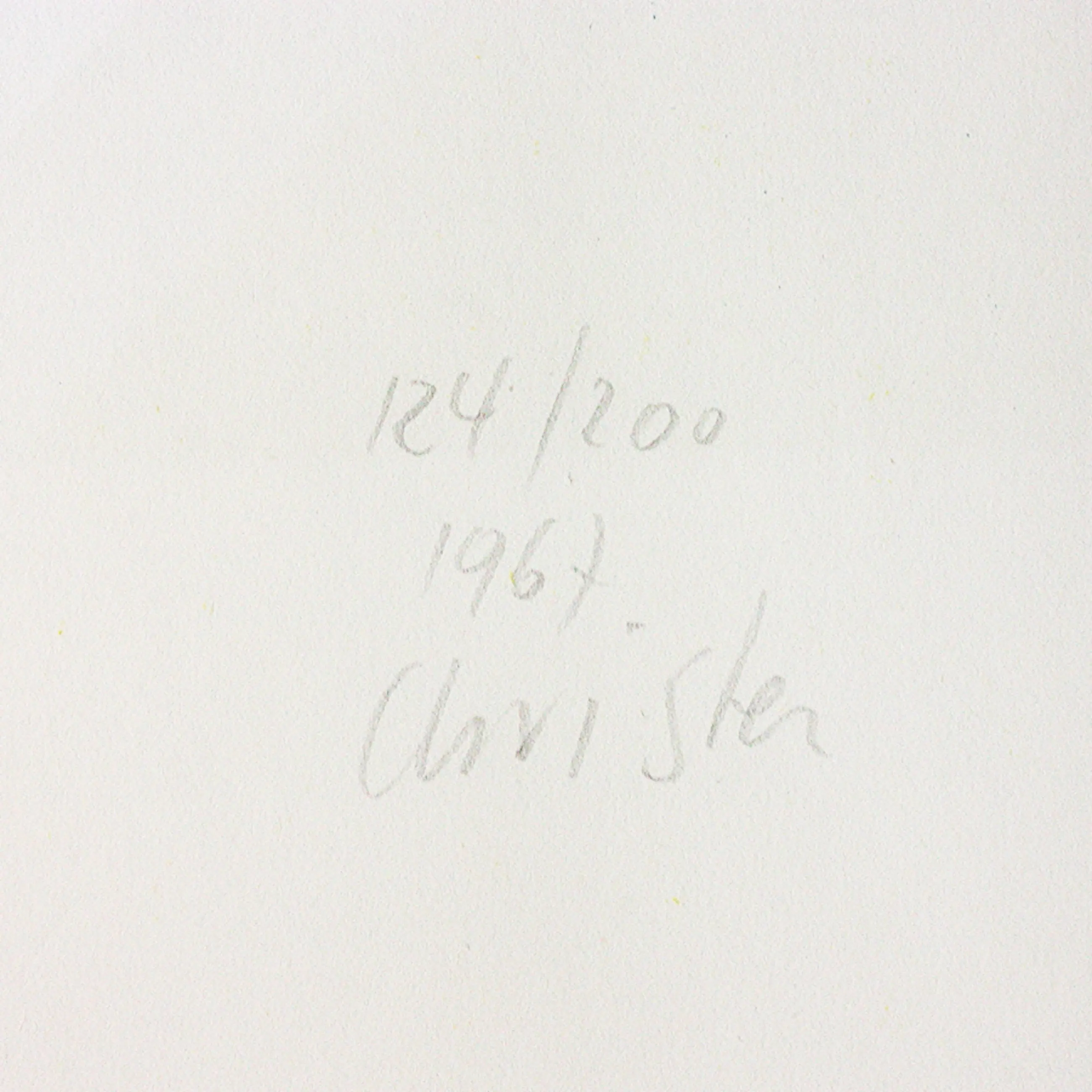 Originele kleurenzeefdruk van de Zwitserse kunstenaar en productontwerper Andreas Christen. Handgesigneerd, genummerd en gedateerd "1967" in potlood door de kunstenaar (in verso); oplage van 200.