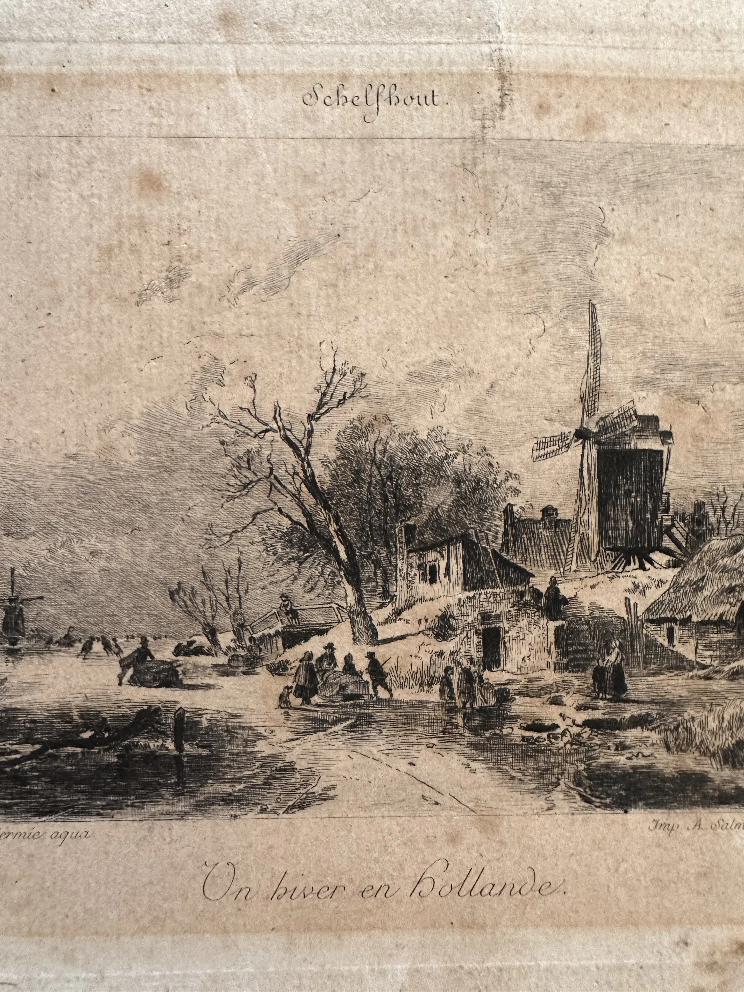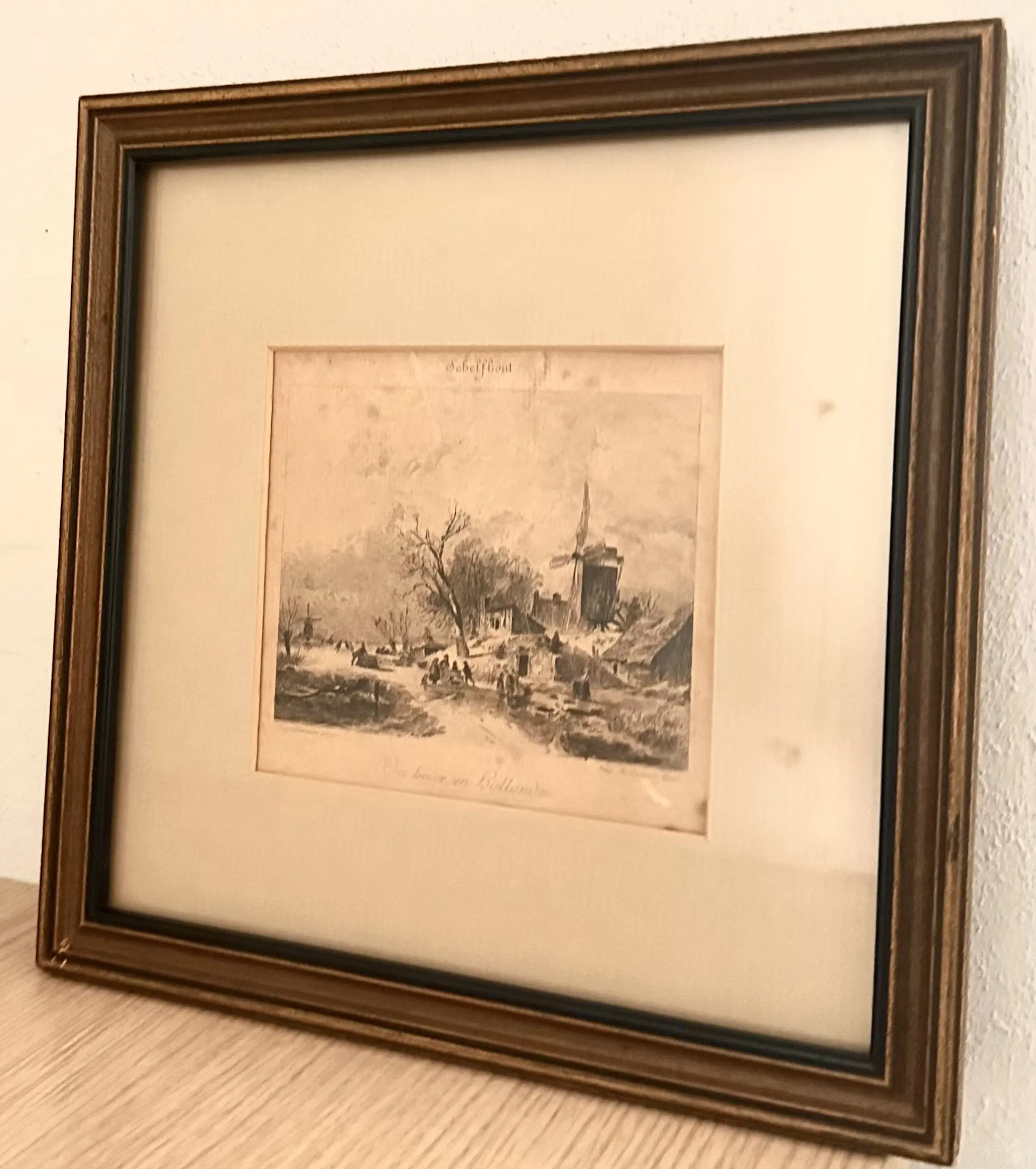 Oude tekening van Schelfhout. Potlood en inkt. Hollands tafereeltje met molen. Lijst moet opnieuw vastgemaakt worden maar is verder intact.
