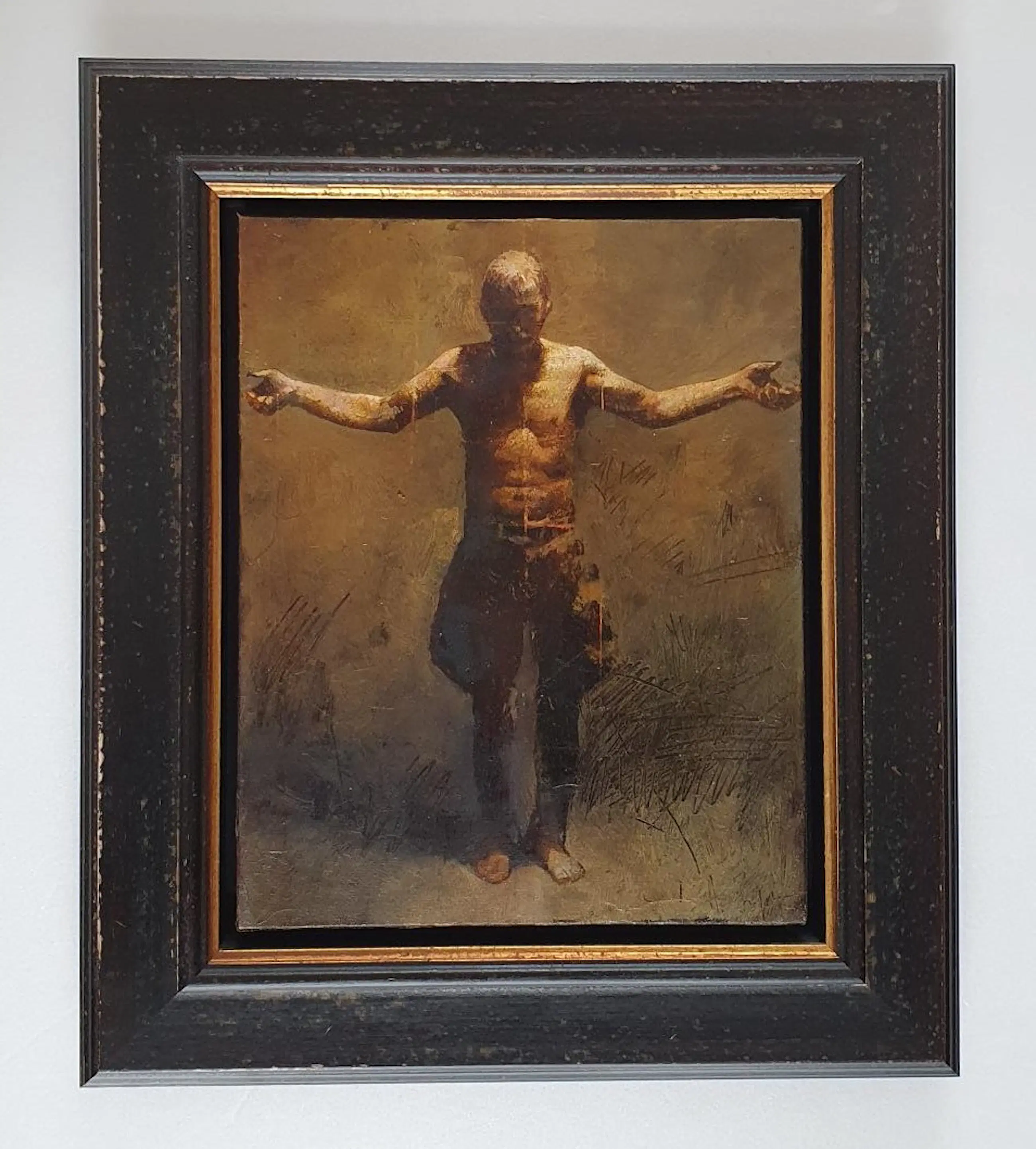 Andrej Zadorine woont alweer vele jaren in Nederland, maar het oude, Wit-Russische platteland is nog steeds zijn emotionele achterland. Hij laat zich inspireren door foto’s van voorbije generaties en schept daarin zijn eigen wereld. Dit schilderijtje is er een prachtig voorbeeld van. Zwevend blok in een sfeervolle, oude lijst.