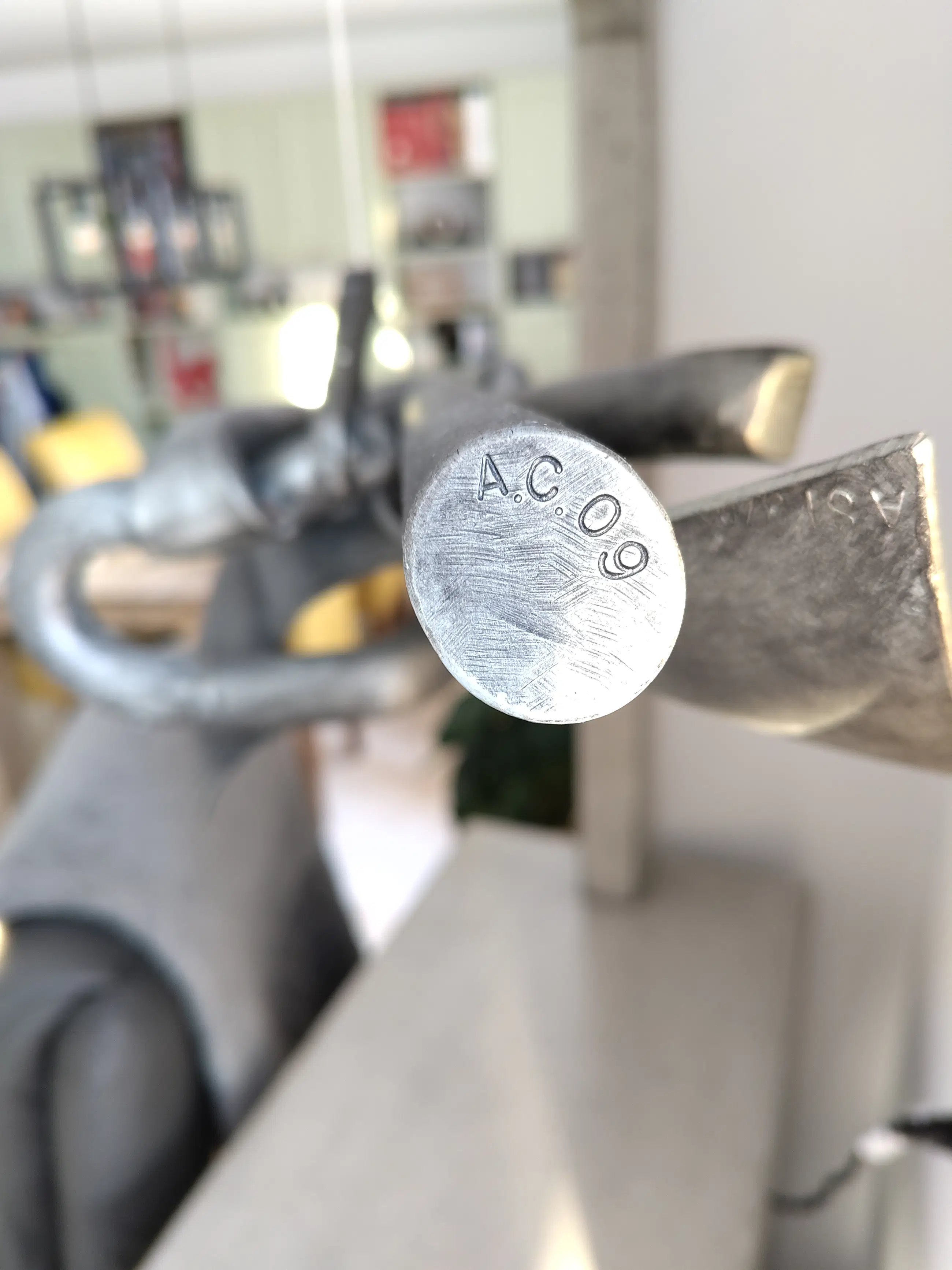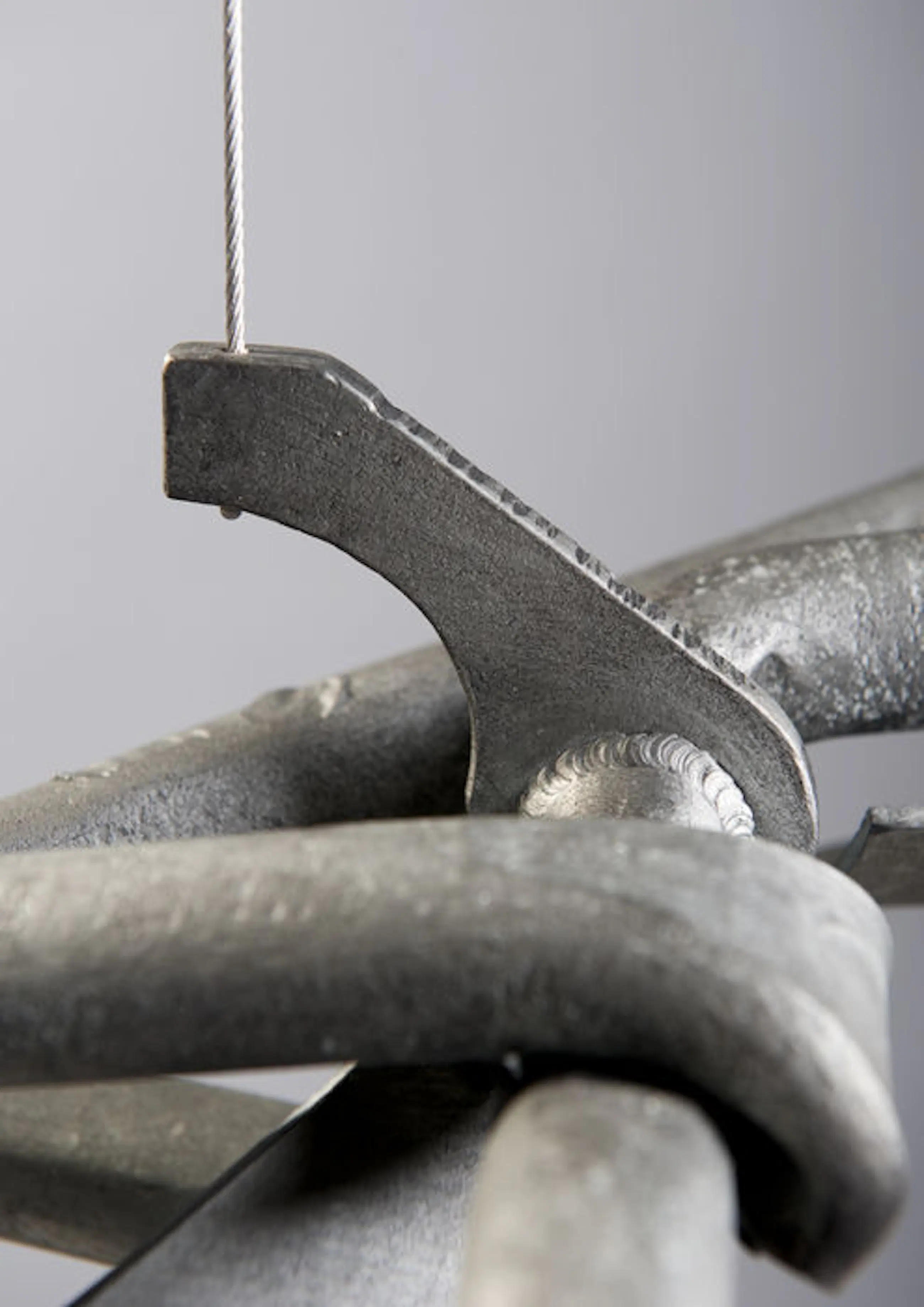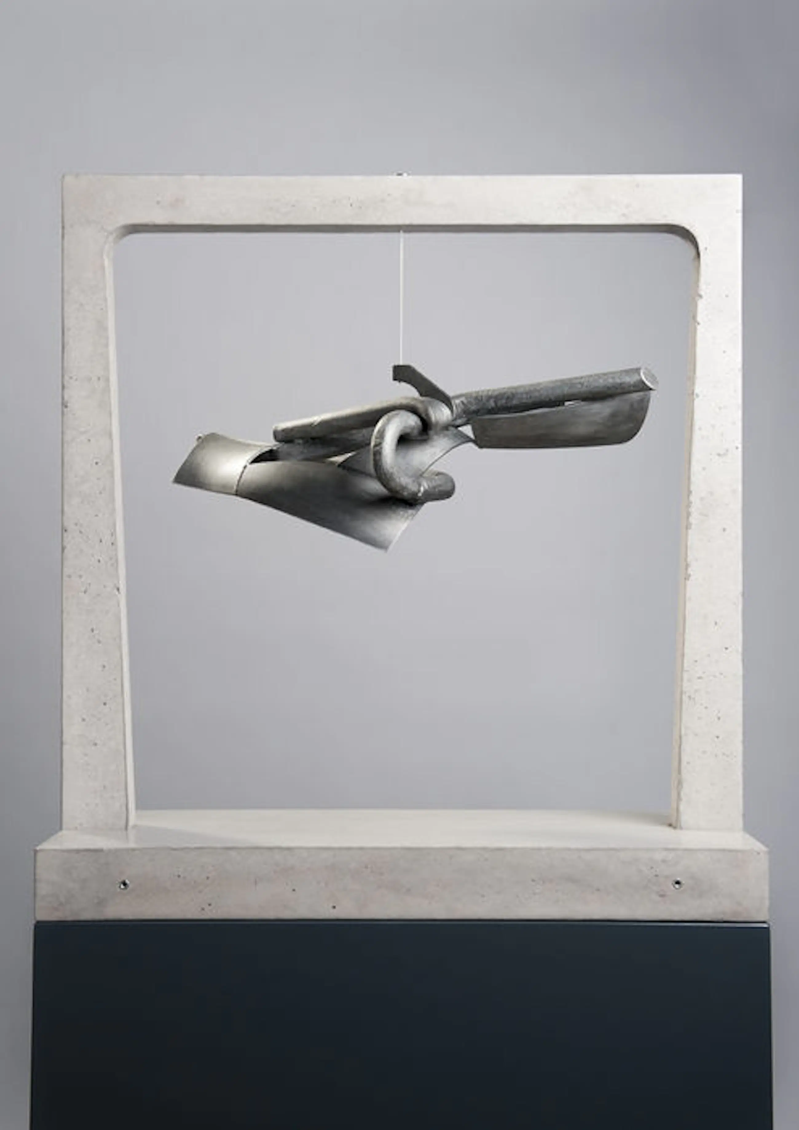 Uniek gegalvaniseerd stalen object met acryl beschermlaag, hangend aan rvs kabel in een gegoten betonnen boog constructie bestaande uit boog en voetplaat. Hoogte van het kunstwerk is 85 cm. Staande op gelakt hardhouten voetstuk van eveneens 85 cm hoog. Gesigneerd d.m.v. ingeslagen letters A.C. en jaartal 2009. Het voetstuk heeft in de loop der jaren enkele kleine beschadigingen opgelopen. Originele lak wordt in blik meegeleverd. Certificate of Authenticity aanwezig.