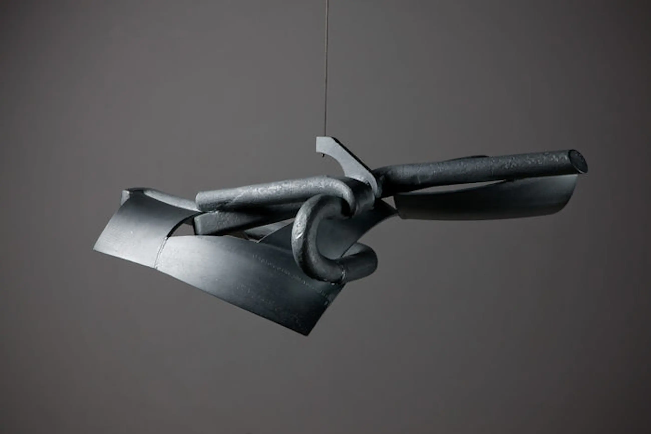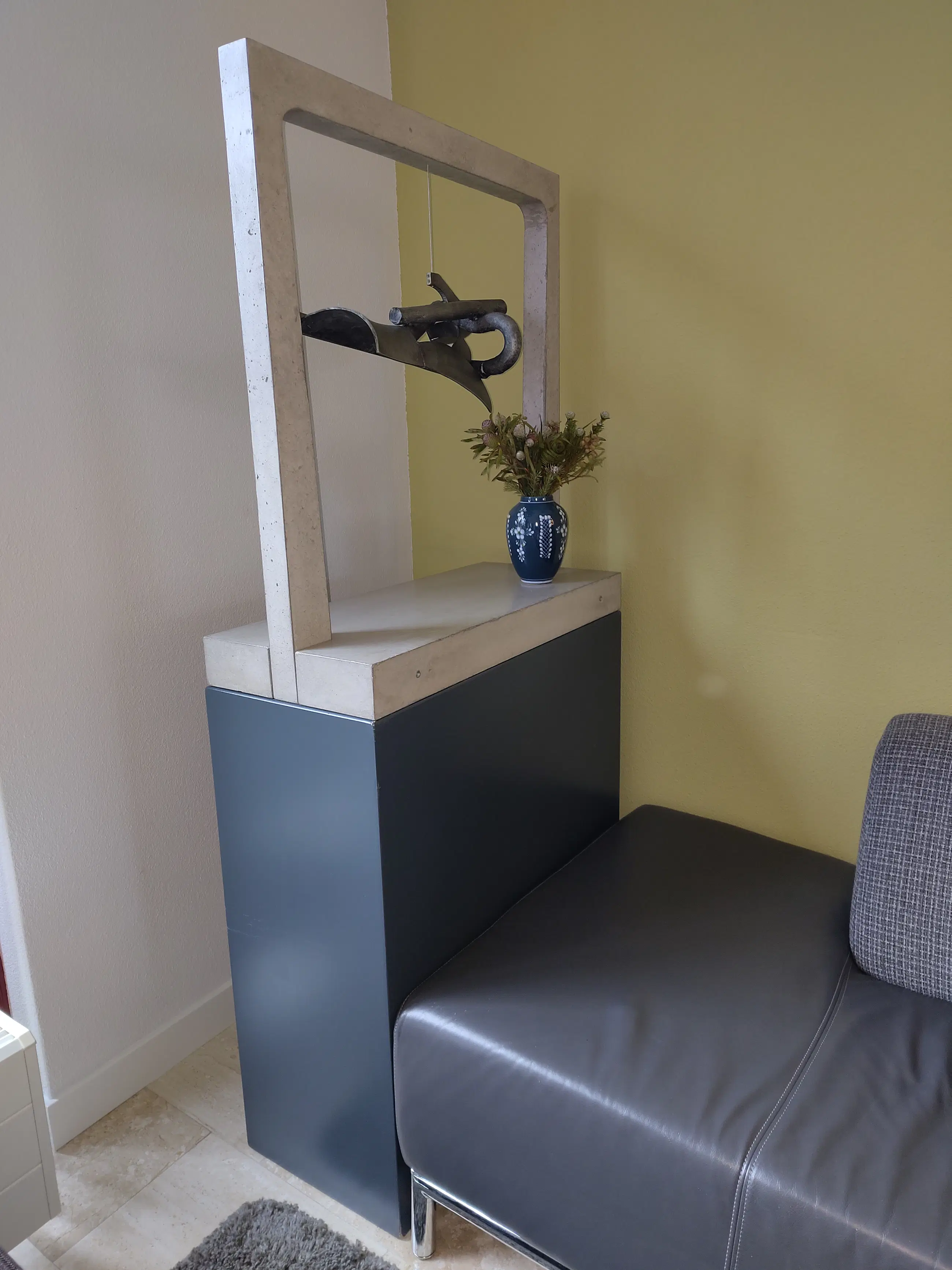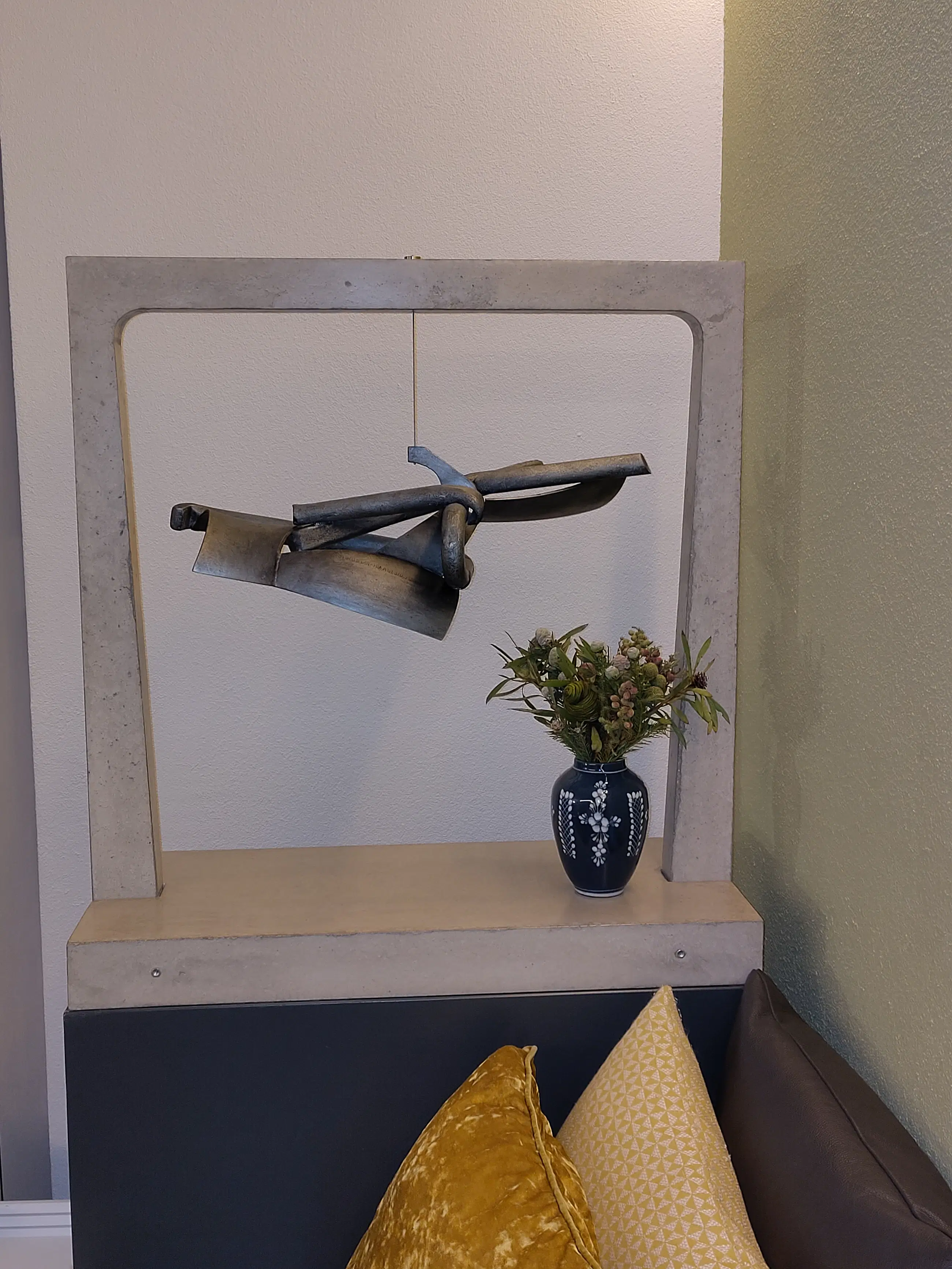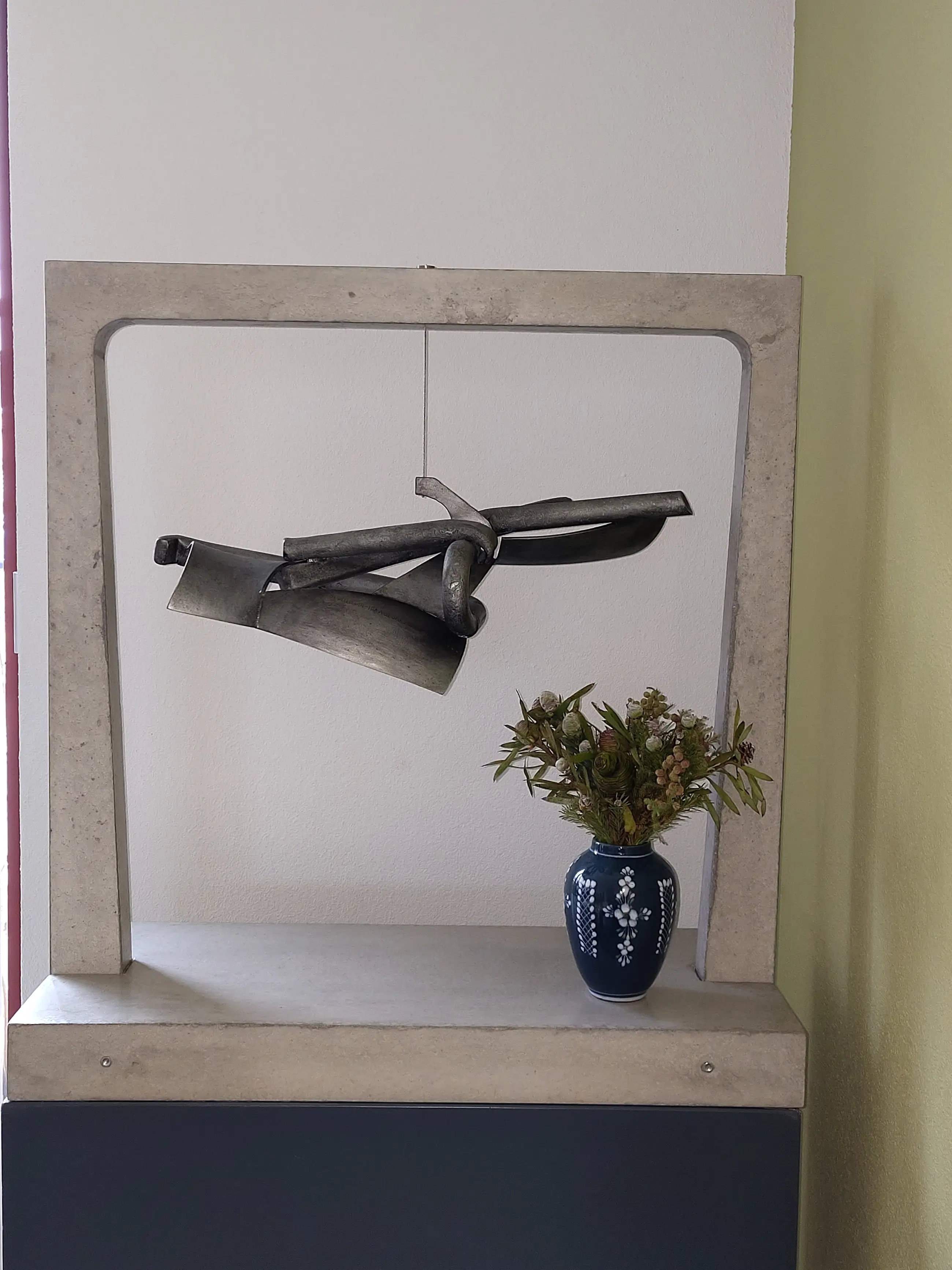 Uniek gegalvaniseerd stalen object met acryl beschermlaag, hangend aan rvs kabel in een gegoten betonnen boog constructie bestaande uit boog en voetplaat. Hoogte van het kunstwerk is 85 cm. Staande op gelakt hardhouten voetstuk van eveneens 85 cm hoog. Gesigneerd d.m.v. ingeslagen letters A.C. en jaartal 2009. Het voetstuk heeft in de loop der jaren enkele kleine beschadigingen opgelopen. Originele lak wordt in blik meegeleverd. Certificate of Authenticity aanwezig.