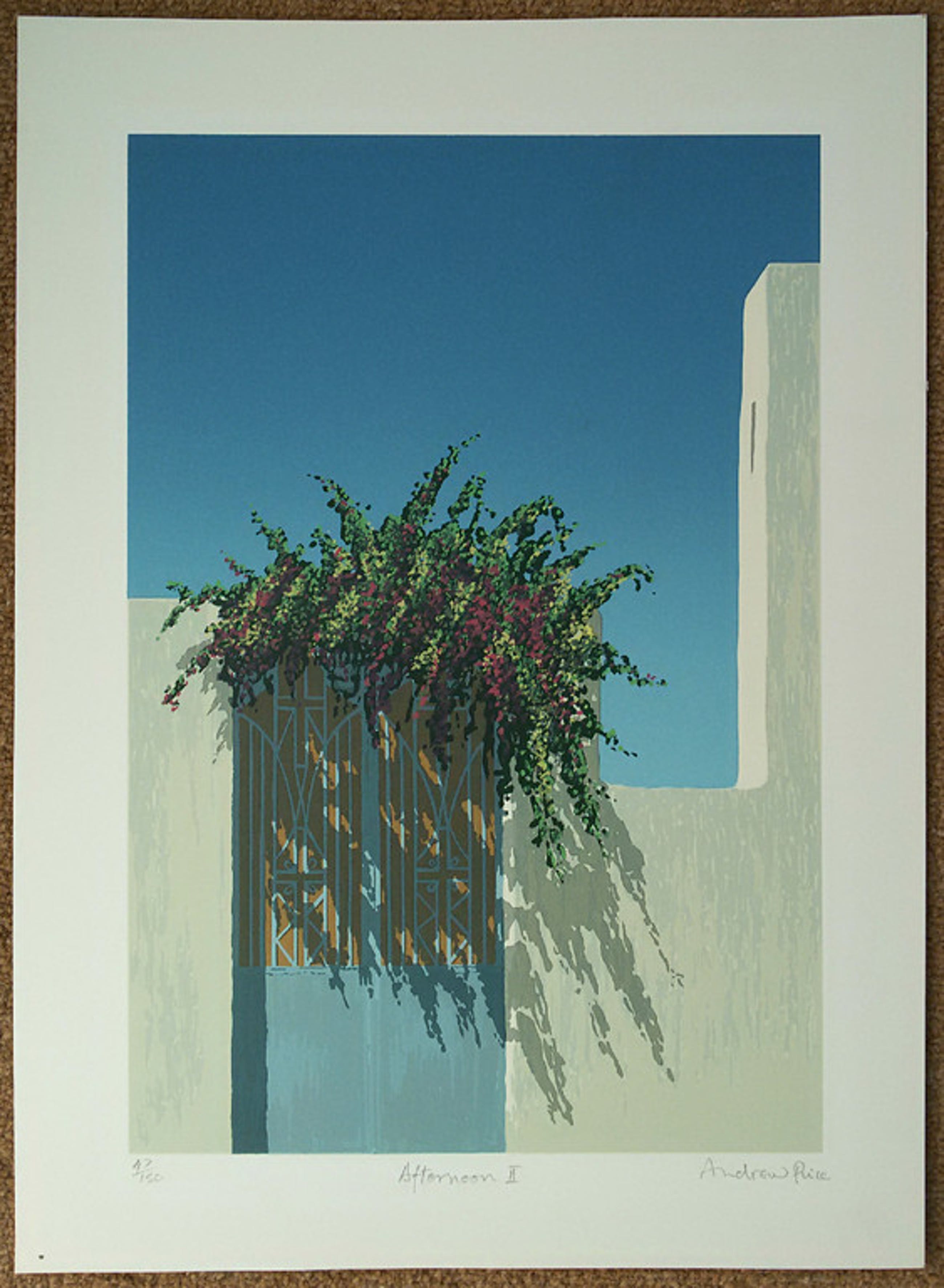 Mooie zeefdruk van Andrew Rice op zeer dik, glad papier. Met potlood gesigneerd, getiteld en genummerd (47/150). Afkomstig uit de kunstcollectie van ABNAMRO; in uitstekende conditie.