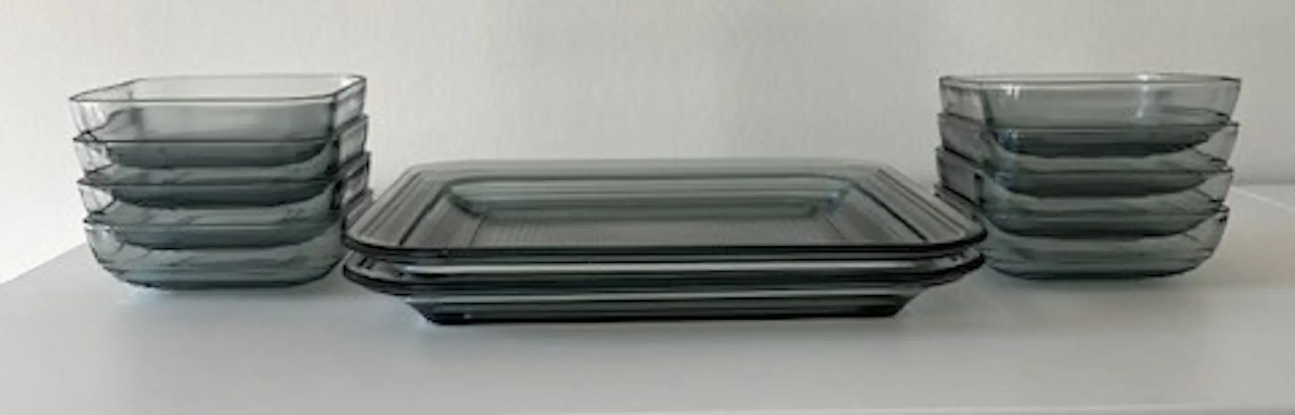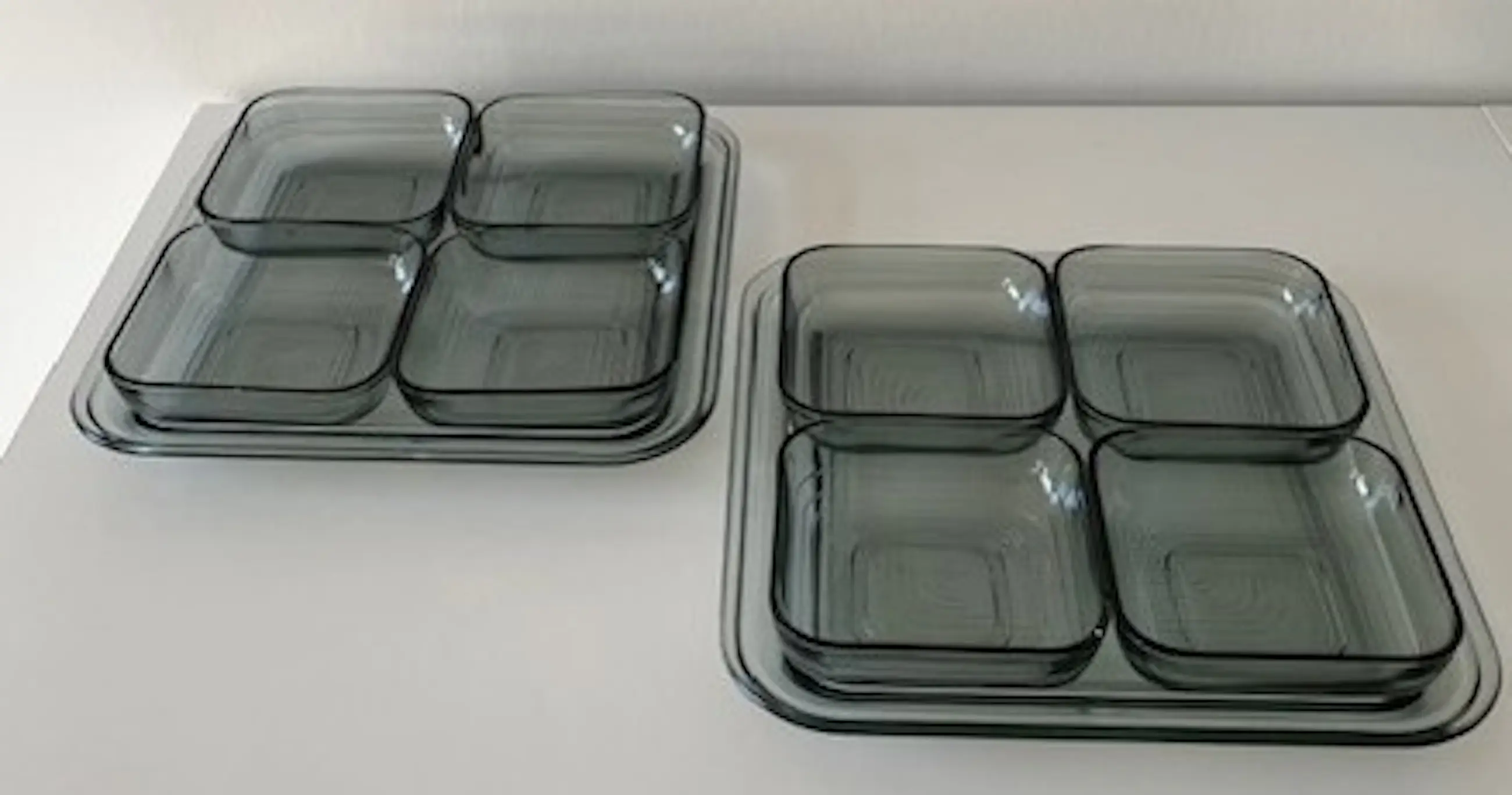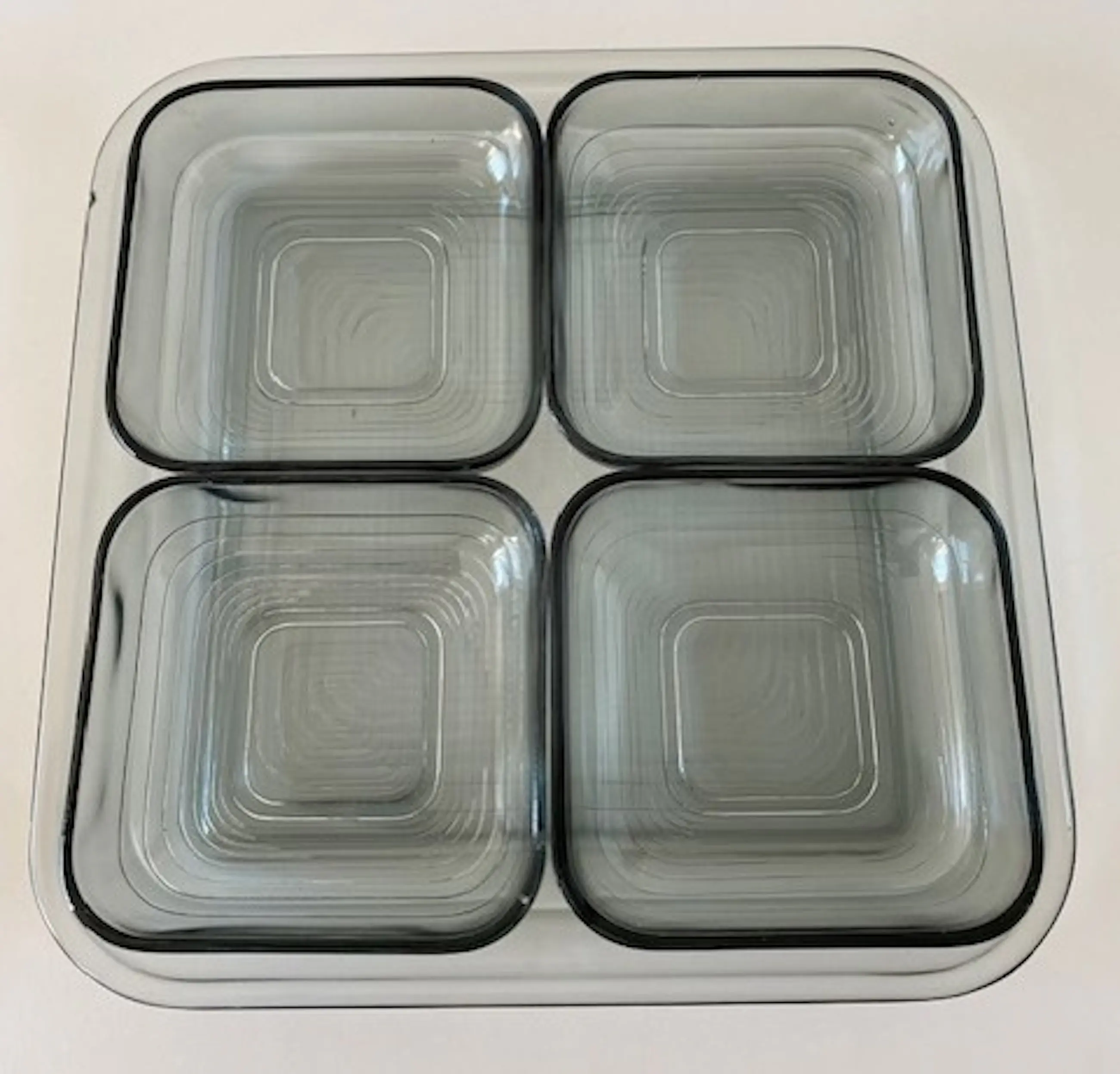 2 x saffier blauwe vijfdelige vierkante persglazen hors d'oeuvre-set 'Primula', Ontwerp: A.D. Copier 1947. Uitvoering: Glasfabriek Leerdam (1947 tot circa 1961). Grote vierkante schaal 22.8 x 22.8 cm (2x). Kleinere schaaltjes 9.8 x 9.8 cm (8x) Mooie conditie; een enkele minimale fleebite (zie foto's). Lit. A.D. Copier, trilogie (1991).