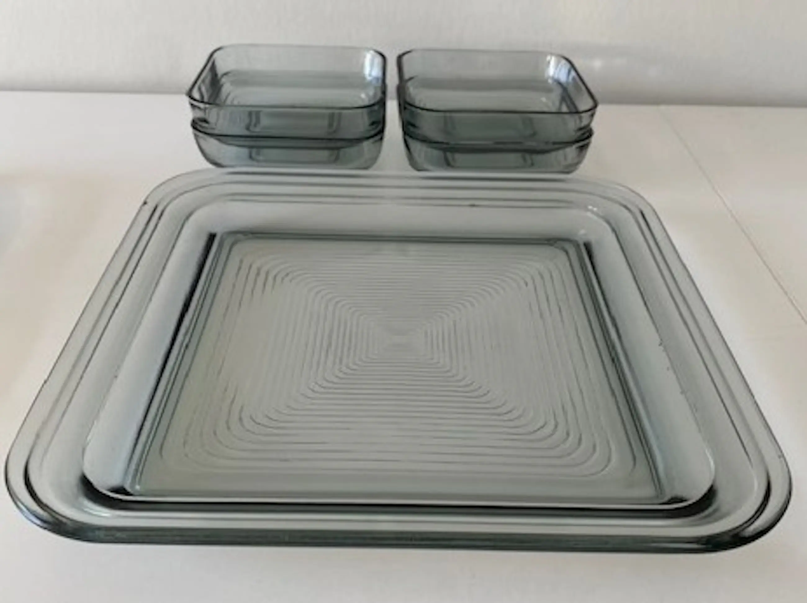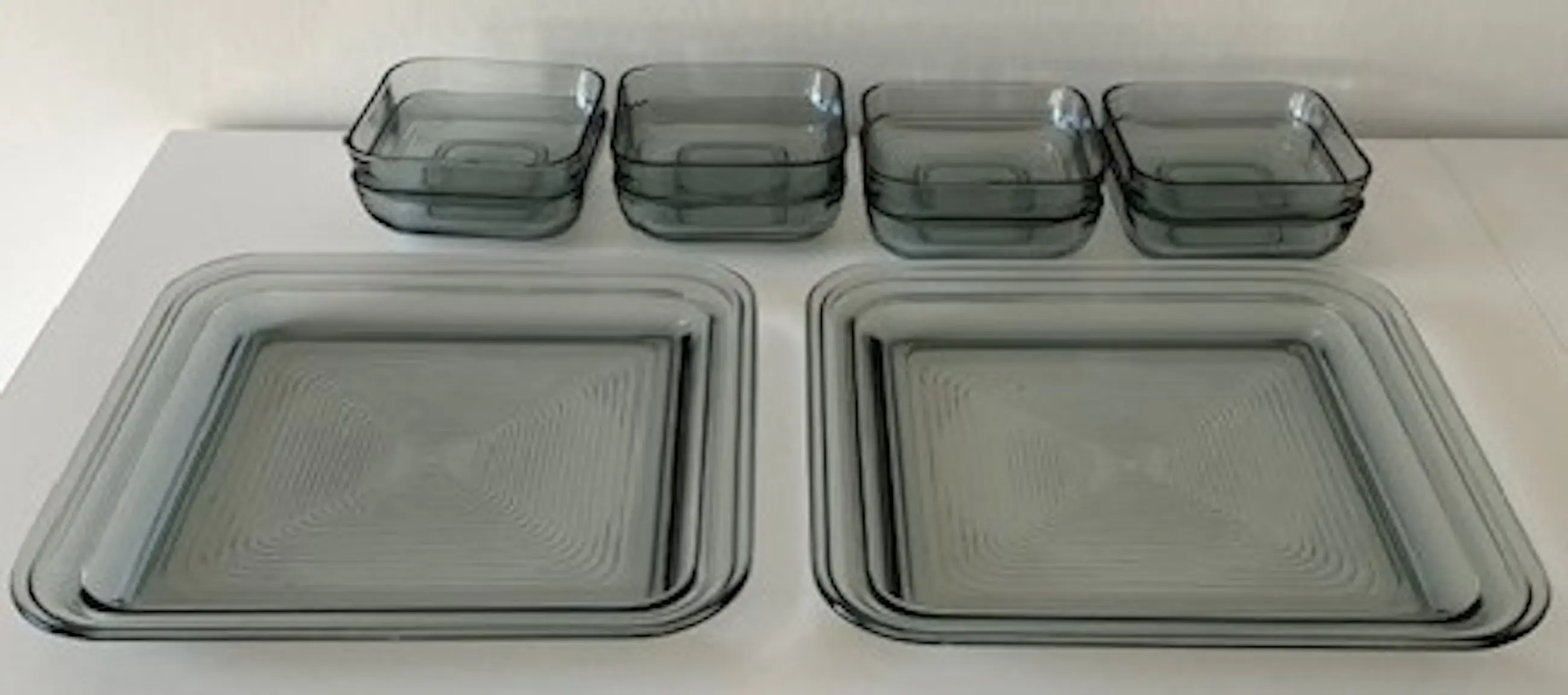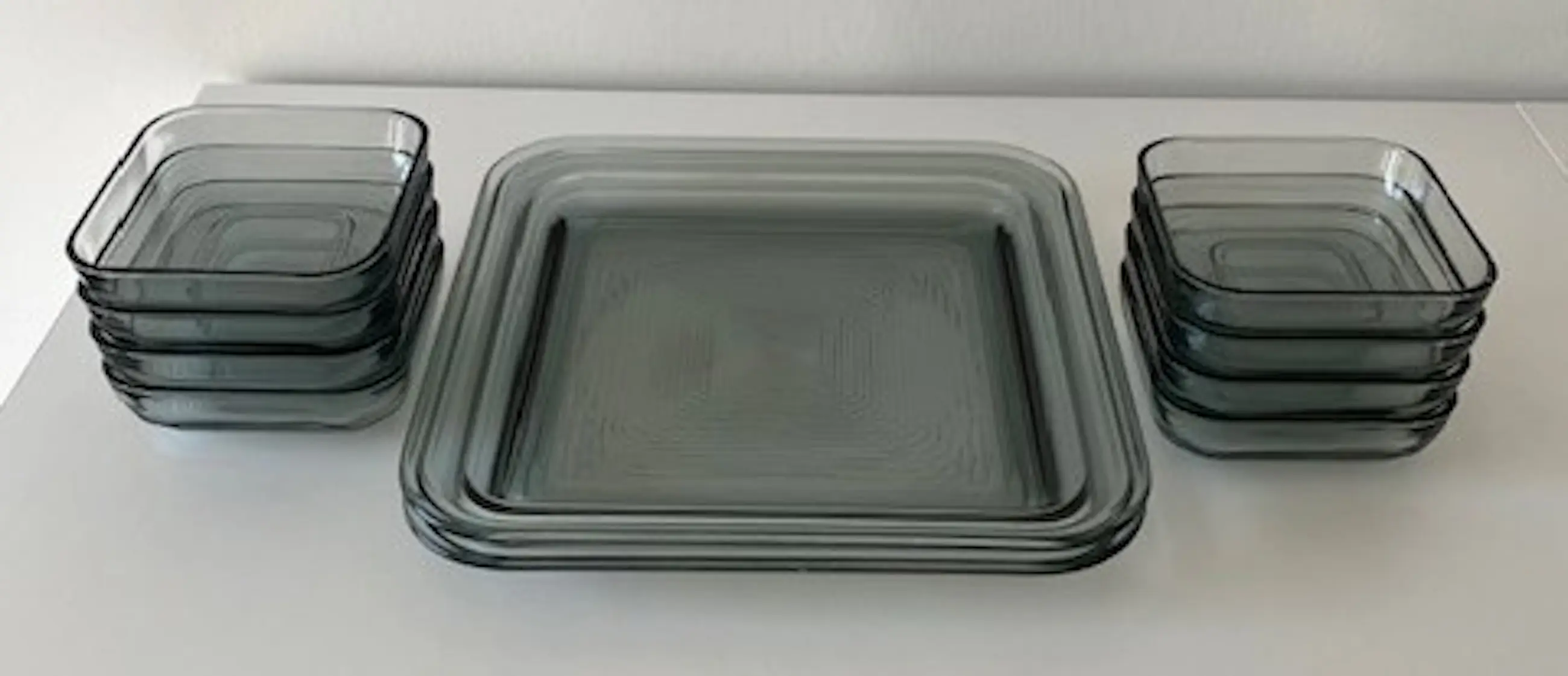 2 x saffier blauwe vijfdelige vierkante persglazen hors d'oeuvre-set 'Primula', Ontwerp: A.D. Copier 1947. Uitvoering: Glasfabriek Leerdam (1947 tot circa 1961). Grote vierkante schaal 22.8 x 22.8 cm (2x). Kleinere schaaltjes 9.8 x 9.8 cm (8x) Mooie conditie; een enkele minimale fleebite (zie foto's). Lit. A.D. Copier, trilogie (1991).