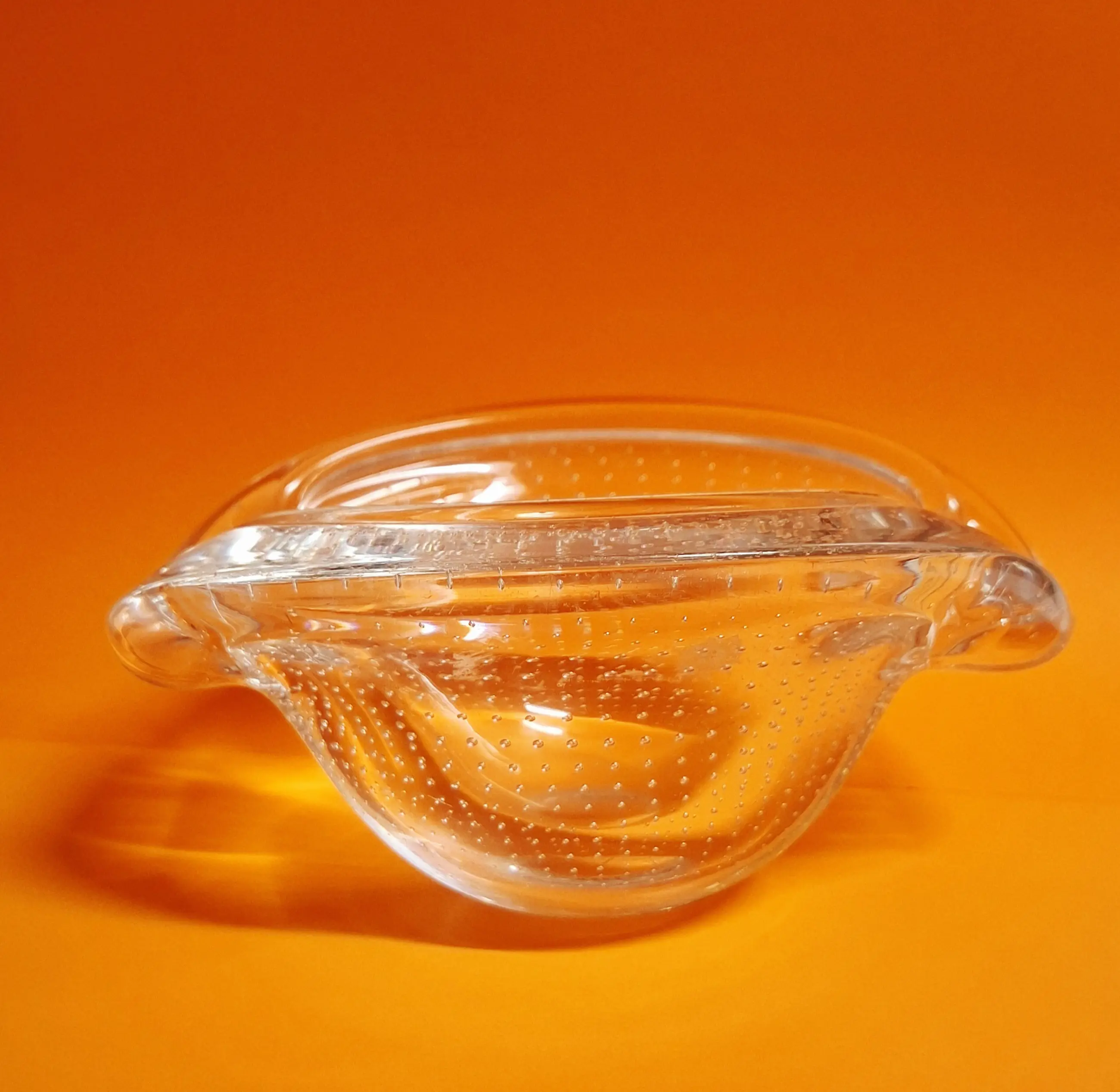 Andries Copier Leerdam asbak van spijkerglas, een ontwerp van Copier rond 1950’s. Handgeblazen met een regelmatig patroon van luchtbelletjes.