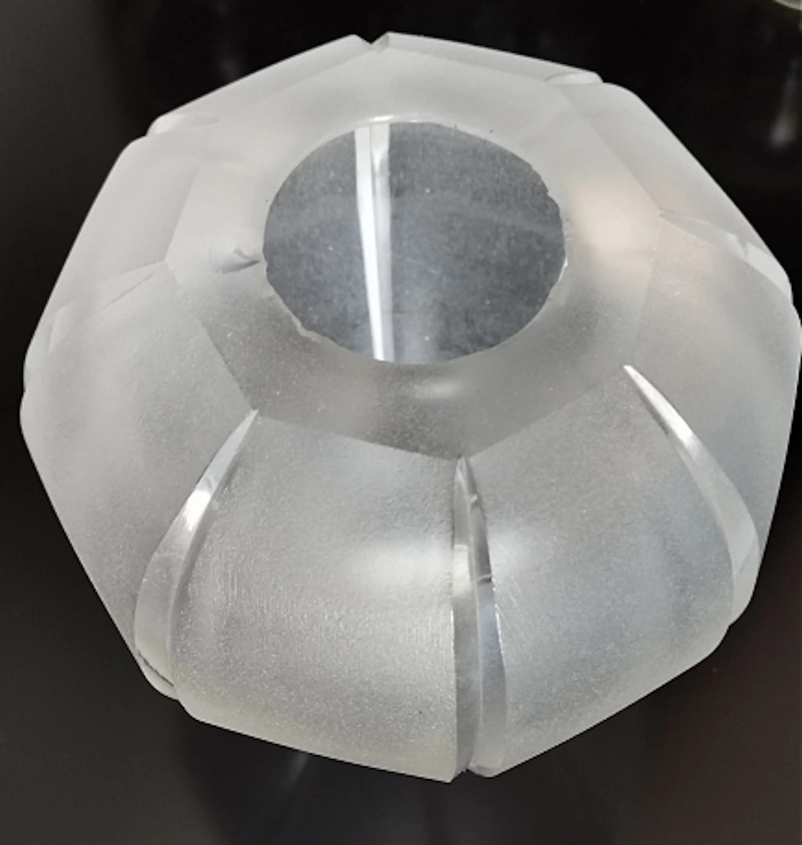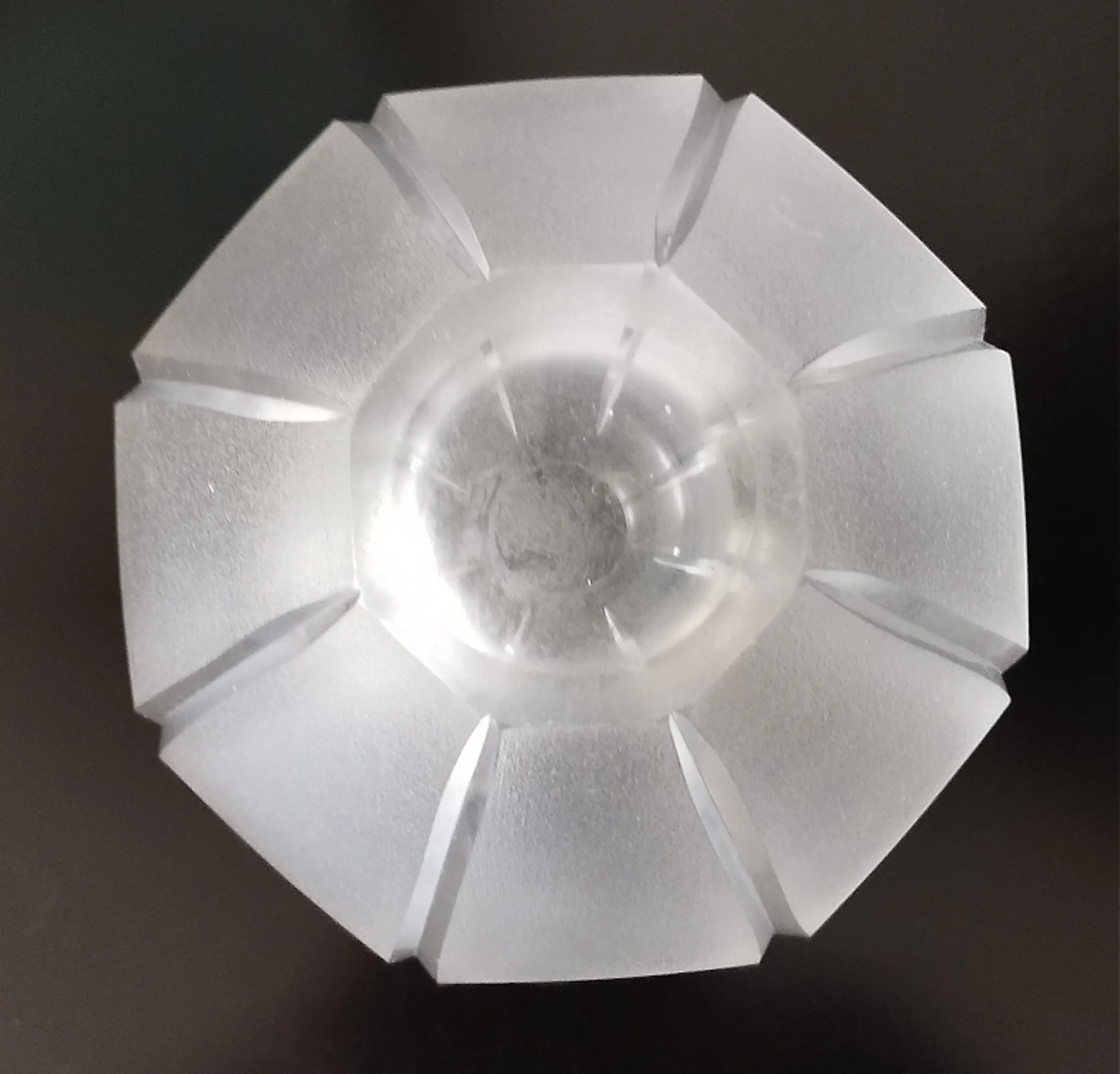 Een mooi gesatineerde vaas van dik glas met acht geslepen ribben.