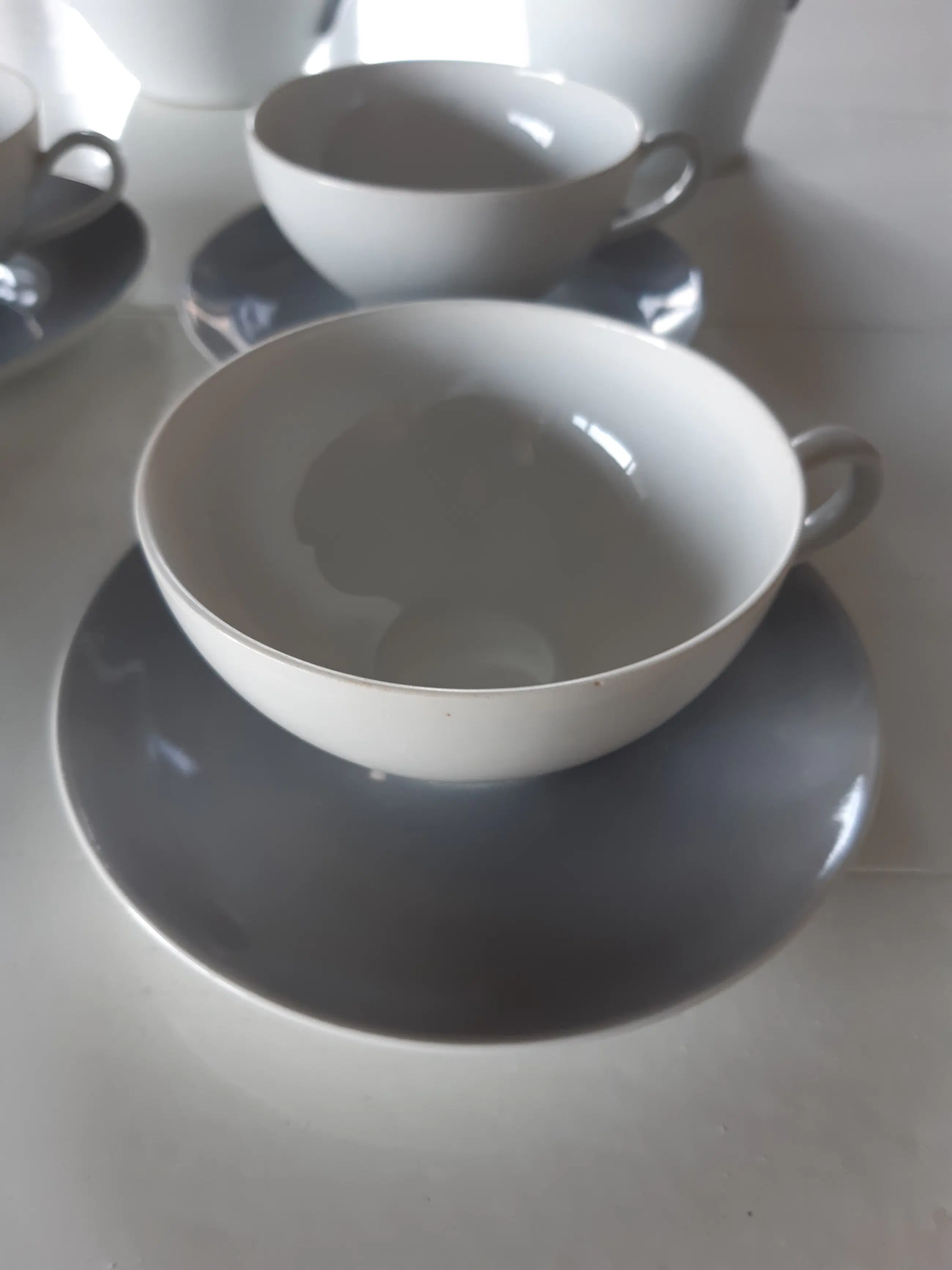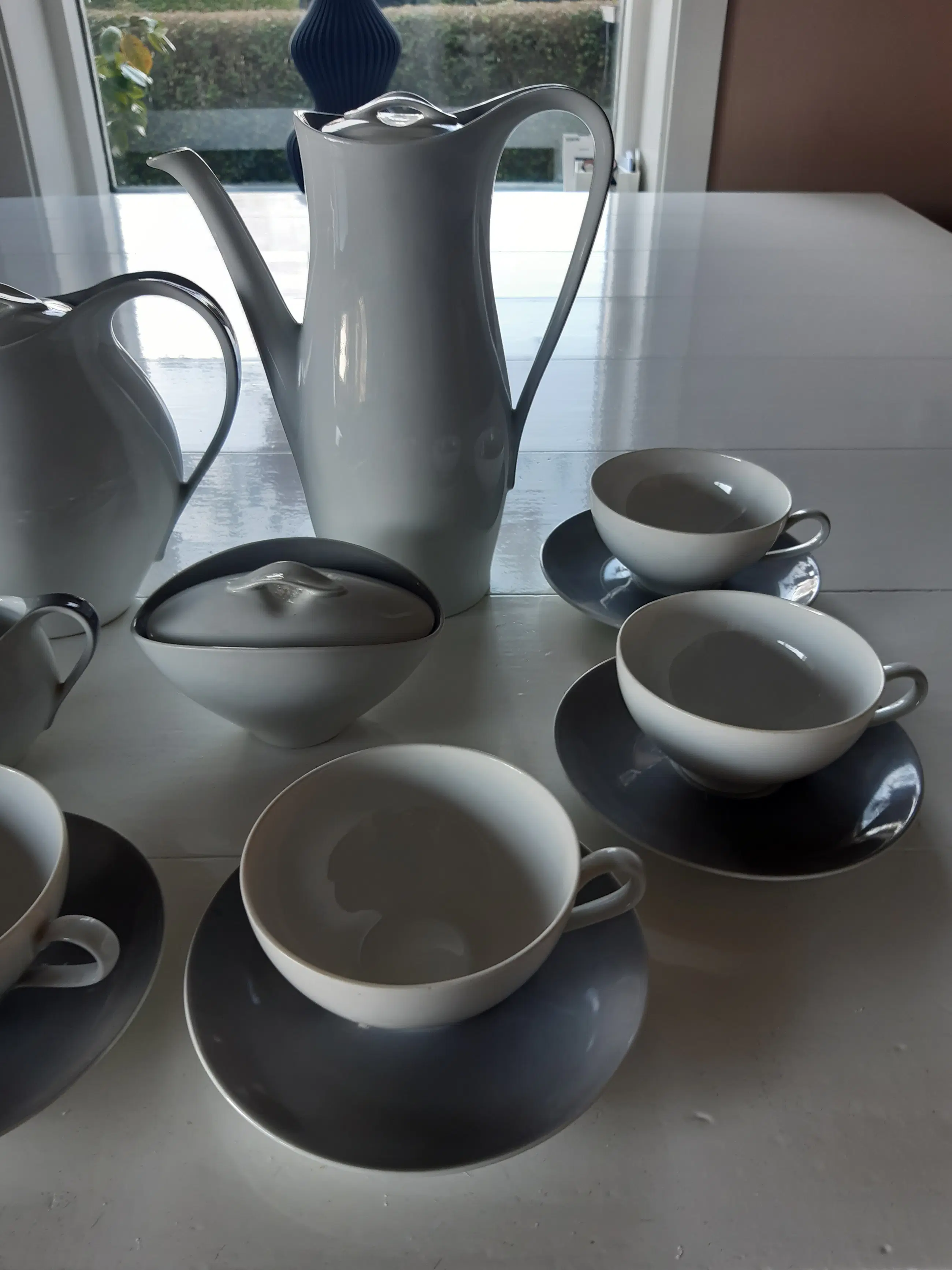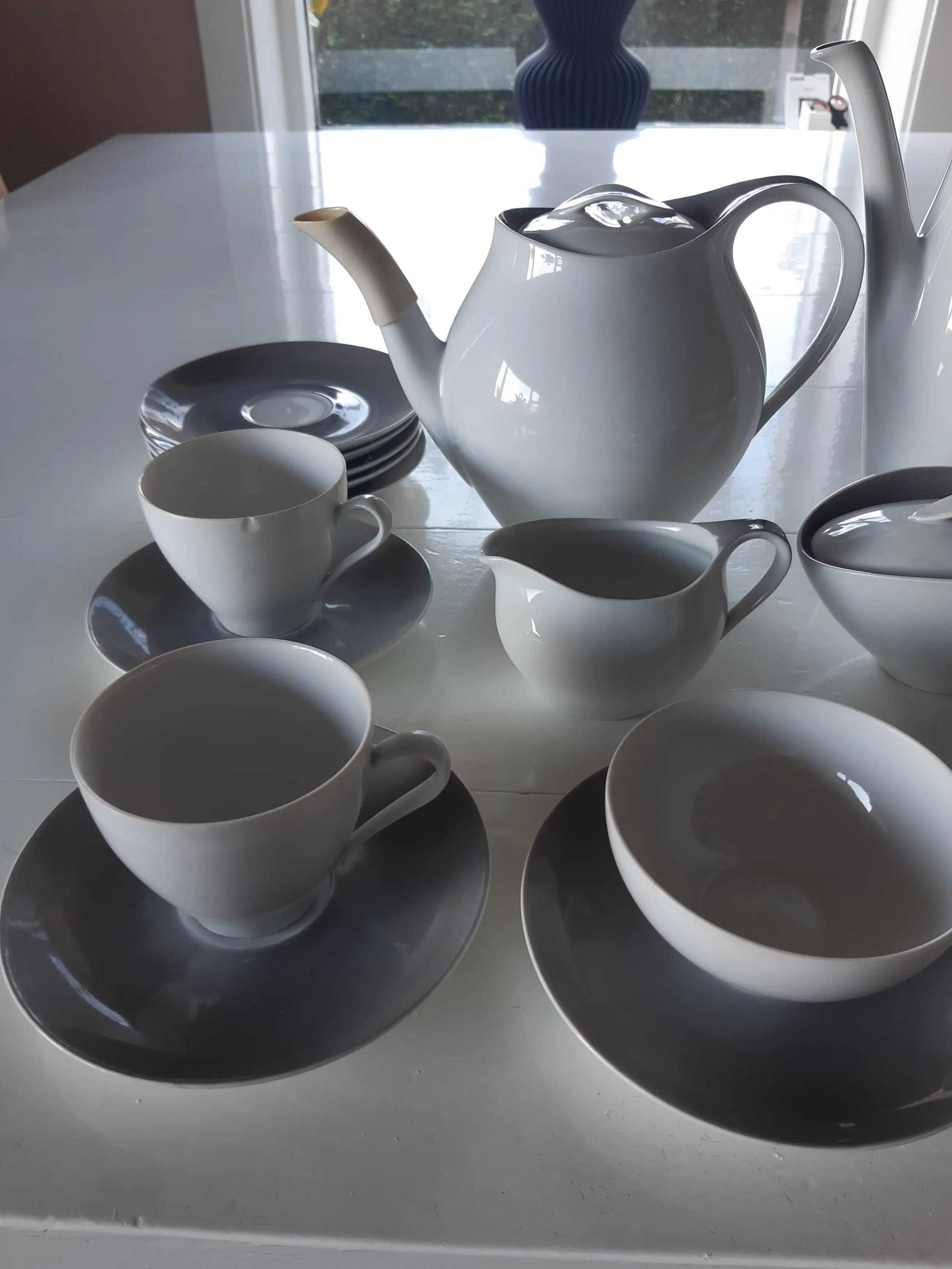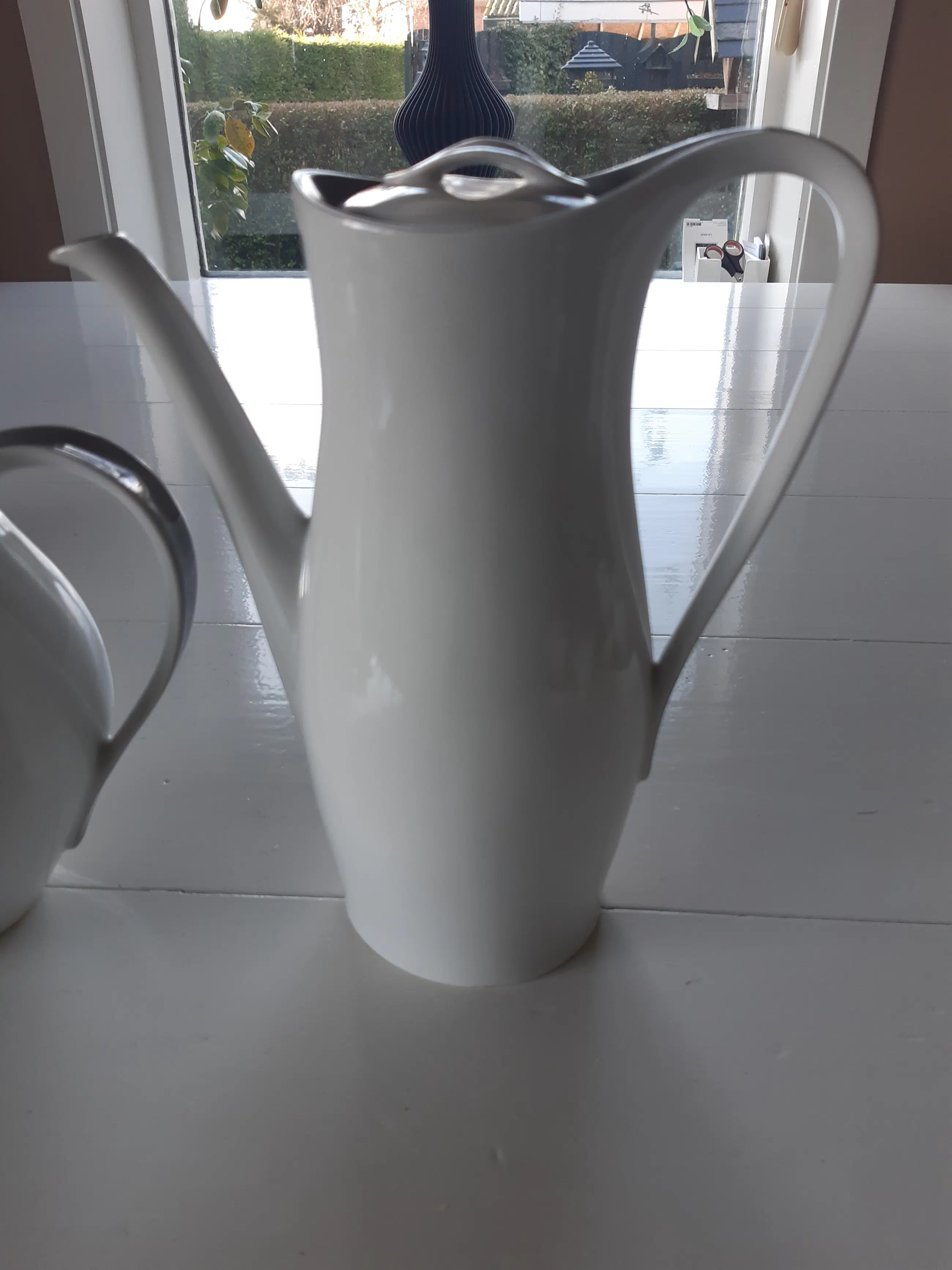 Elegant servies van Copier en Eschenbach bestaand uit Koffiekan Theepot Melkkannetje en suikerpot 2 koffiekopjes 4 theekopjes 5 extra schoteltjes Mooi servies in wit met grijze accenten