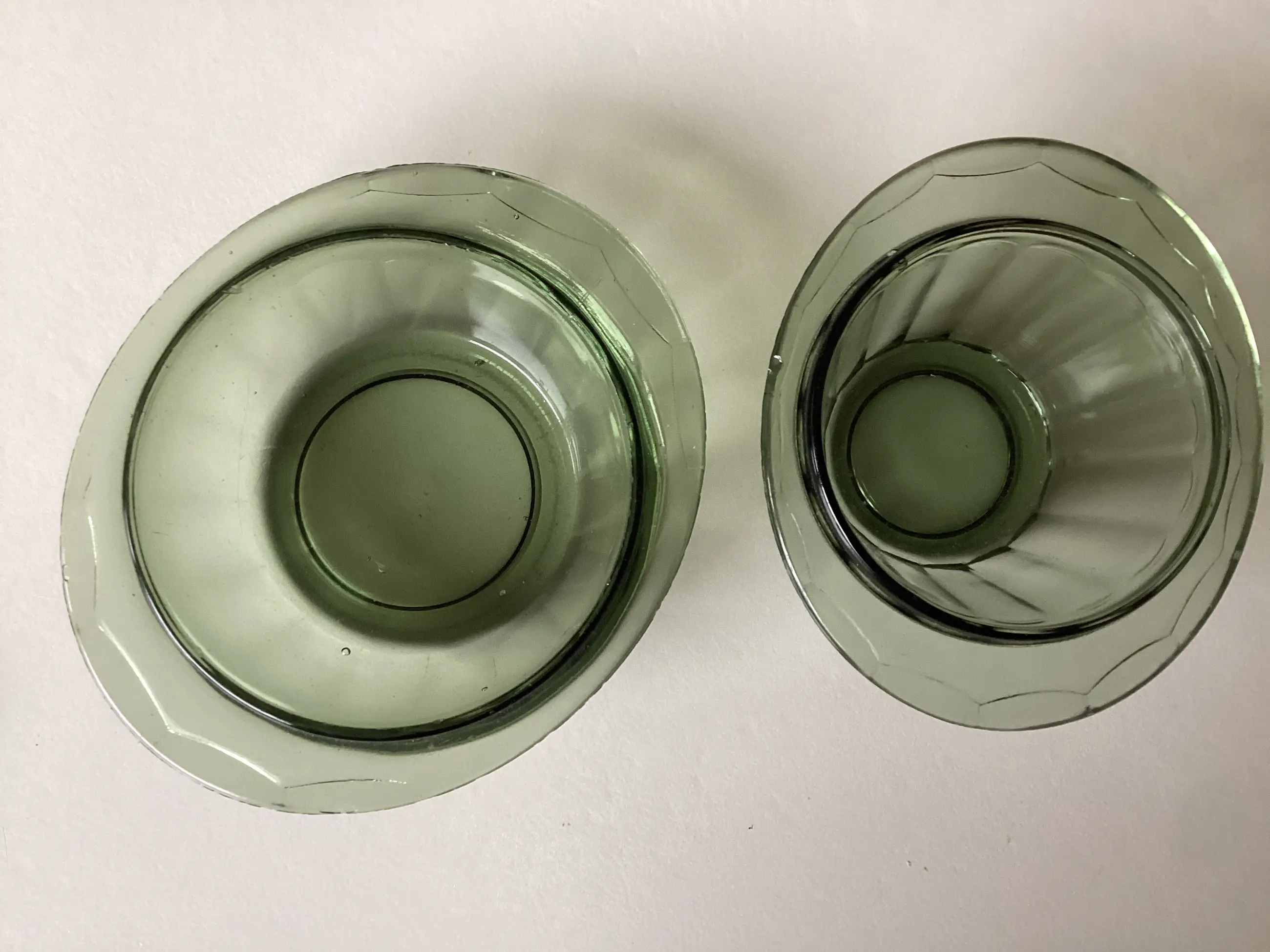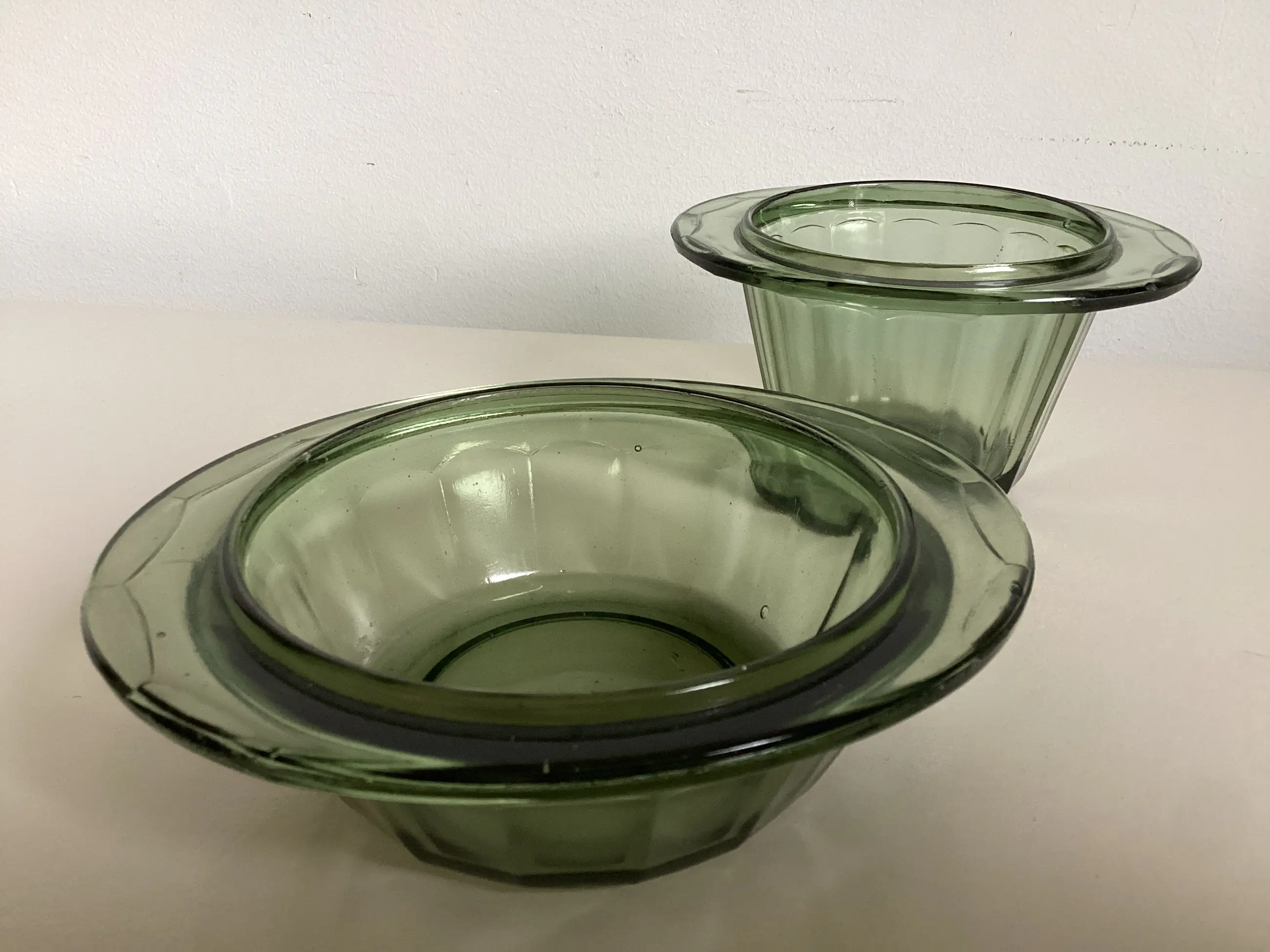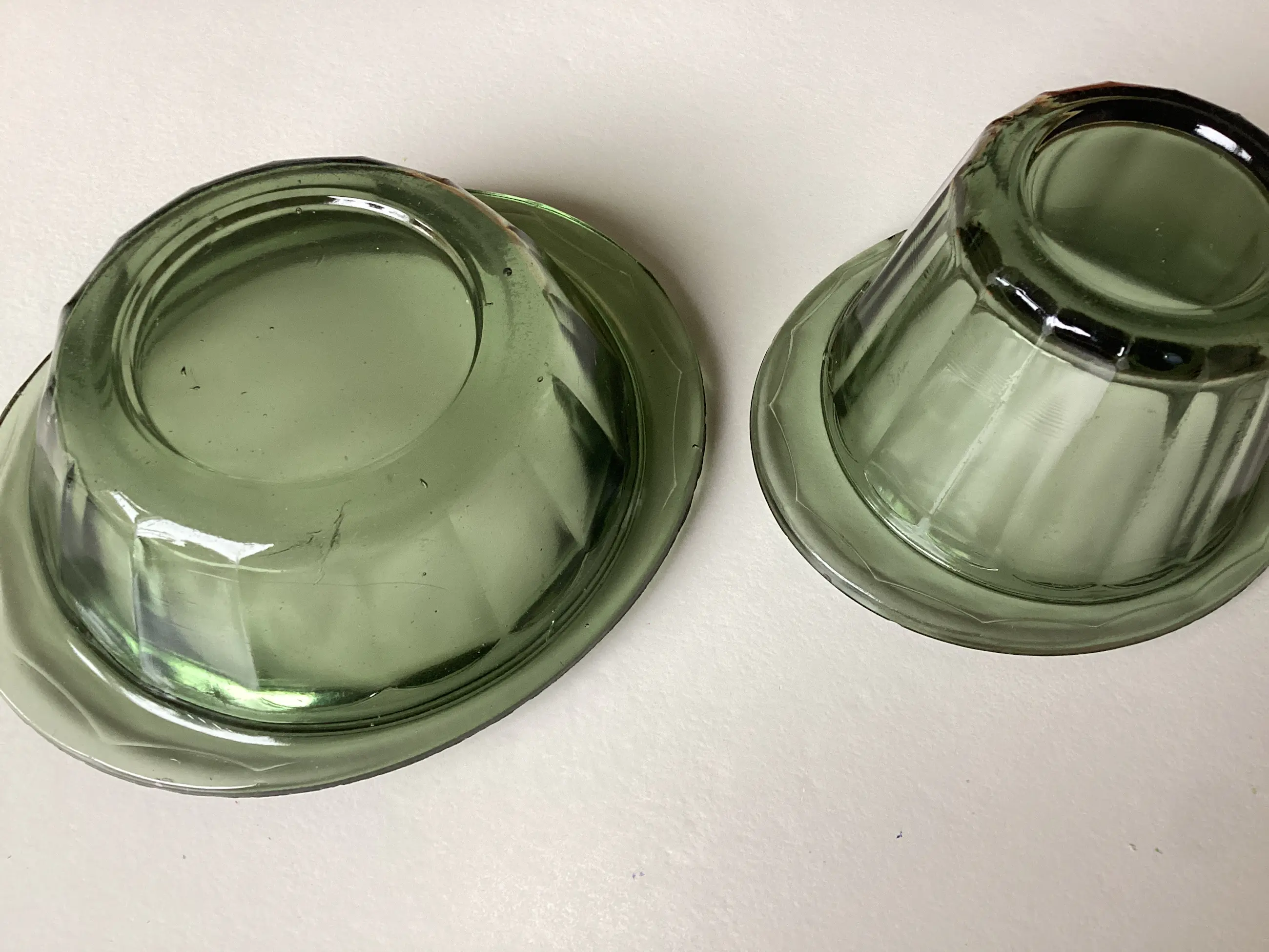 Royal Neerlandia 2 schaaltjes van dennengroen persglas. Suikerbakje/botervloot. 1939.