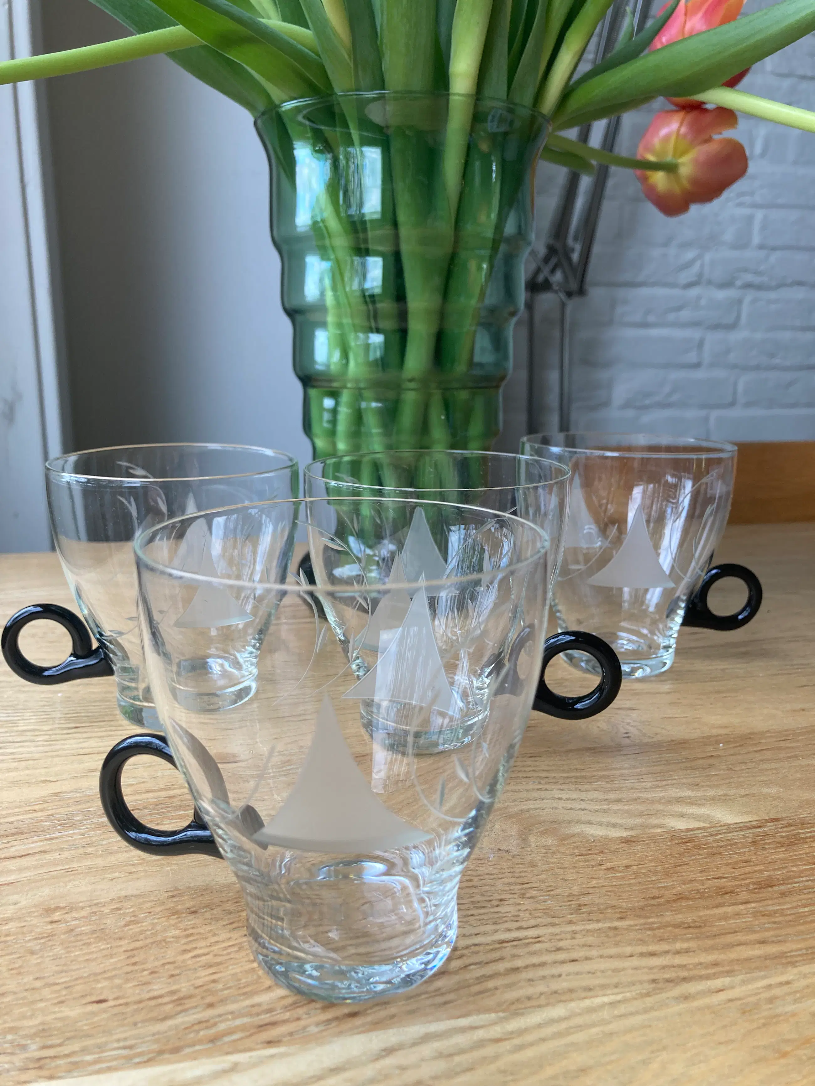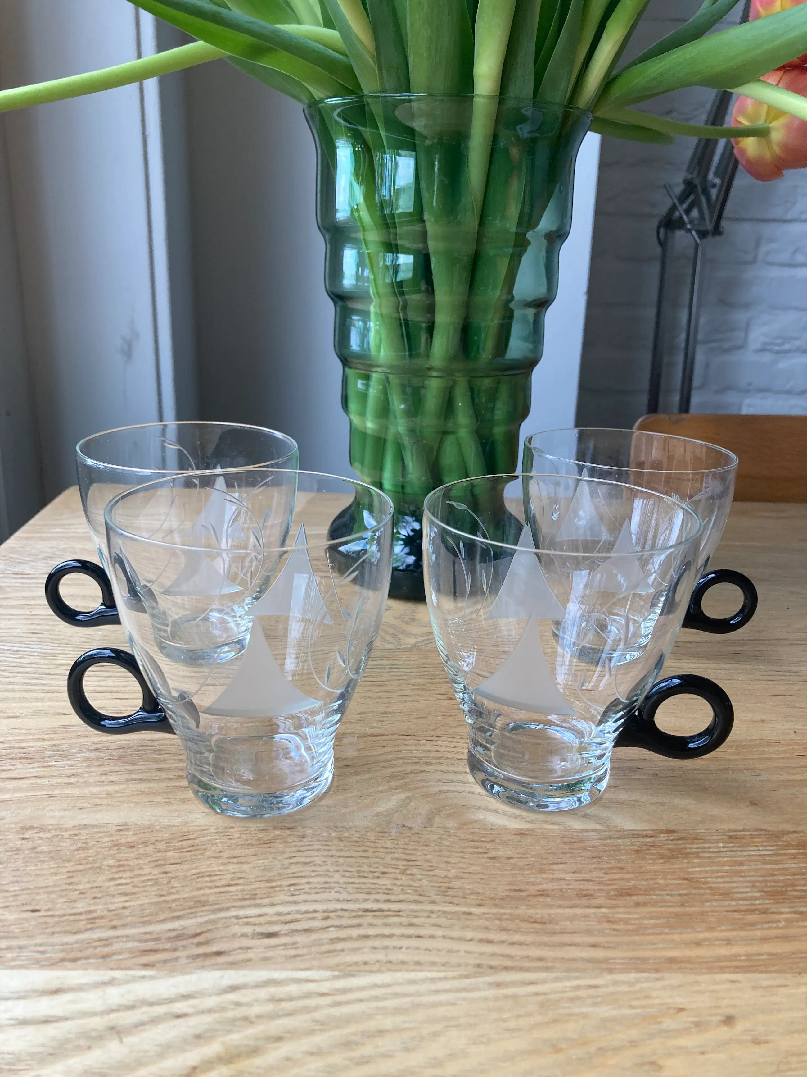 Vier bowlglazen met zwart oor van A.D. Copier. Bijzonder opvallend minimalistisch design. Uit de eerste helft van de vorige eeuw.
