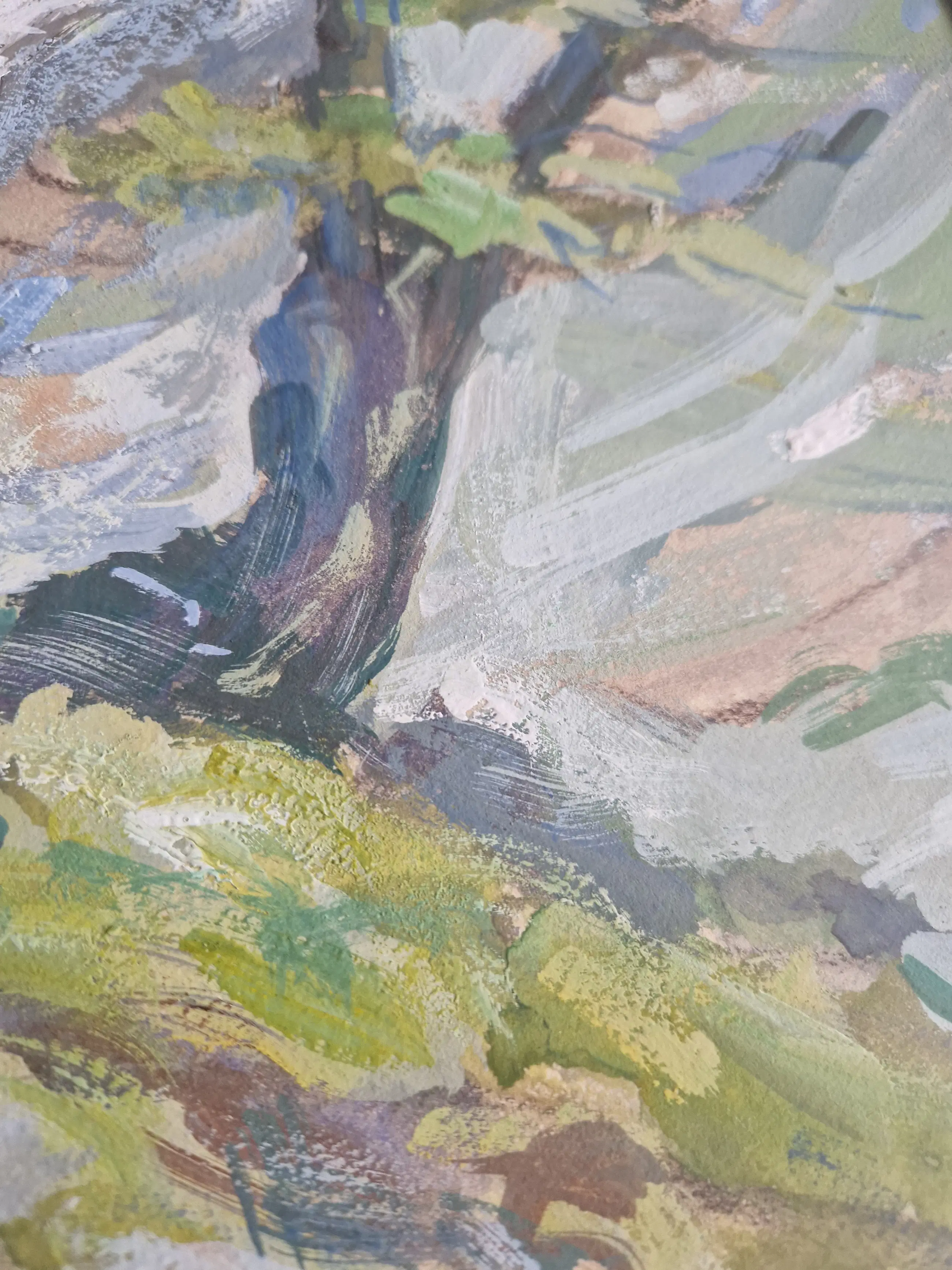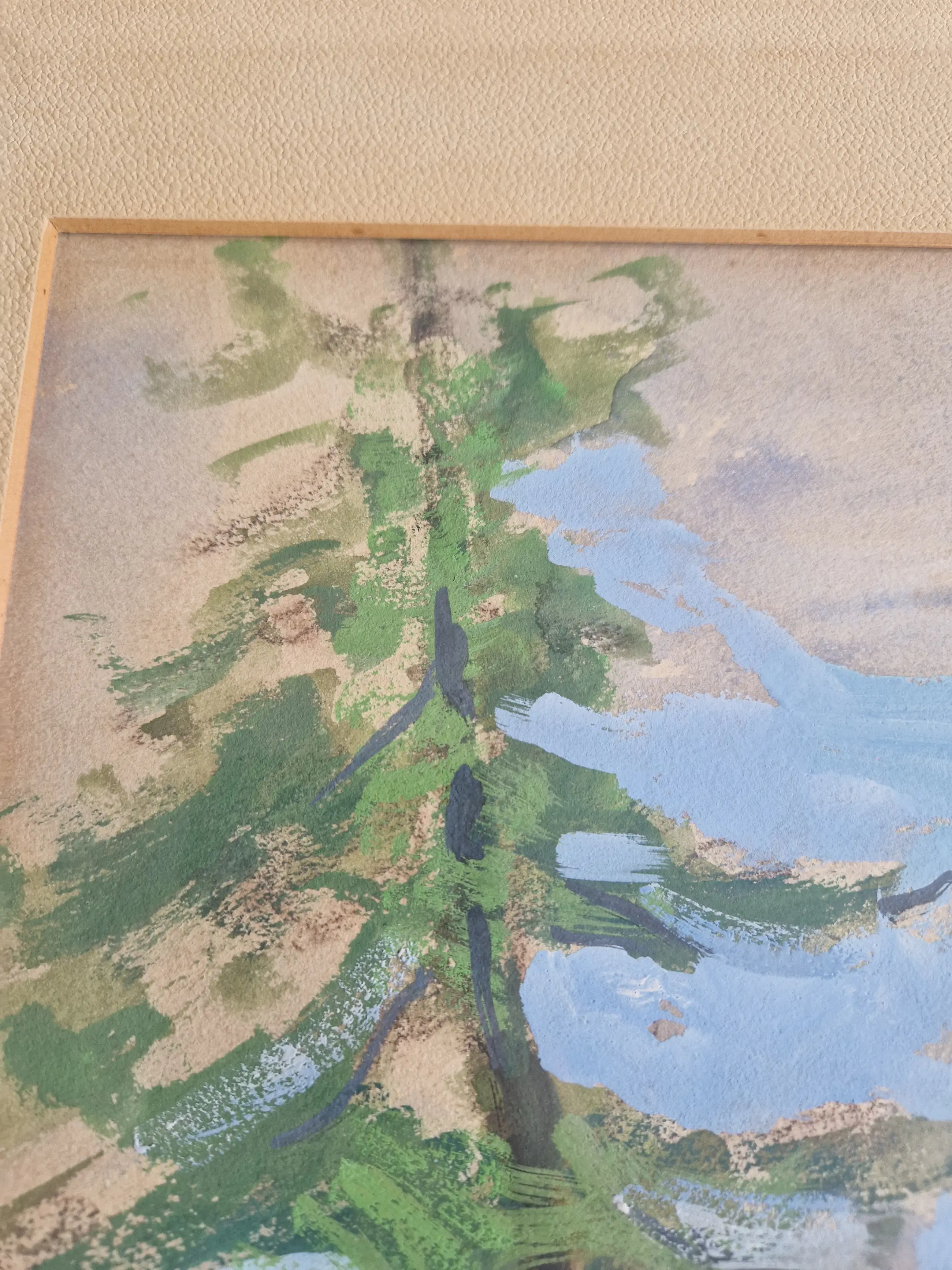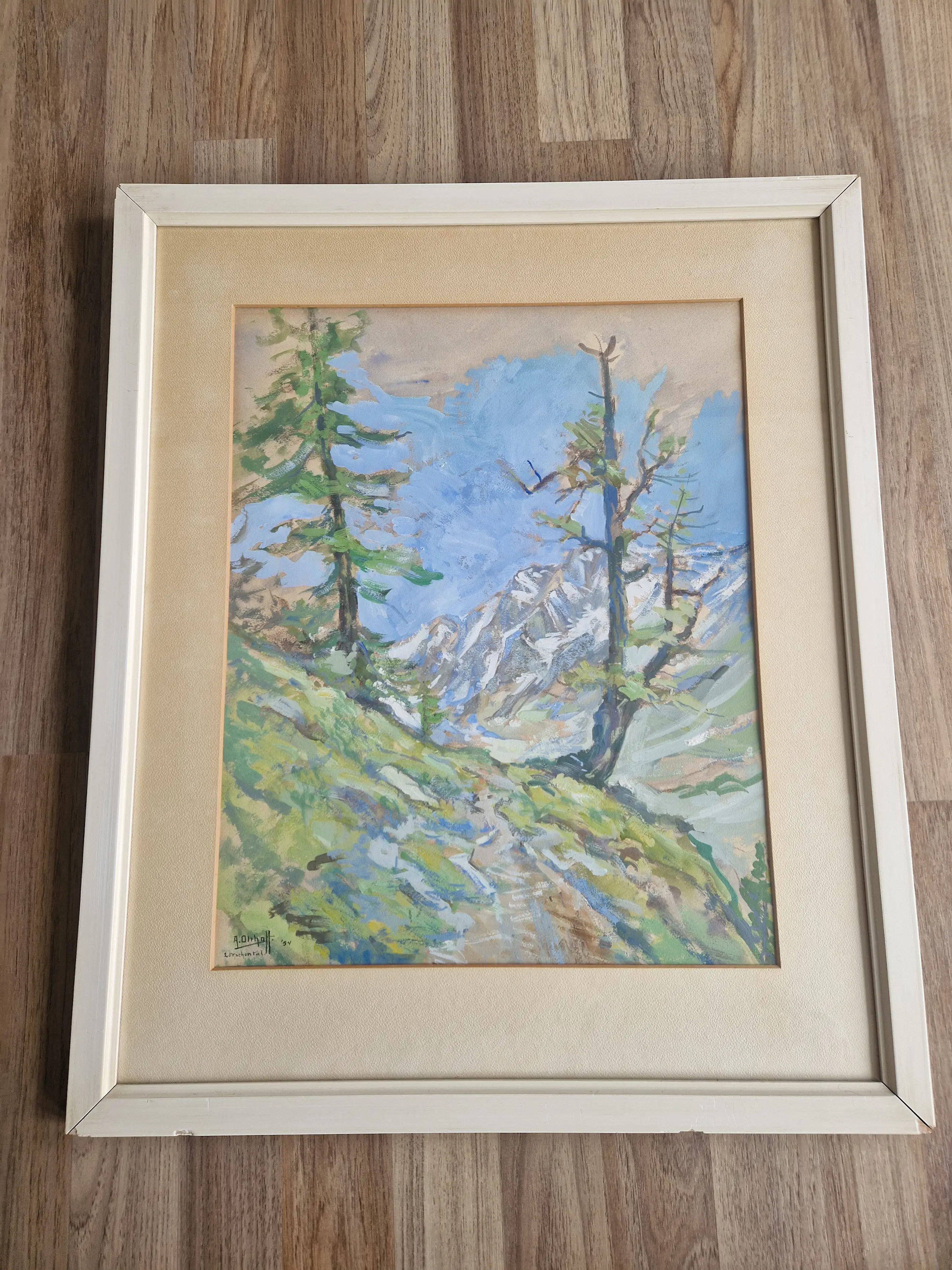 Schilderij A. Olthoff gesigneerd met "54 Verf op papier, In goede staat. Passepartou en lijst zijn aan vervanging tot. Lijst op meerdere plekken kapot en Passepartou verkleurd.