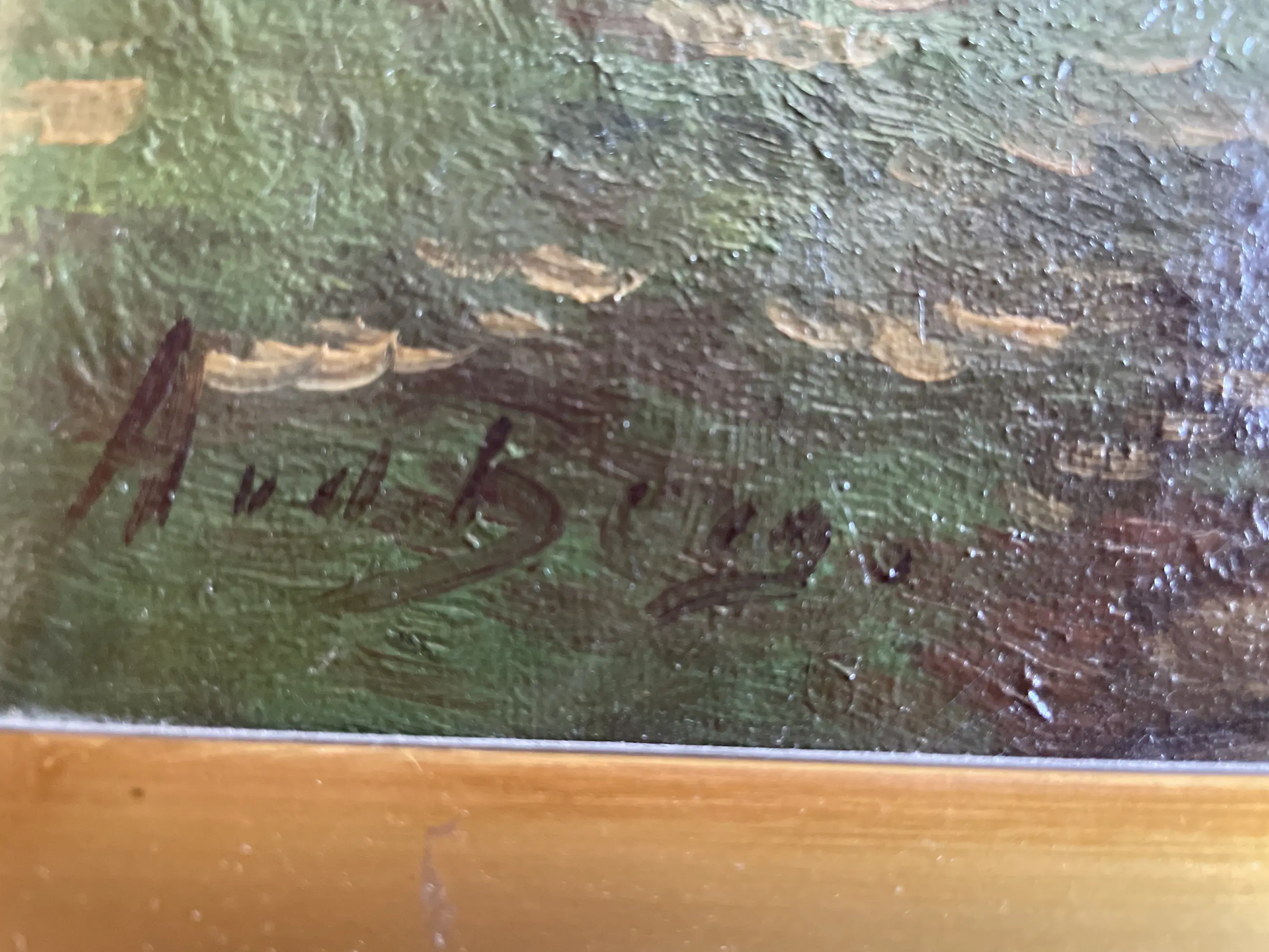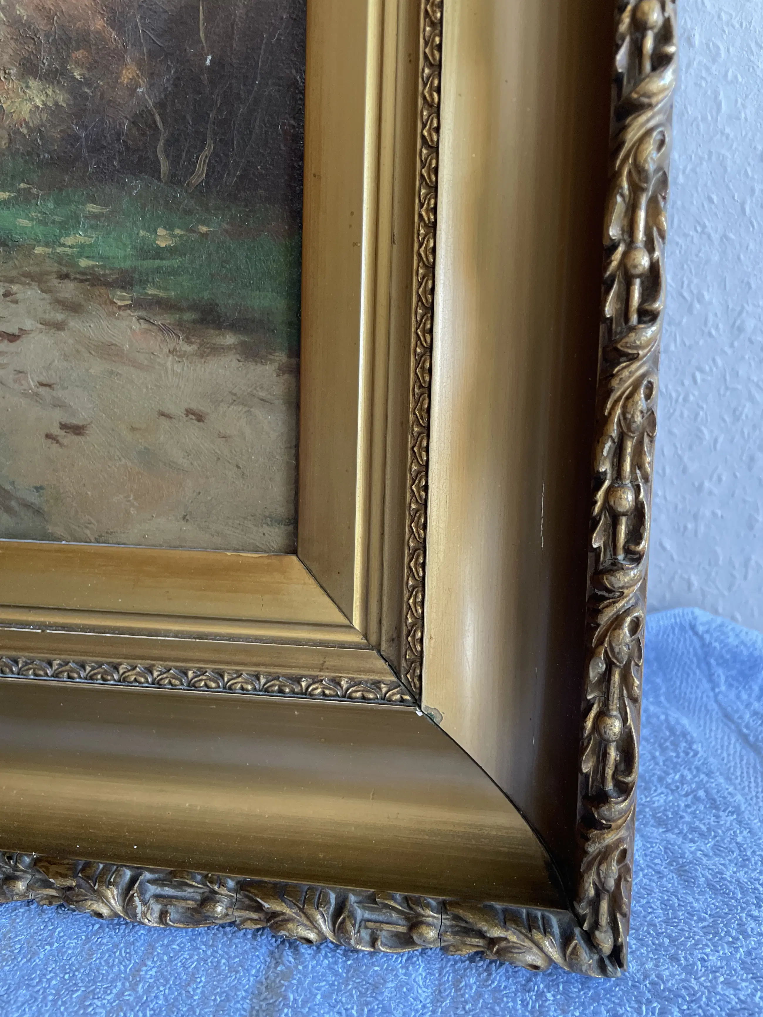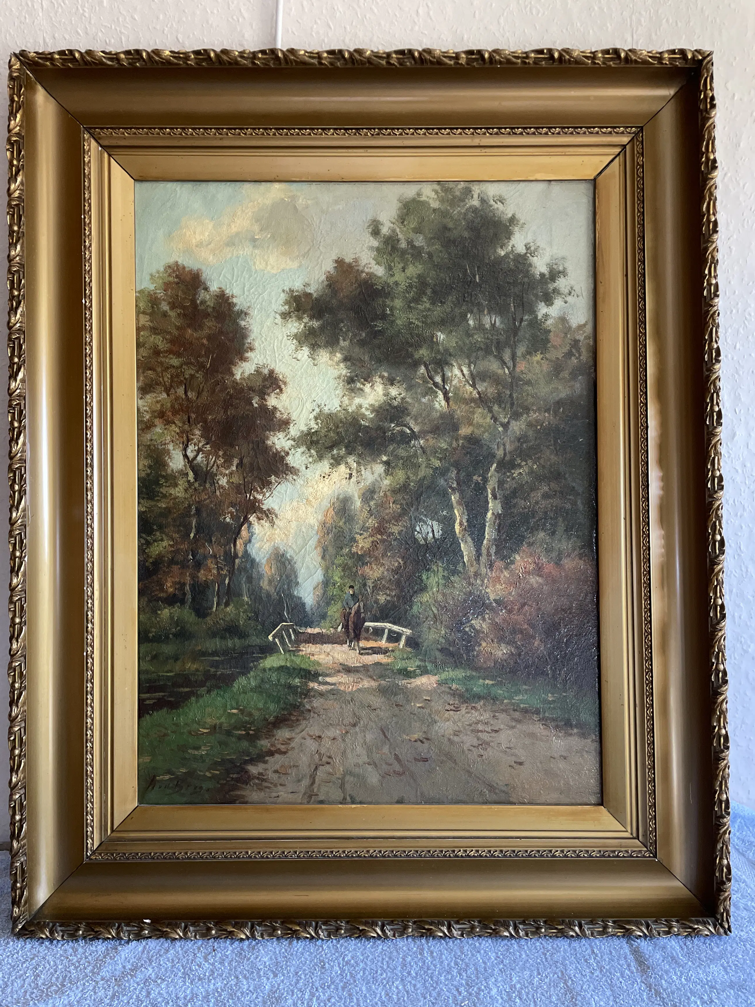 Hedendaags olieverfschilderij van de Nederlandse schilder Andries van den Berg. Het toont een ruiter die met zijn paard over een bruggetje in een bos rijdt en speelt zich af aan het begin van de herfst.