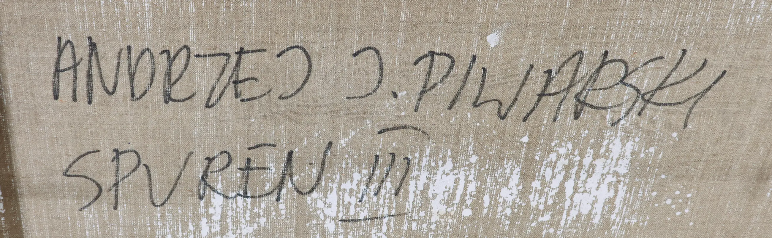 Er zit een behoorlijke deuk in het doek die op de foto niet goed was vast te leggen. In de detailfoto's is de plaatsing van de deuk en het verfverlies met een rode rechthoek aangegeven. Op andere plekjes zit ook enige verfverlies en krasjes. | |