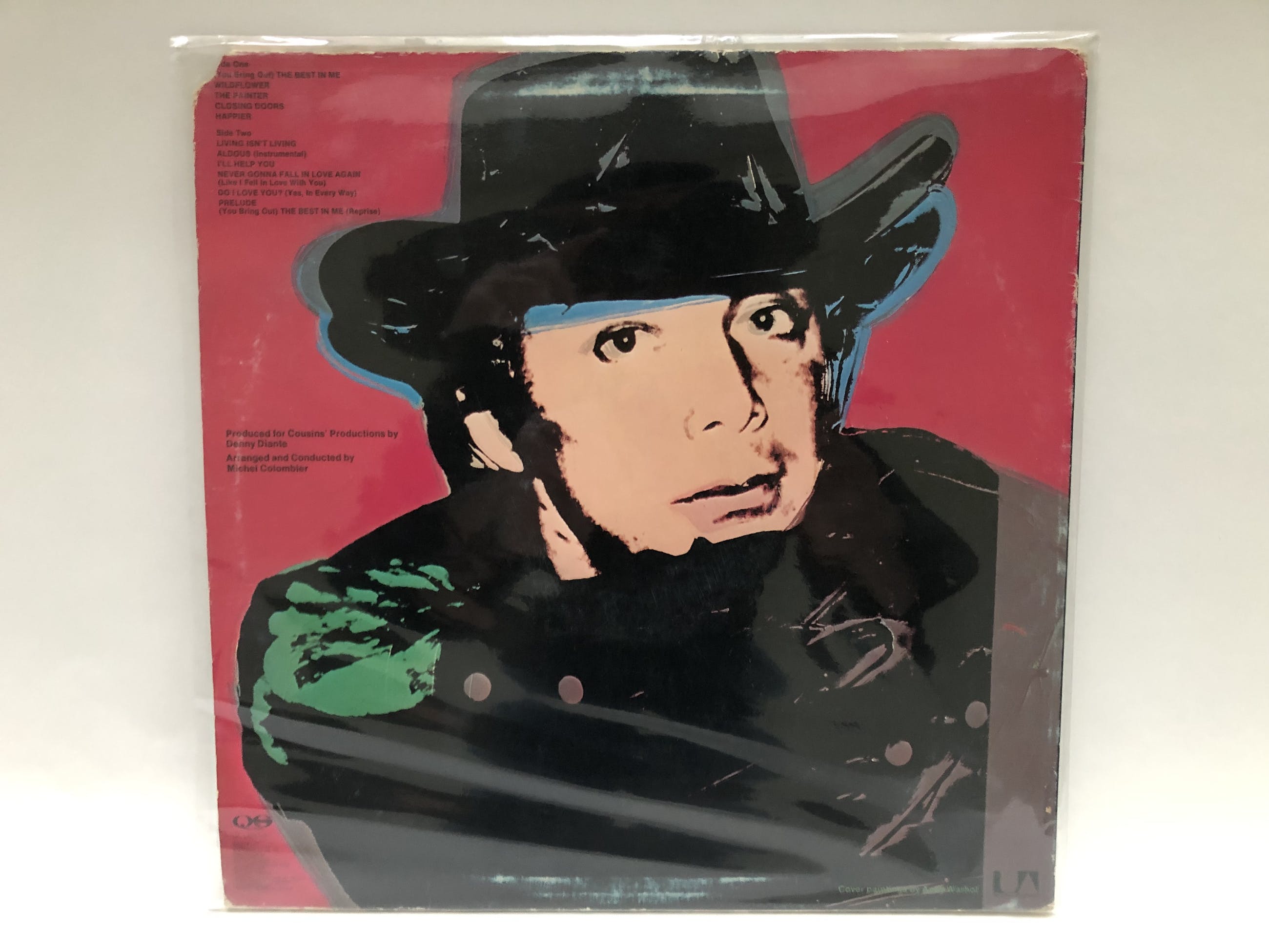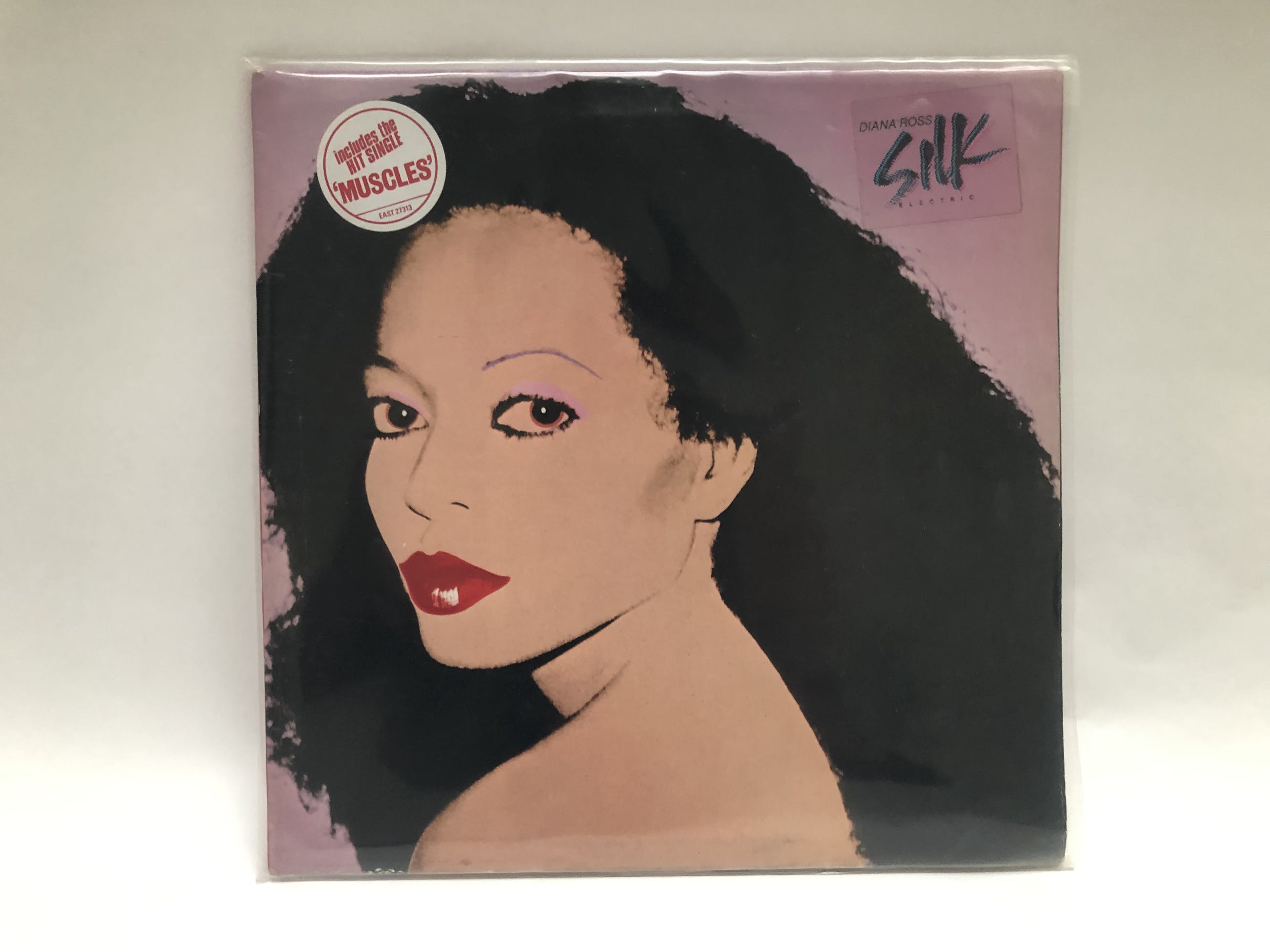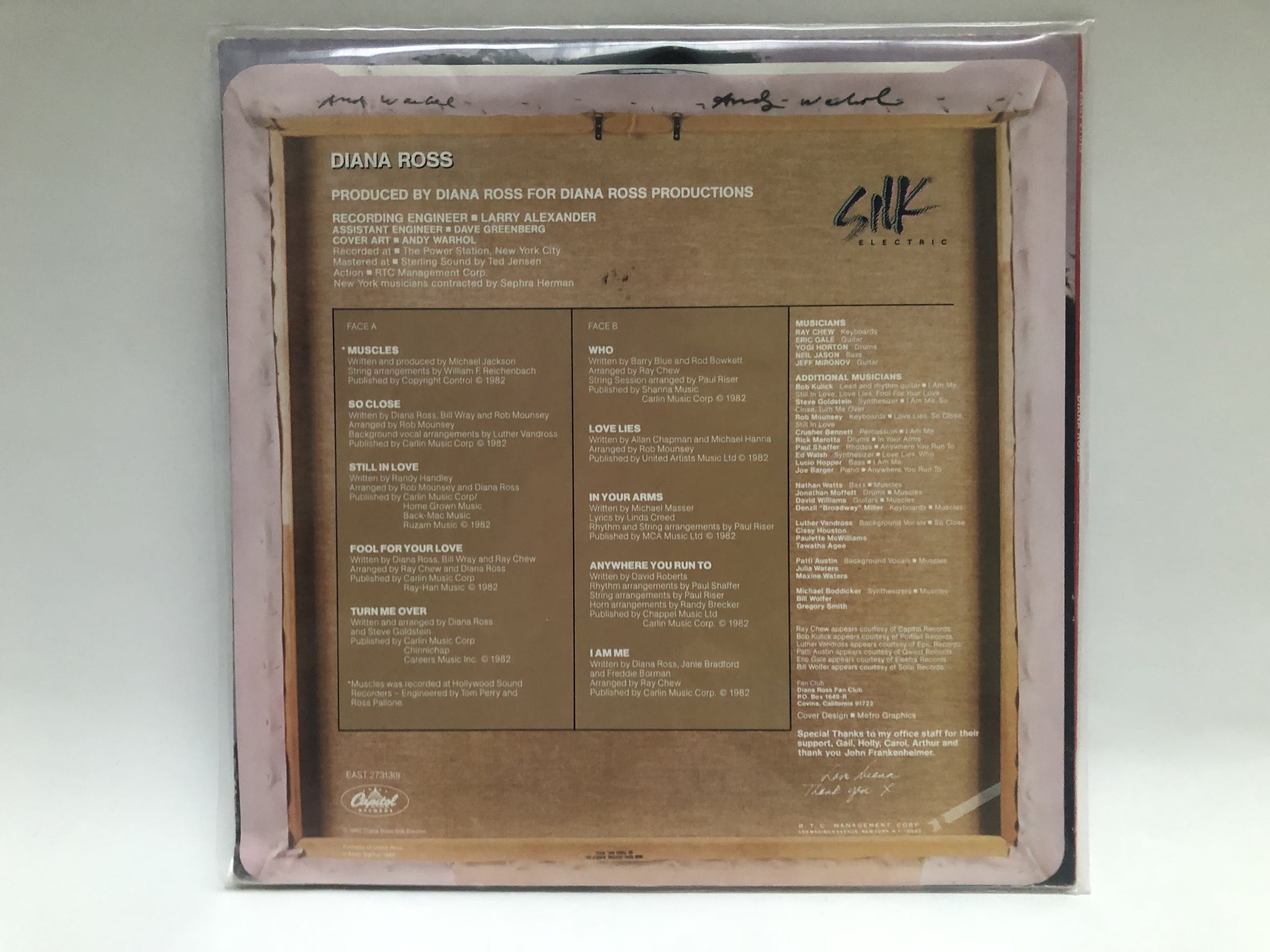 Vier langspeelplaten met de hoezen in het kenmerkende ontwerp van Andy Warhol. Aretha Franklin, Billy Squier, Diana Ross en Paul Anka. In die jaren was het in zwang dat kunstenaars hun kunst gingen toepassen op andere media in het dagelijks gebruik, zoals hier het geval bij LP-hoezen.