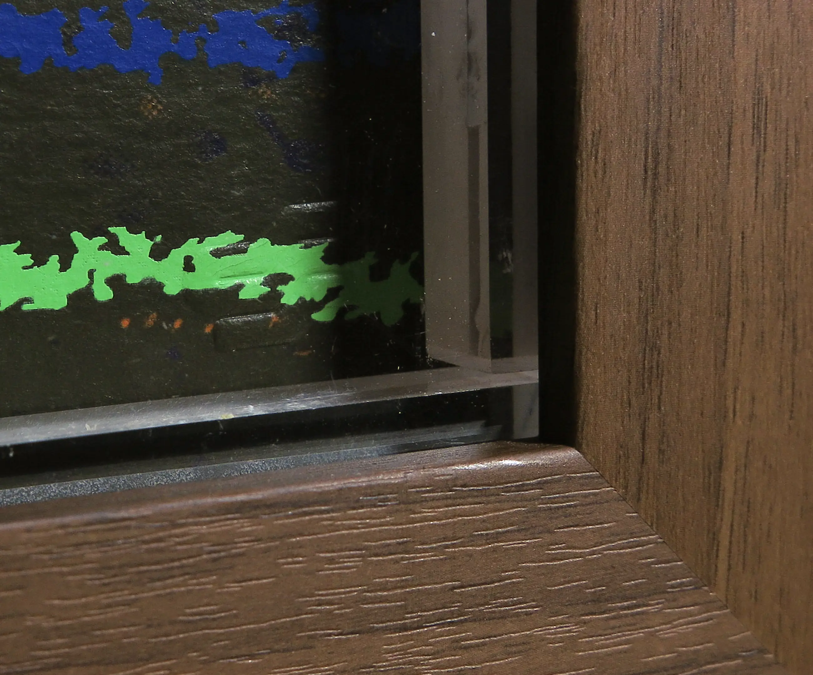 Om het werk niet 'vast te plakken' wordt het werk middels plexiglazen strips/spacers in de lijst geklemd. Dit is zichtbaar op de foto met de blinddruk.