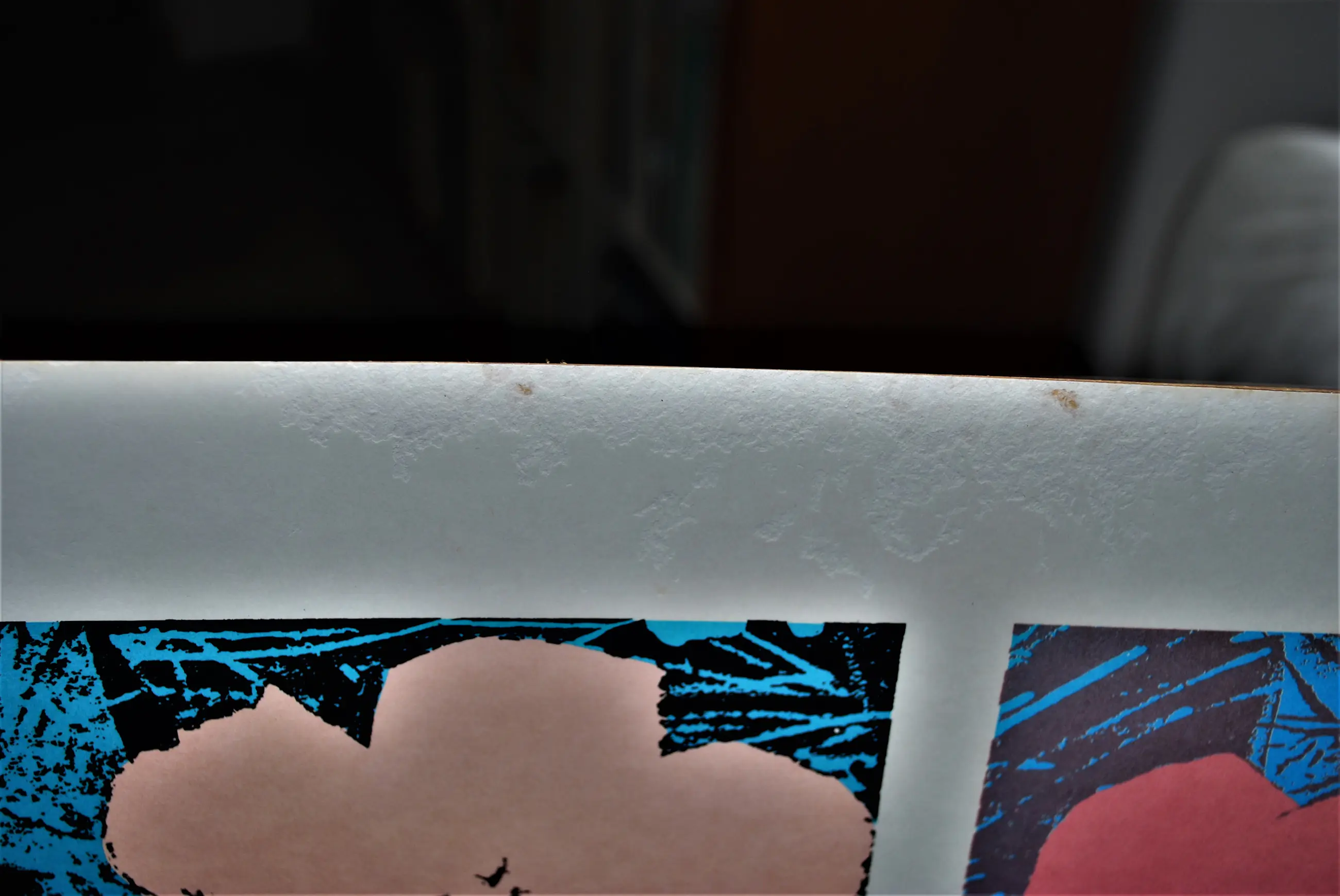 Het karton heeft deels waterschade gehad, maar dit beïnvloedt de voorzijde nauwelijks. Aan de randen wat schaafplekken. Vlek in de uiterste hoek r.o. Over het geheel in redelijke tot goede gebruikte staat.