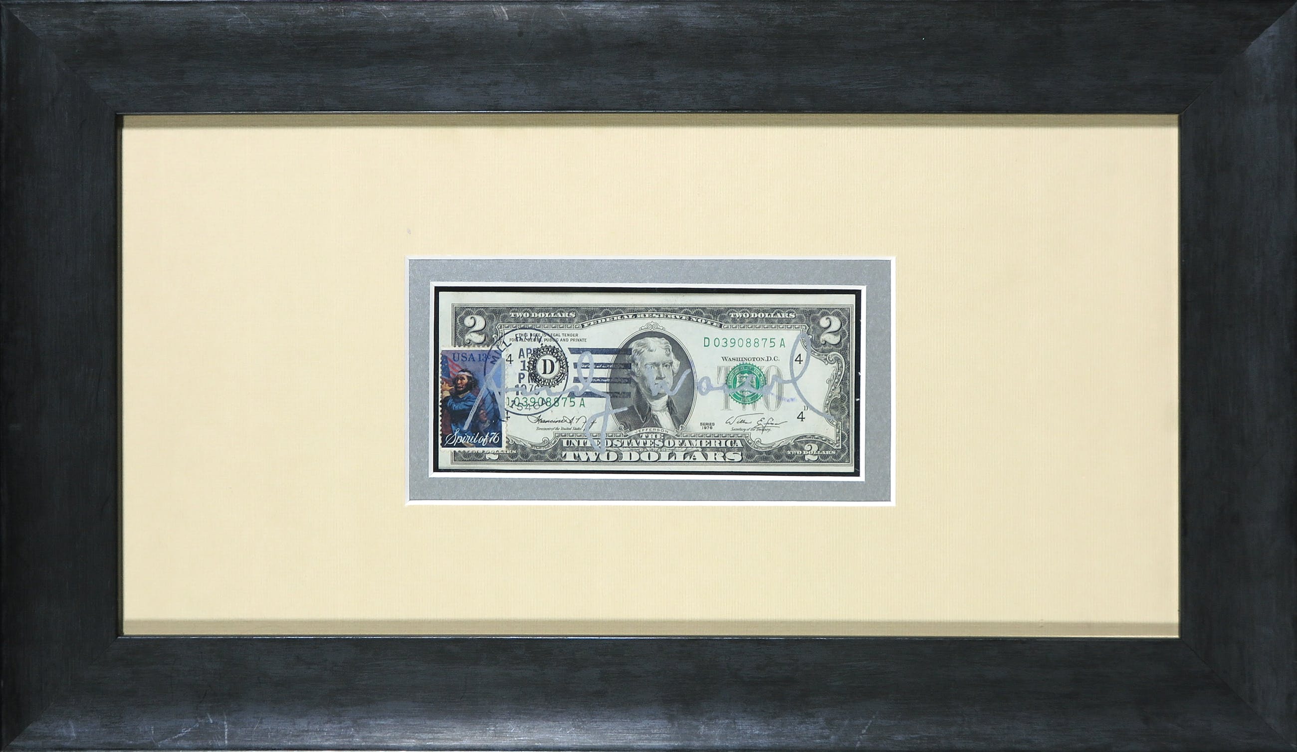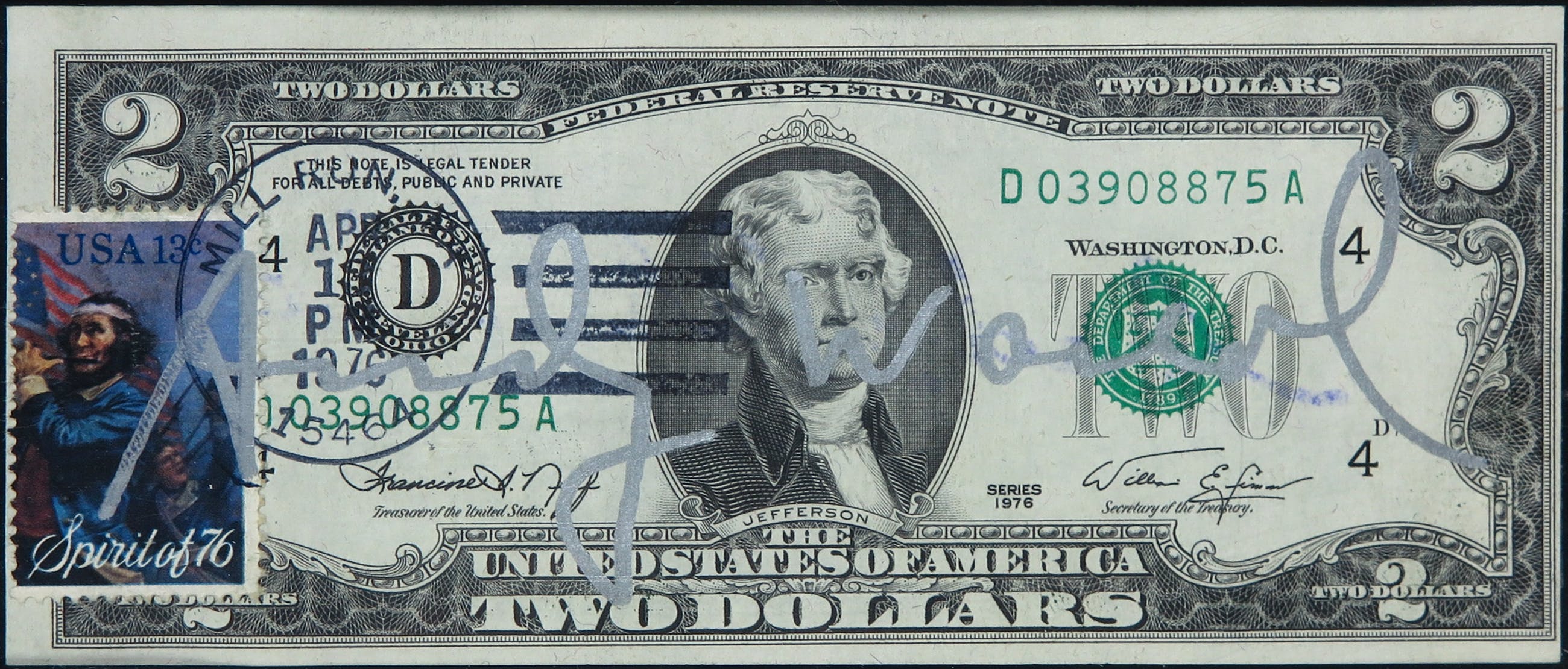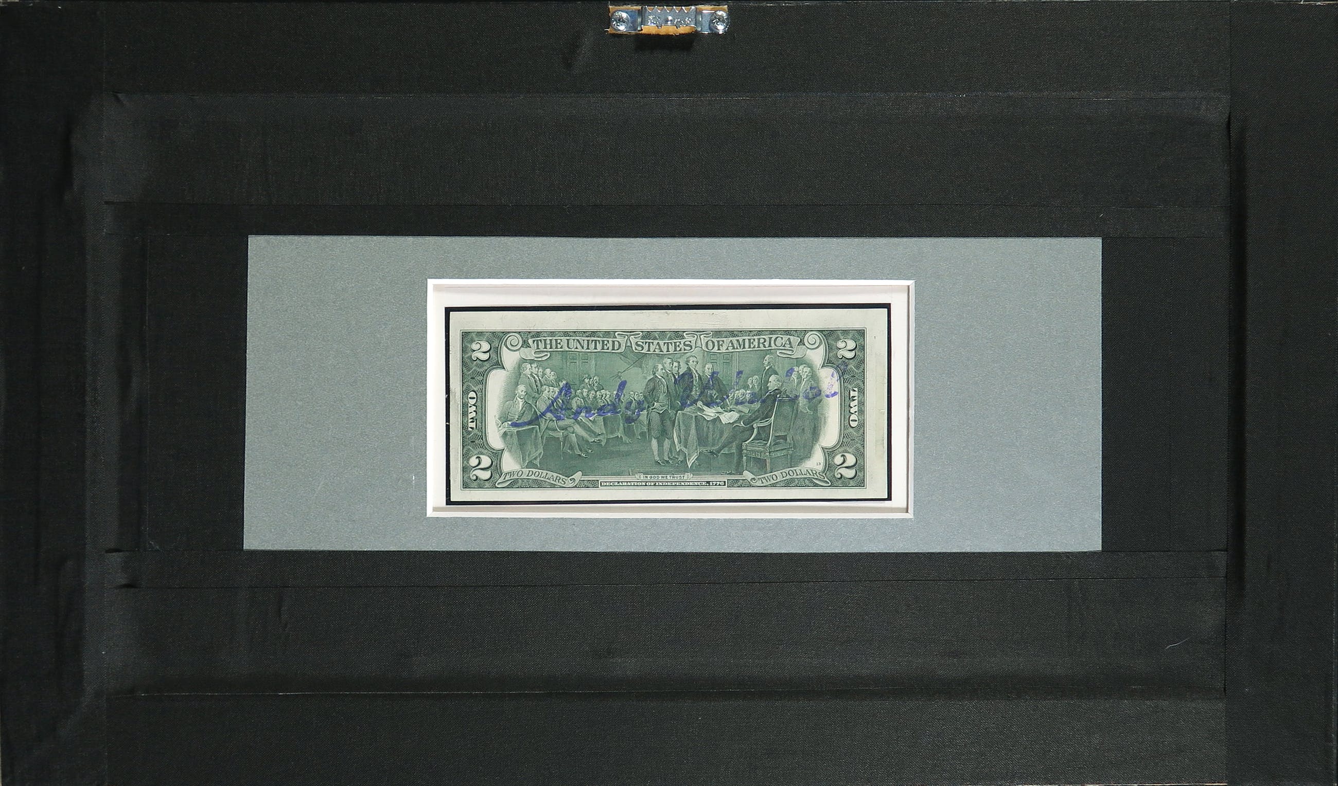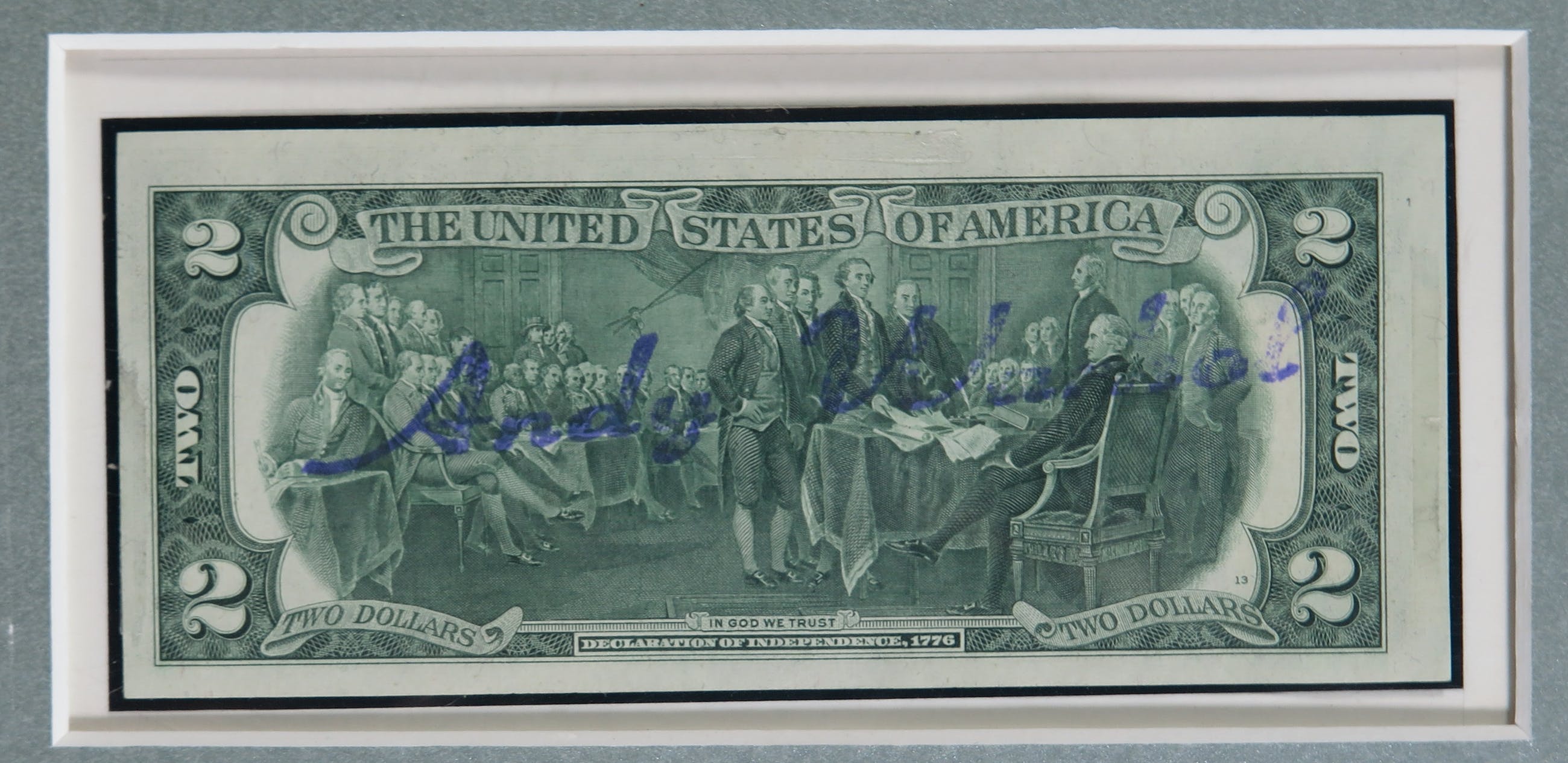 Handgesigneerde 2 Dollar Bill met postzegel, aan de andere zijde bedrukt met stempel van Warhol.