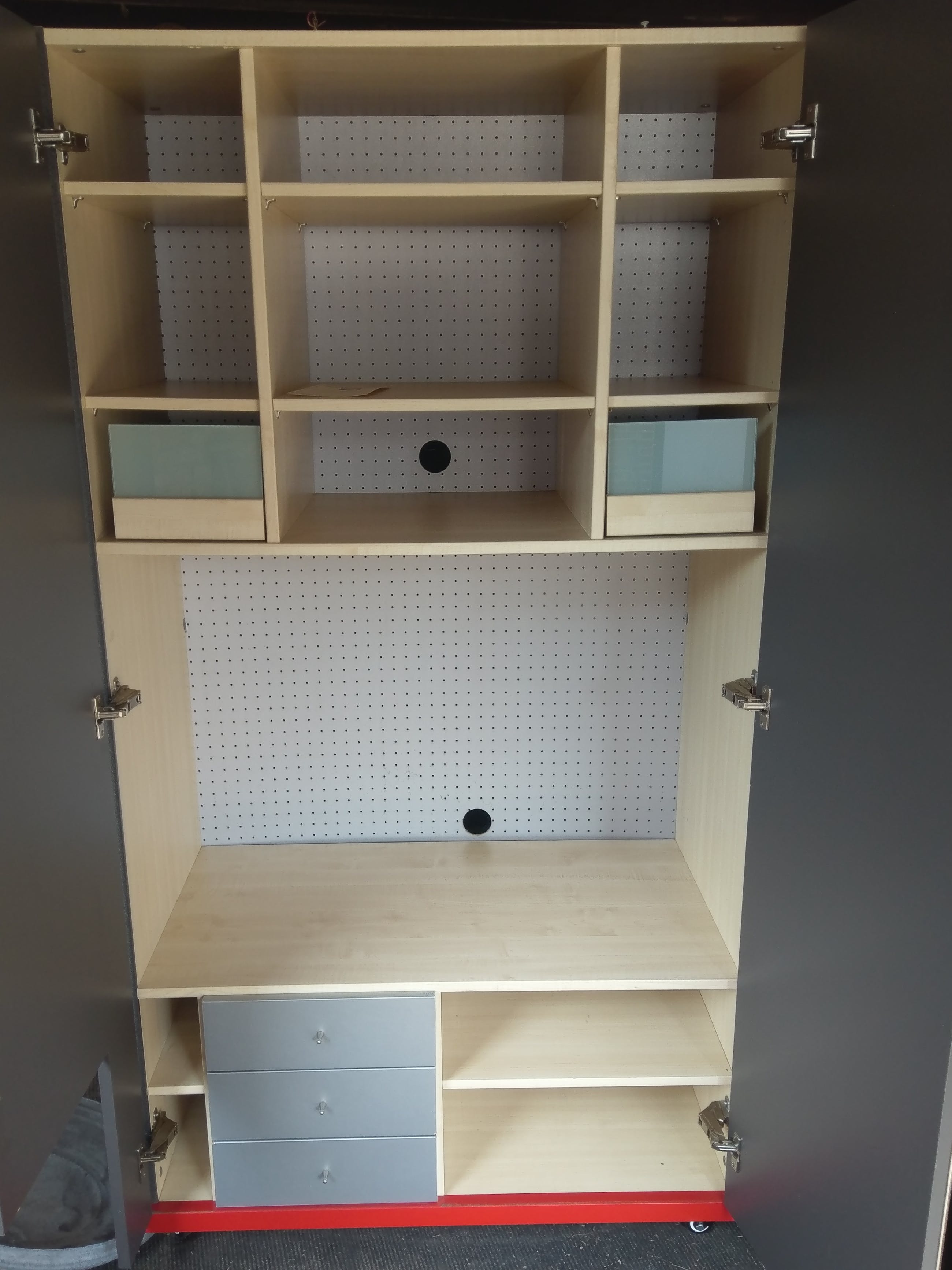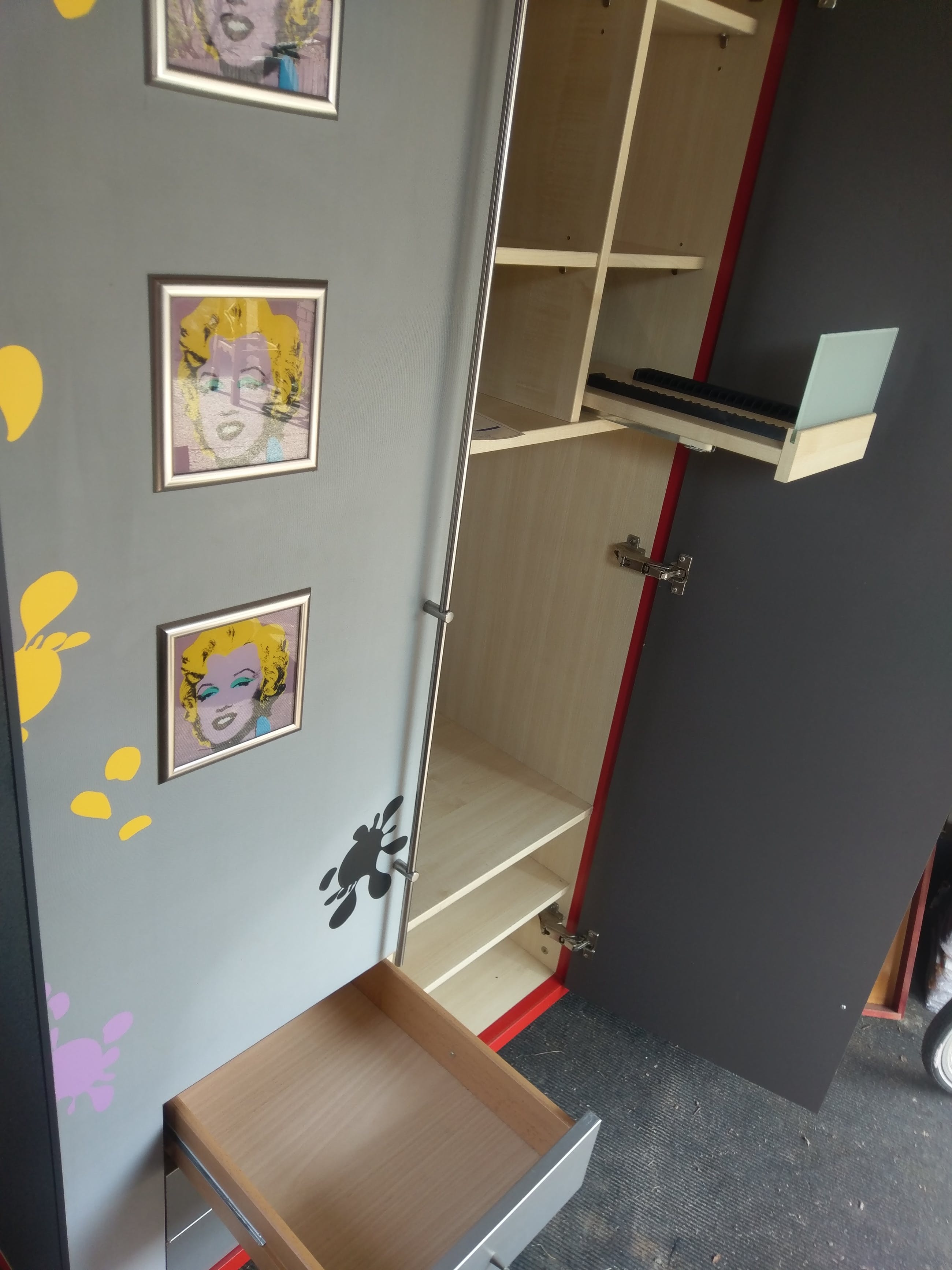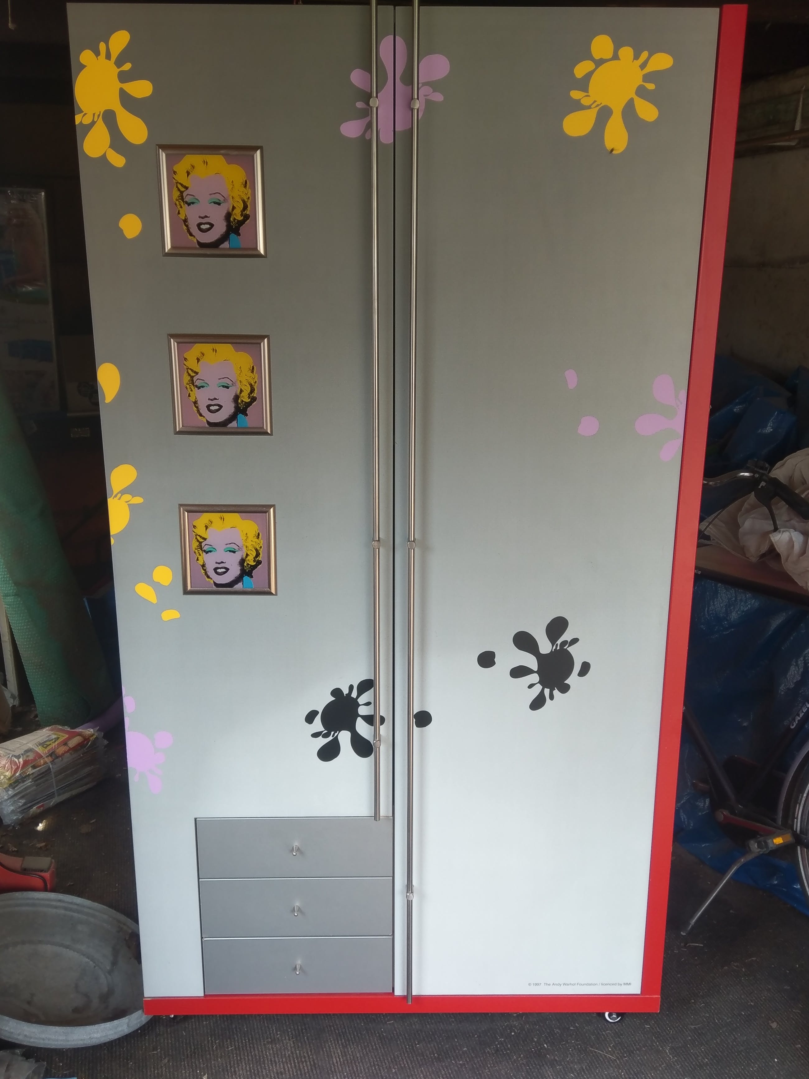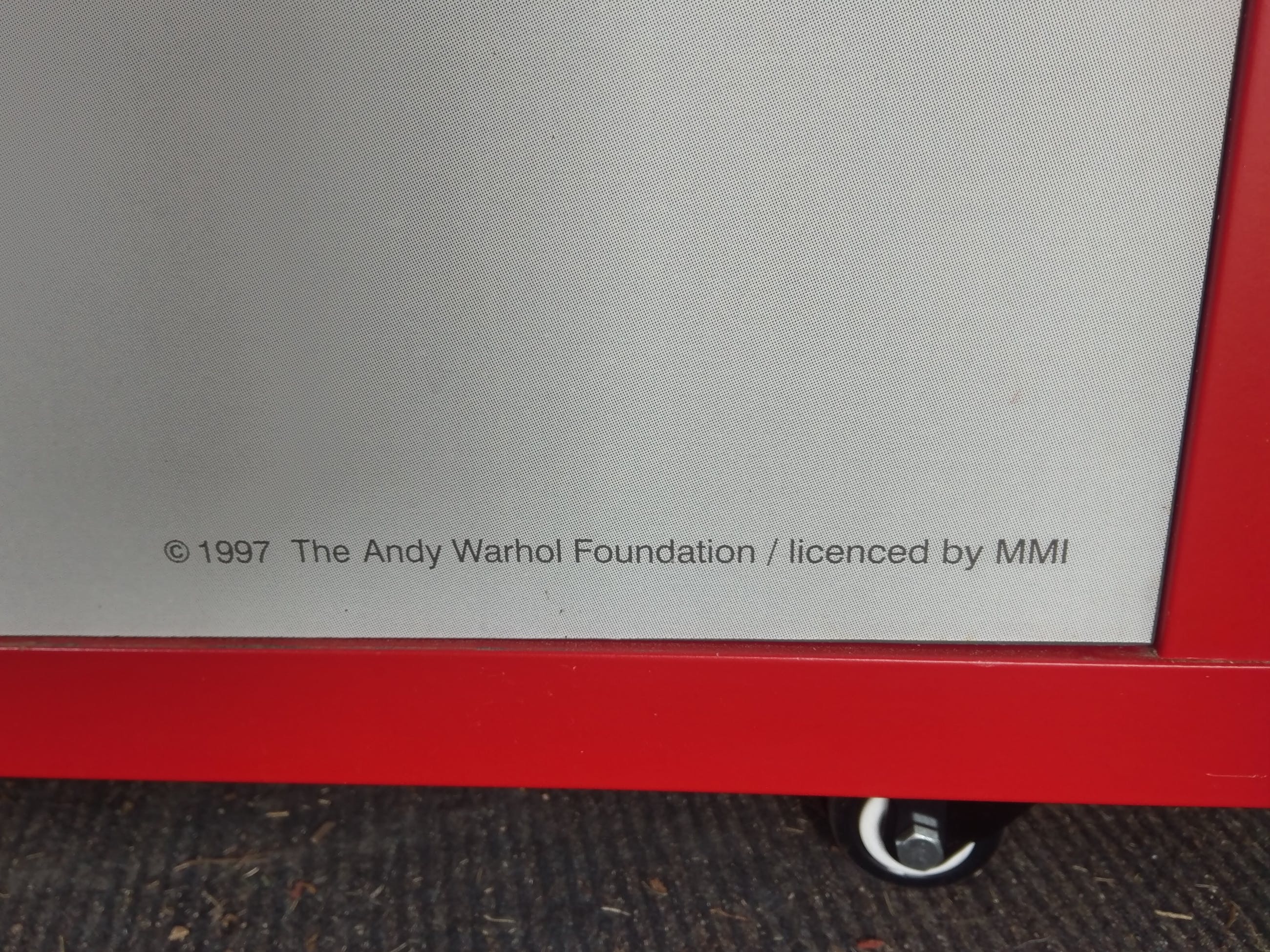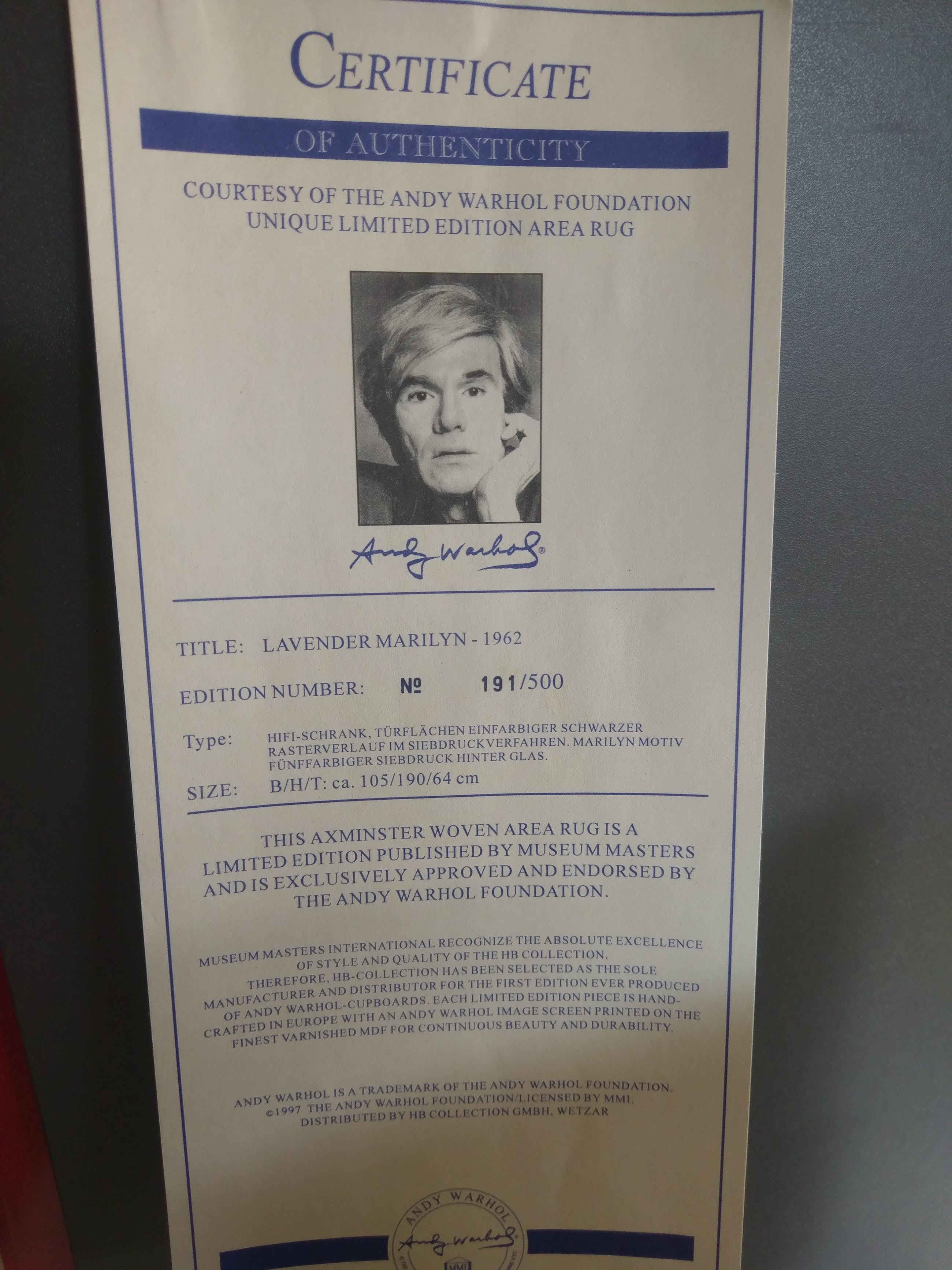 Grote, als hifi uitgevoerde gelimiteerde kast naar ontwerp van Andy Warhol. Vervaardigd in 1997 door HB Collection te Duitsland in een oplage van 500 stuks. De poten zijn vervangen door professionele zwenkwielen waarbij de voorste voorzien zijn van een voetrem. Door het gewicht van de kast is dit geen overbodige luxe. Het originele certificaat is aanwezig. (191/500) De kast is 23 jaar oud en heeft gebruikerssporen. De kleine oneffenheden aan de voorzijde van de kast zijn gemaskeerd door de "verfspat stickers" later aangebracht in de kleuren van de zeefdruk portretten van Marilyn Monroe. Alle onderdelen zijn aanwezig (op de originele poten na) en de kast zelf is een ware eyecatcher. Om eventuele teleurstellingen te voorkomen kunt u de kast te allen tijde komen bezichtigen in Weert.