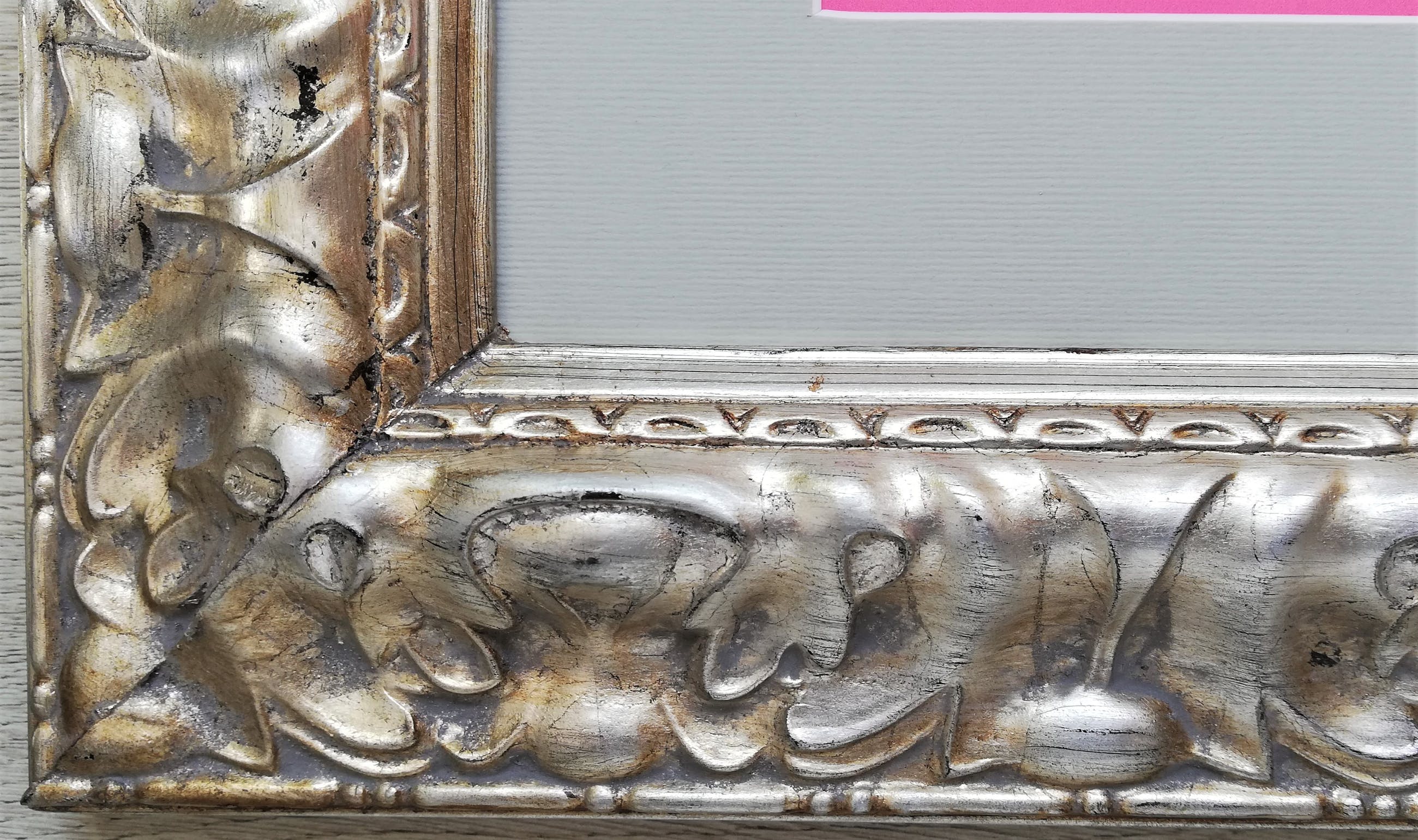 In goede conditie.In een zilver kleurige ornament lijst, 50 x 50 cm