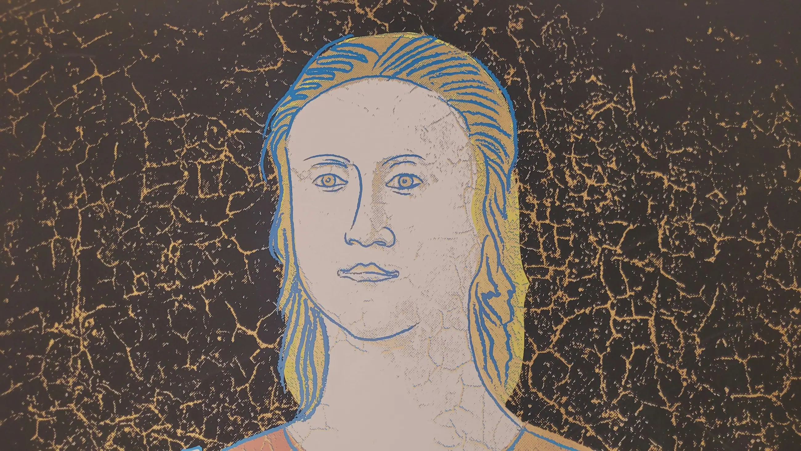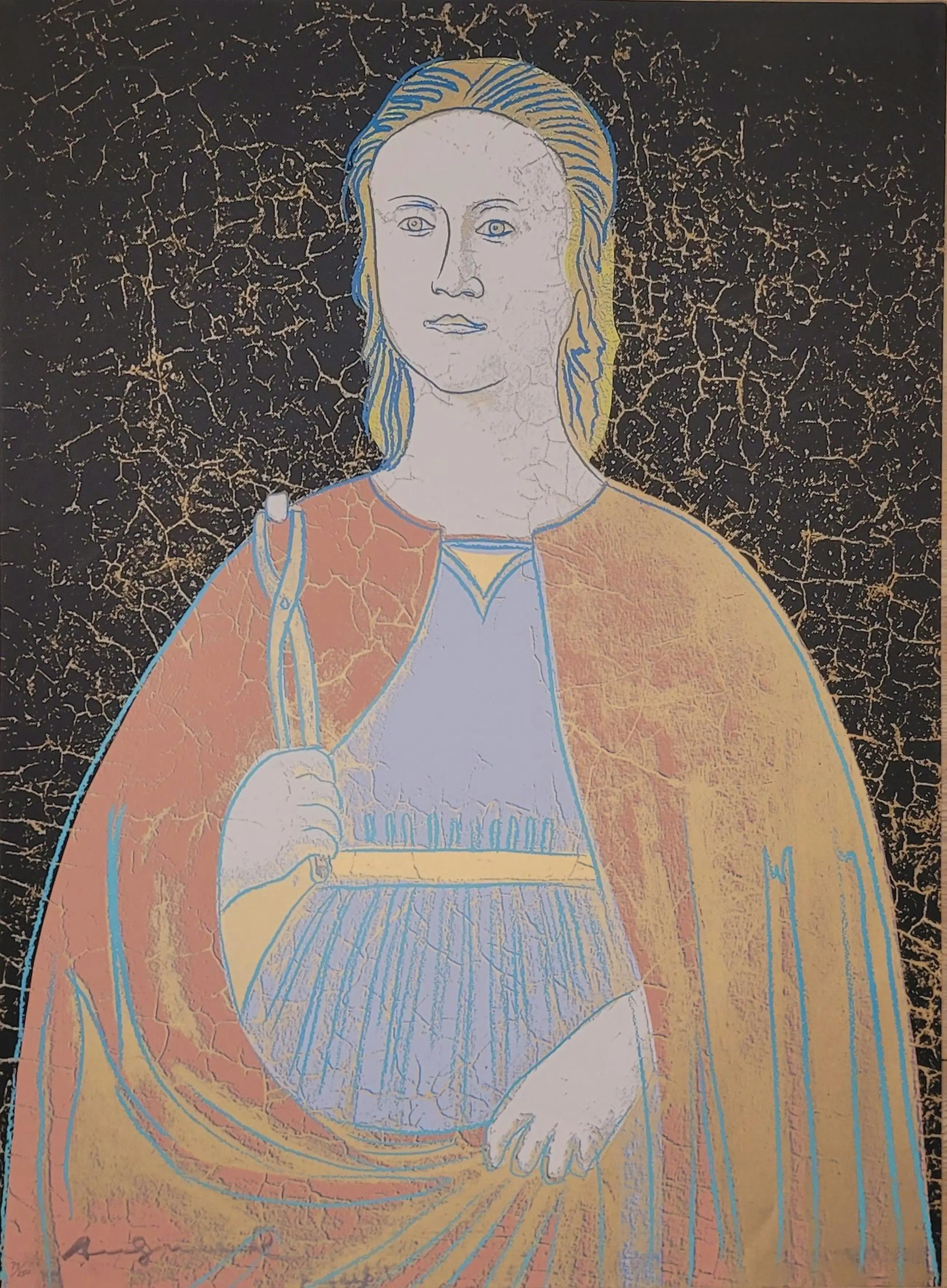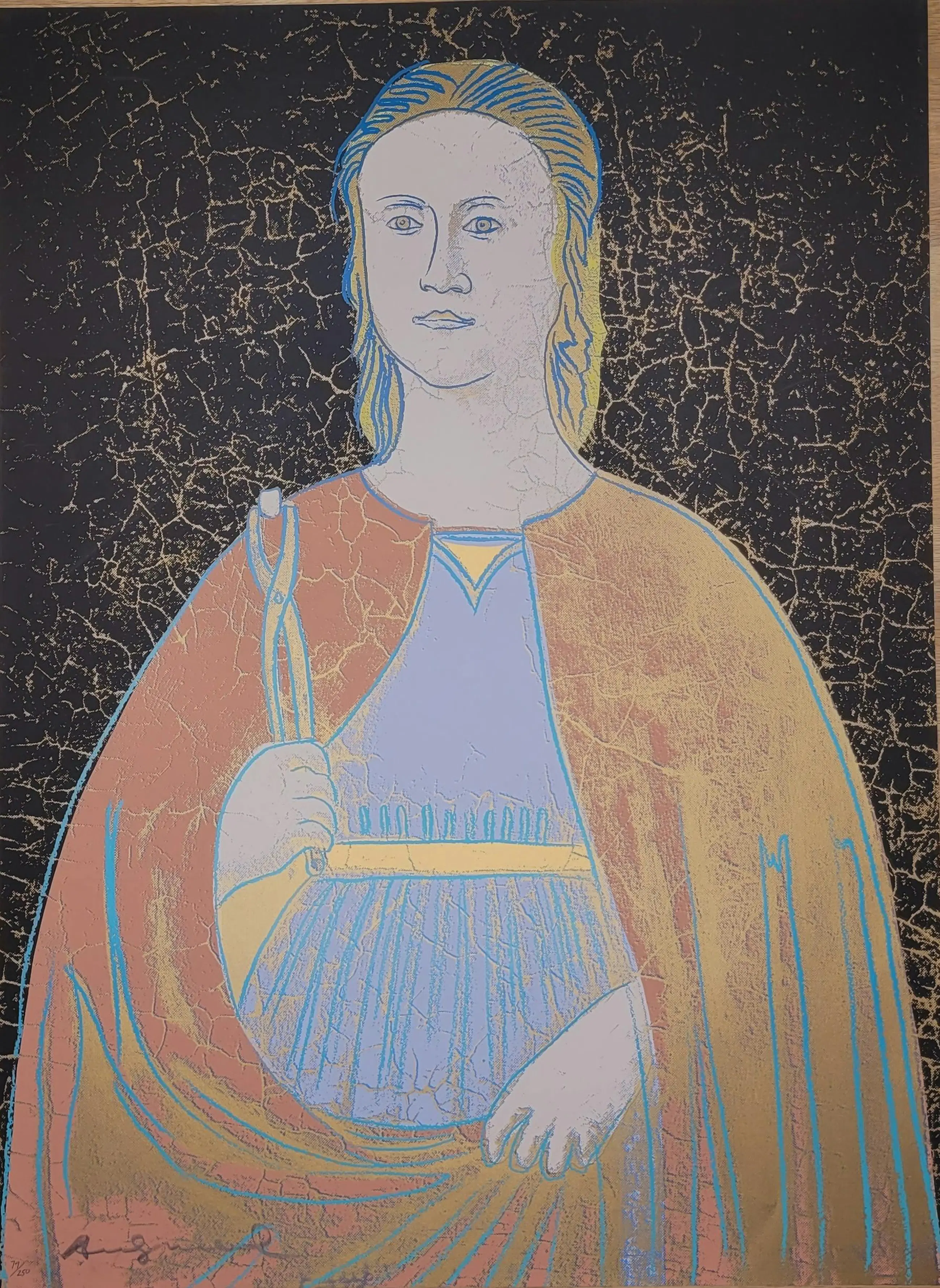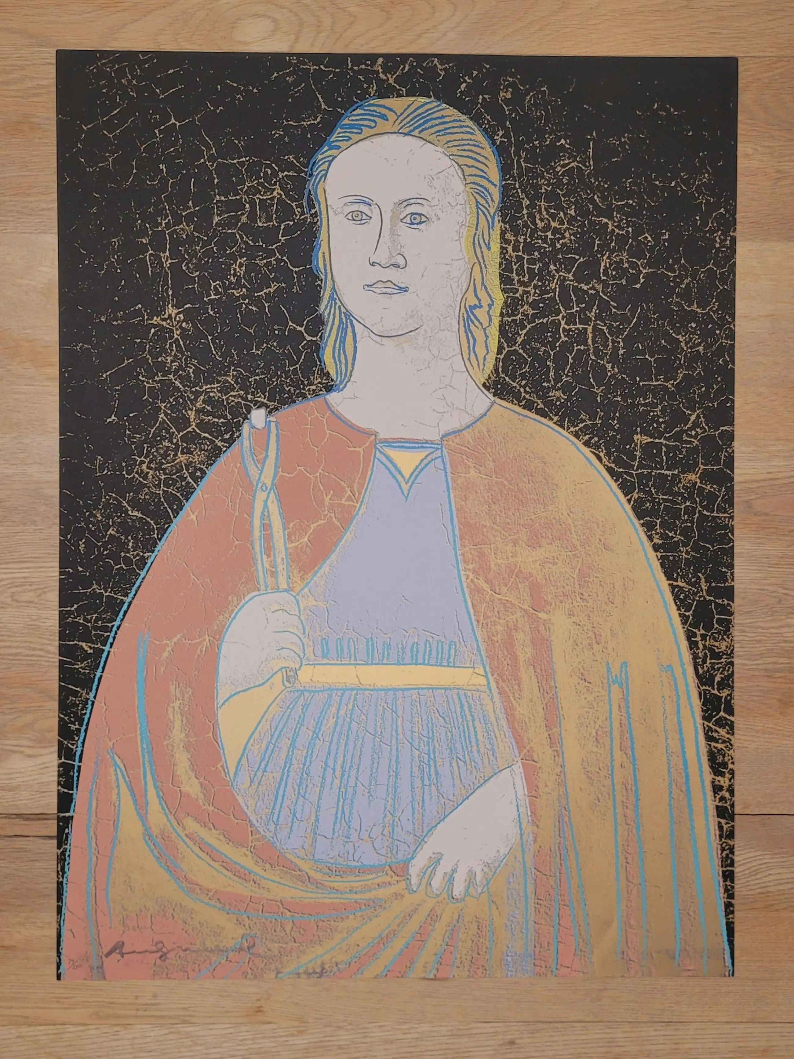 Warhol had een levenslange fascinatie voor iconen: filmsterren, merken, mythes — en heiligen. In Saint Apollonia neemt hij een 15e-eeuws renaissancebeeld als vertrekpunt en hermaakt het tot pure Warhol: vlak, grafisch, explosief van kleur, met een goud-zwart craquelé dat verwijst naar de ouderdom van het origineel én tegelijk hypermodern oogt. Het originele werk van Piero della Francesca : Saint Apollonia (ca. 1460) bevindt zich in de National Gallery of Art (Washington D.C.).