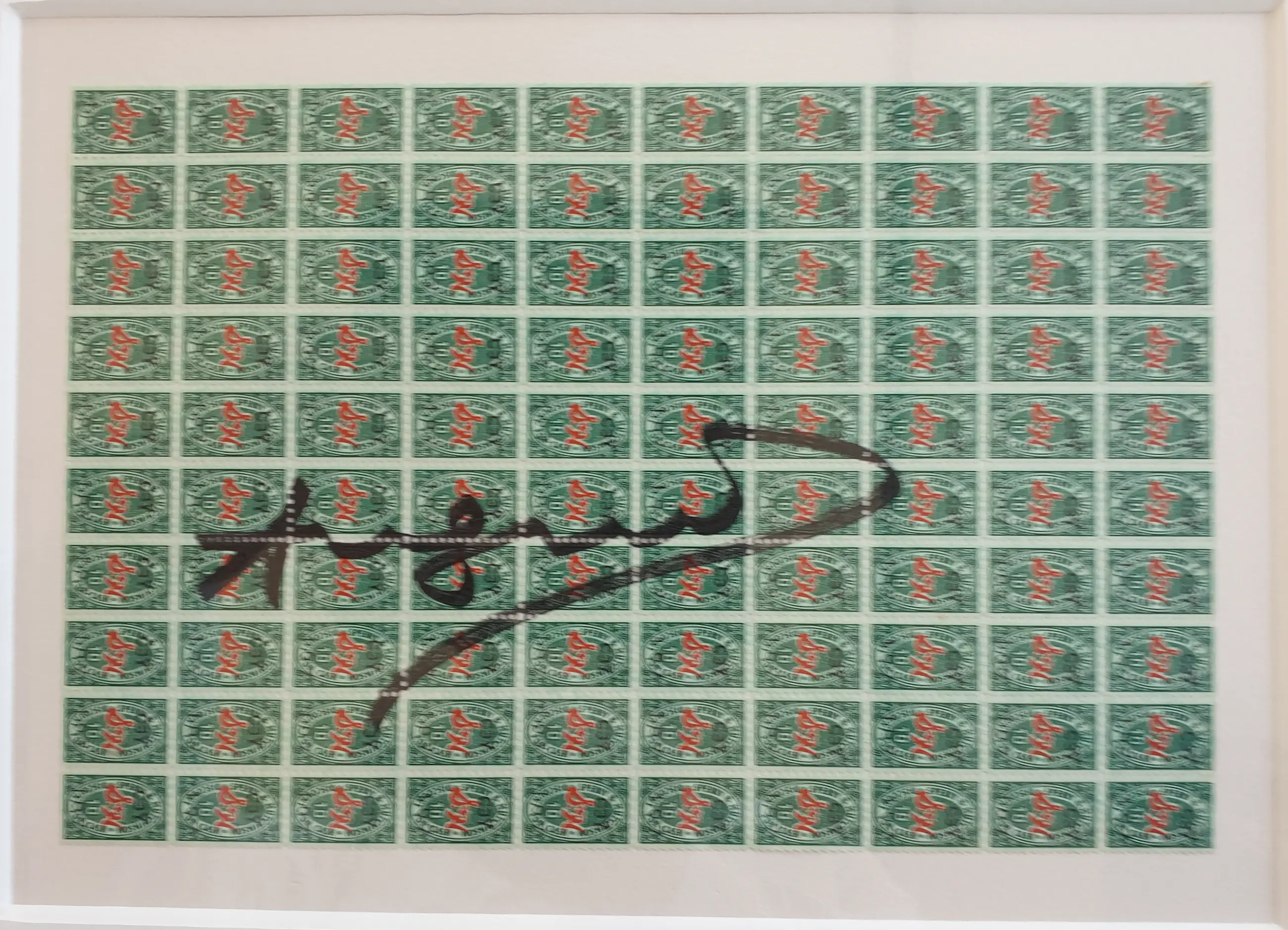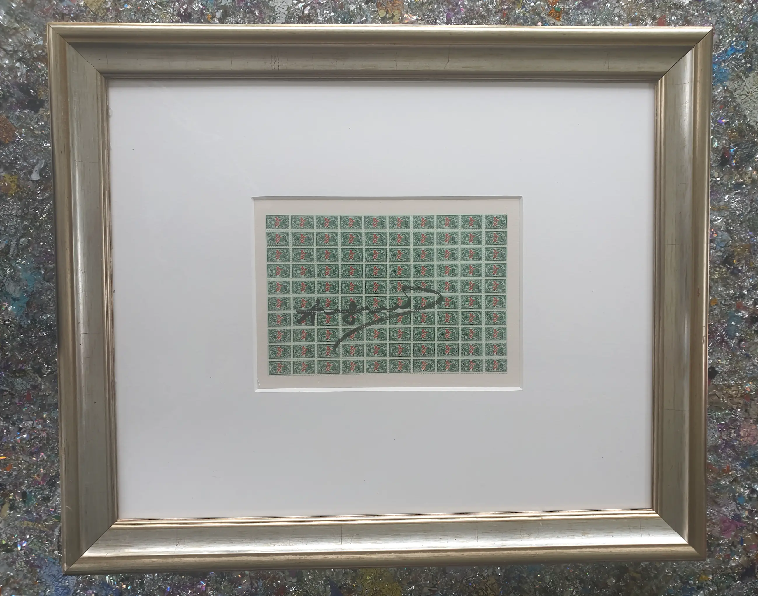 Gelegenheidswerk van Andy Warhol (1928 - 1987) uit 1965. Warhol heeft een offset litho van de S & G stamps gemaakt in een editie van 300. Sommige daarvan zijn gesigneerd en genummerd. Er waren ook 6000 gevouwen exemplaren die verstuurd werden als aankondiging van een Warhol tentoonstelling in het Institute of Contemporary Art in Philadelphia in 1965. (catalogue Raisonné 1962 - 1987, pagina 57, nummer II.9) Dit kunstwerk is een echt velletje S & H Stamps dat bij een opening of andere signeer sessie van Warhol is gesigneerd. Het komt uit een betrouwbare bron/ verzamelaar die via Kunstveiling zijn werk verkoopt. Formaat velletje is 14,5 x 22 cm. Lijst is 48 x 58 cm. wordt aangetekend verzonden.
