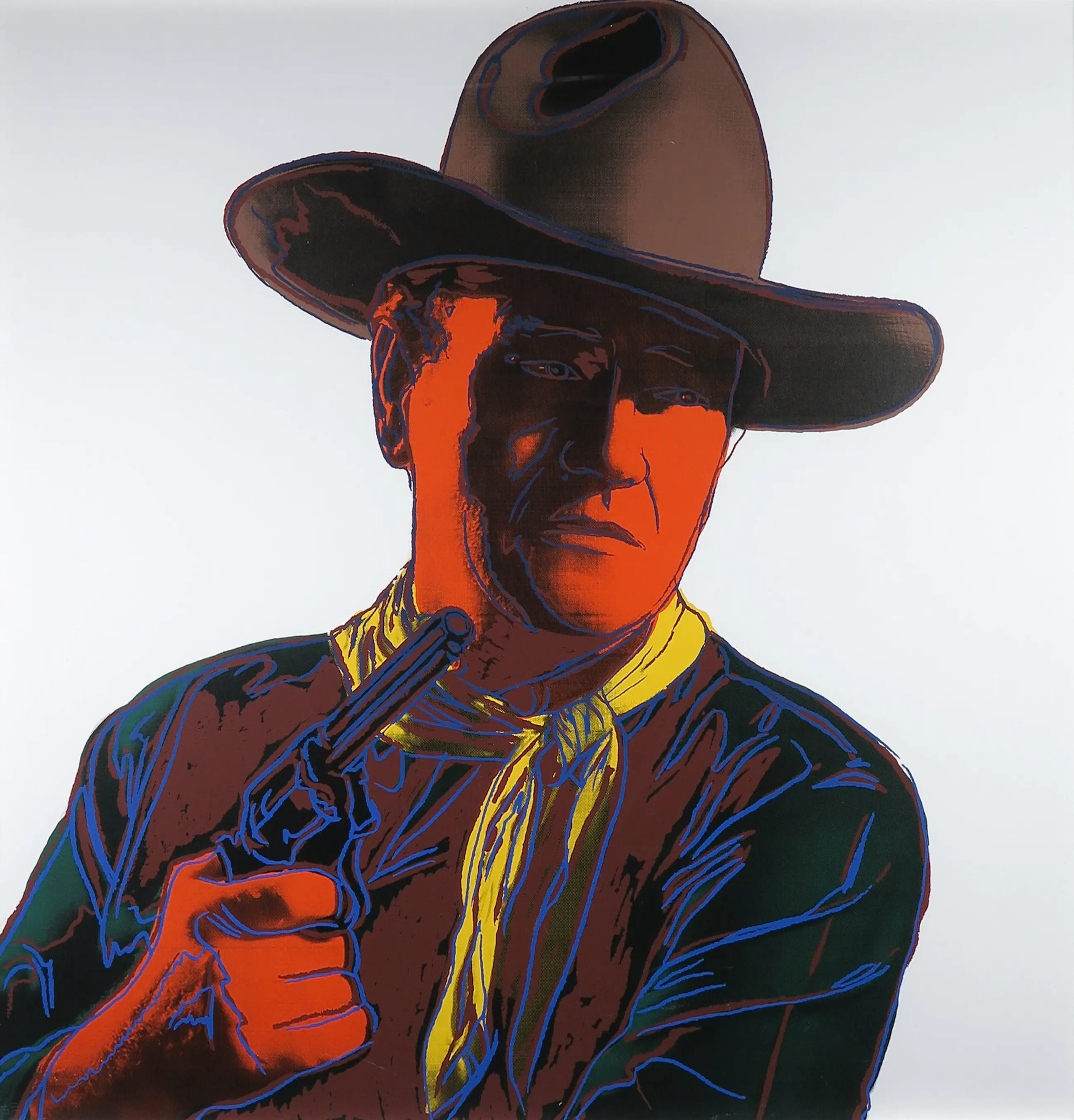 Zeefdruk van John Wayne uit de serie Cowboys & Indians door Andy Warhol. Gemaakt naar een publiciteitsfoto van de film ''The Man who shot Liberty Vance'' uit 1962.