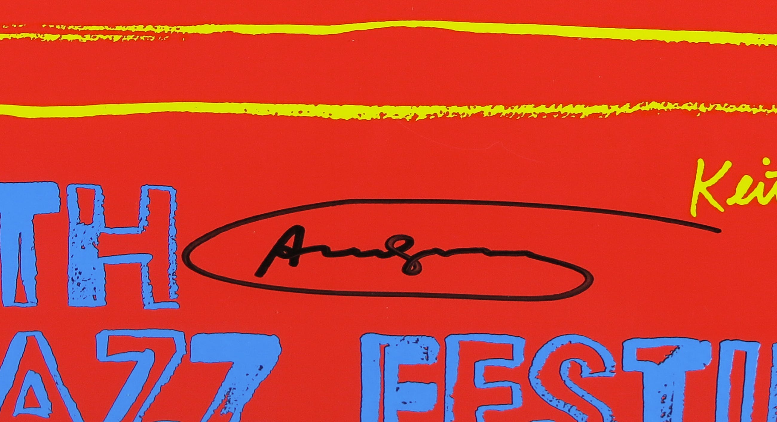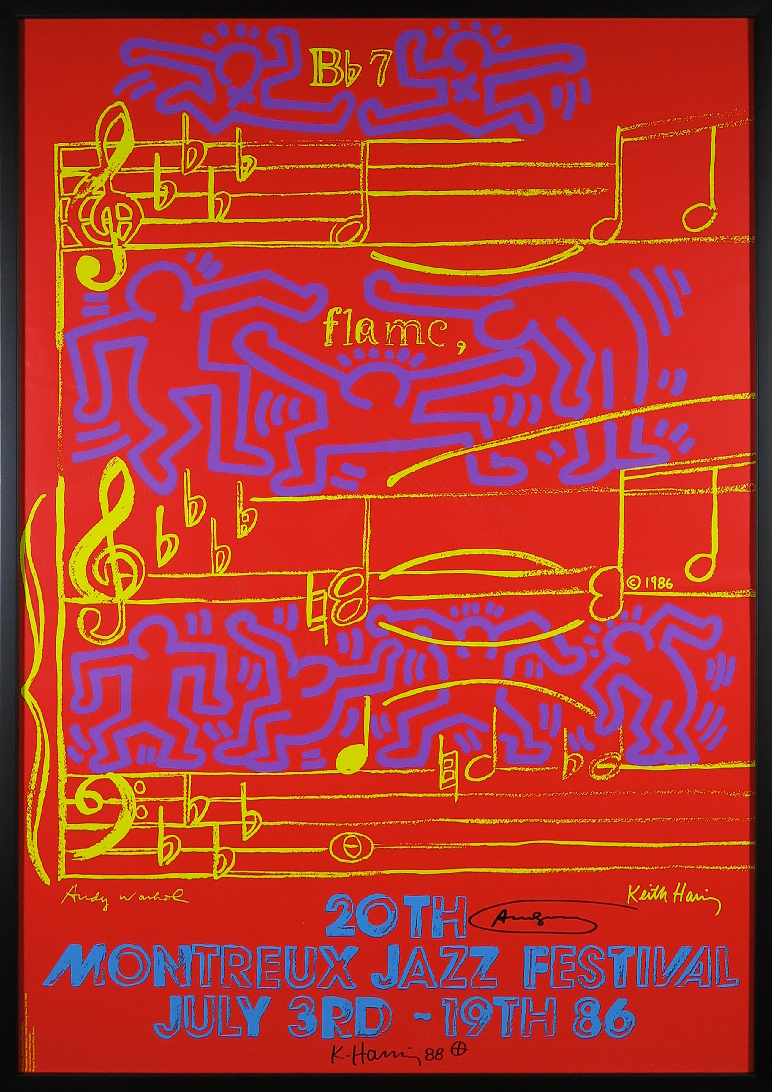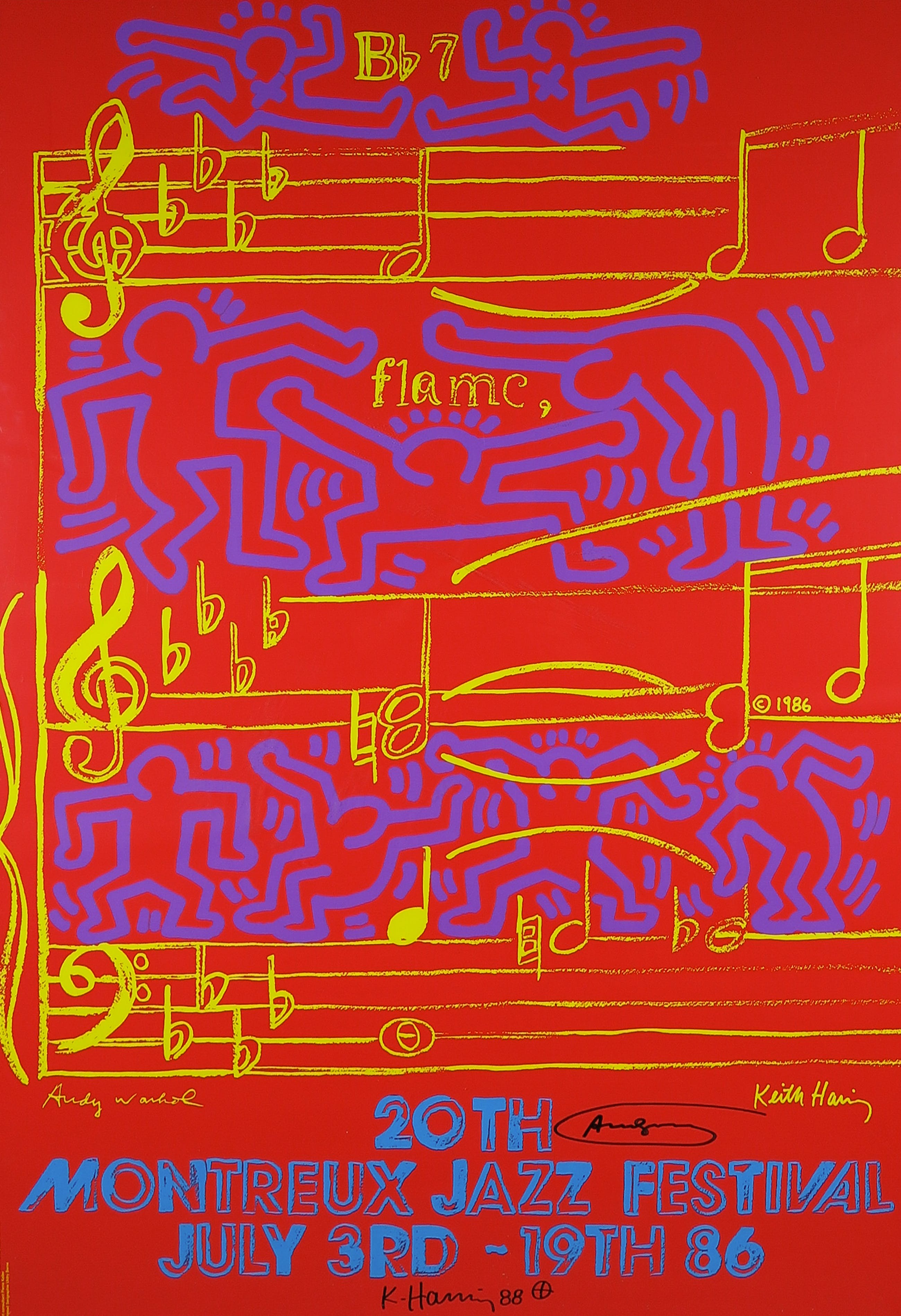 Felgekleurde zeefdruk, ontworpen door Andy Warhol en Keith Haring. Door Warhol gesigneerd naast '20th' en door Haring gesigneerd in 1988, langs de onderste rand. Ontworpen voor de 20ste editie van het Montreux Jazz Festival in 1986.