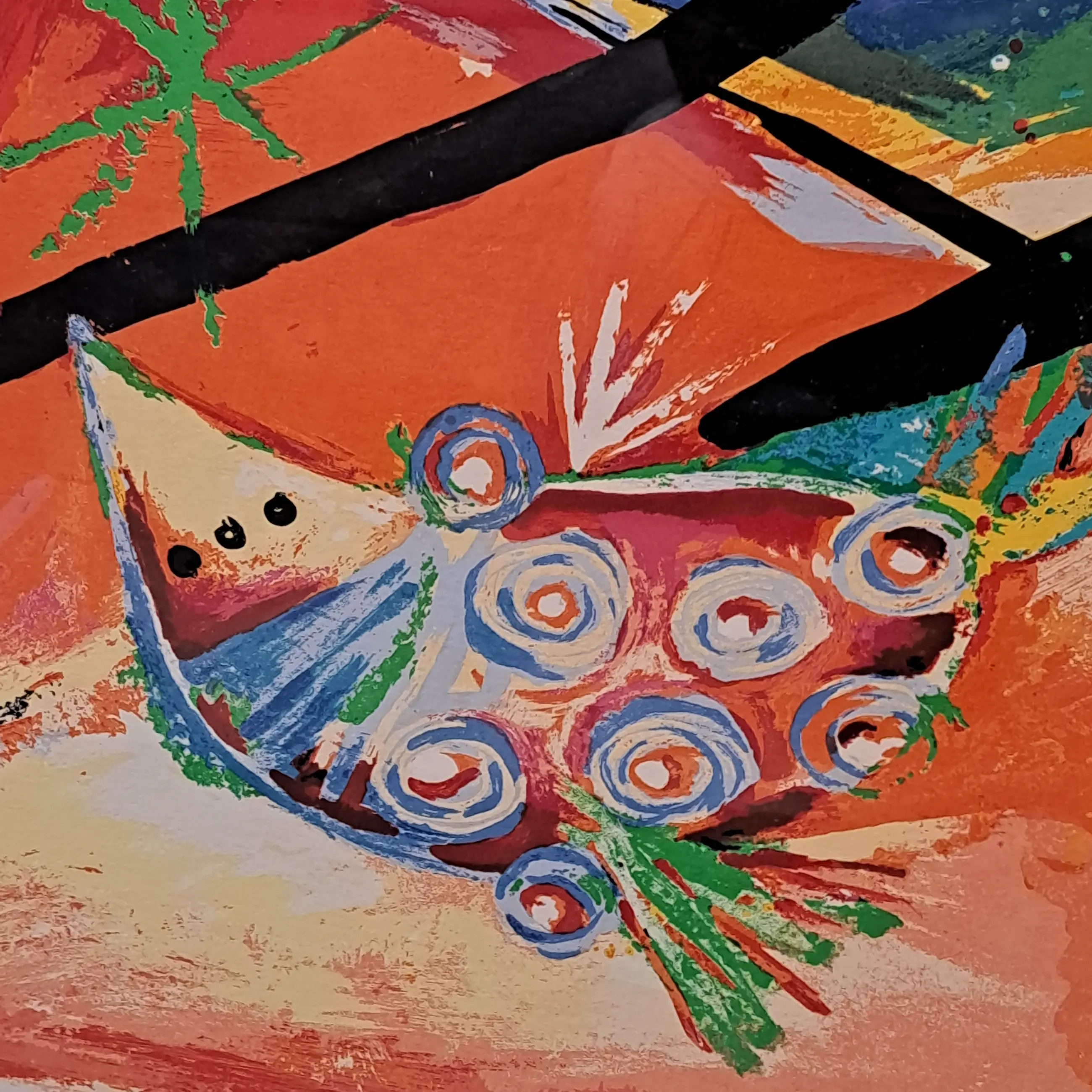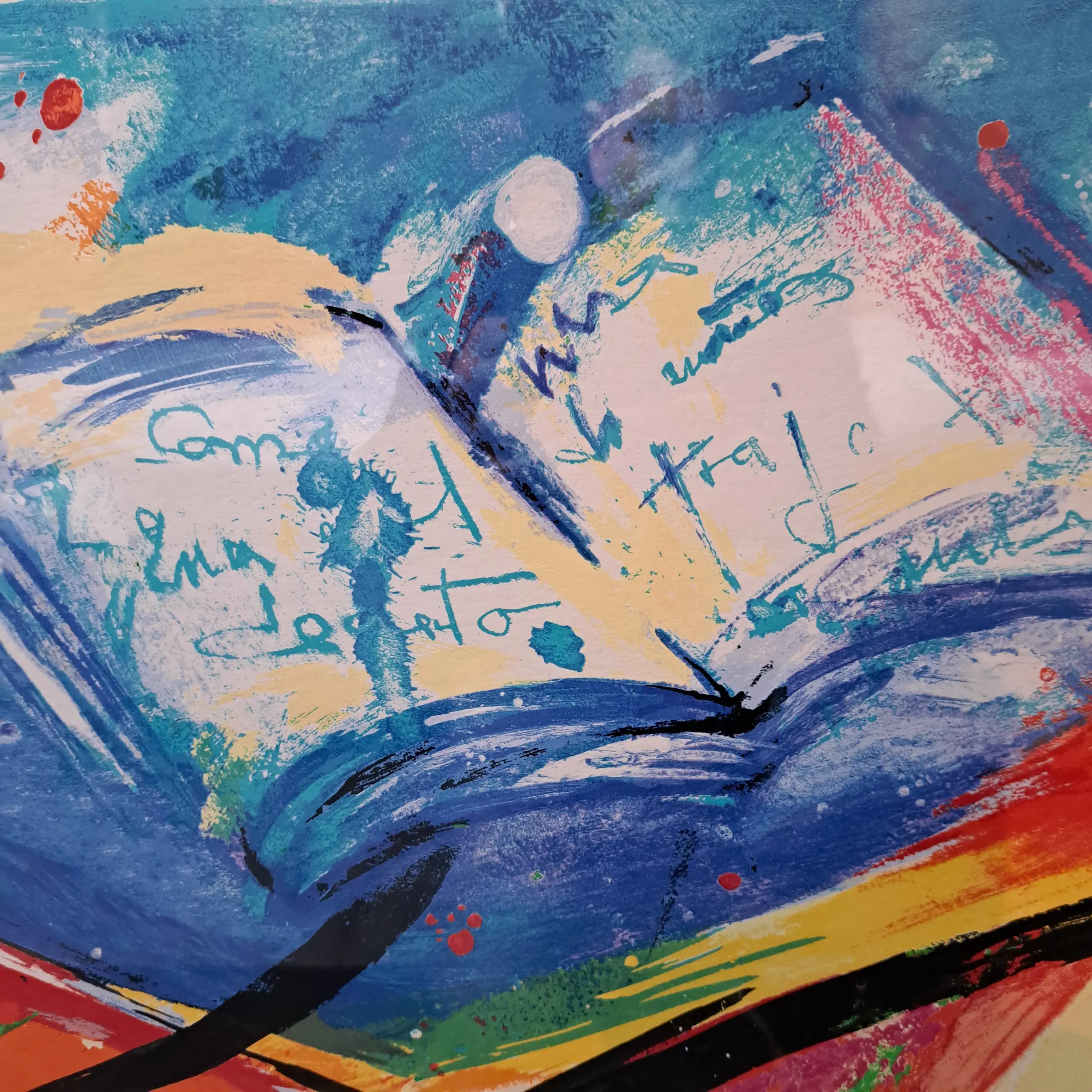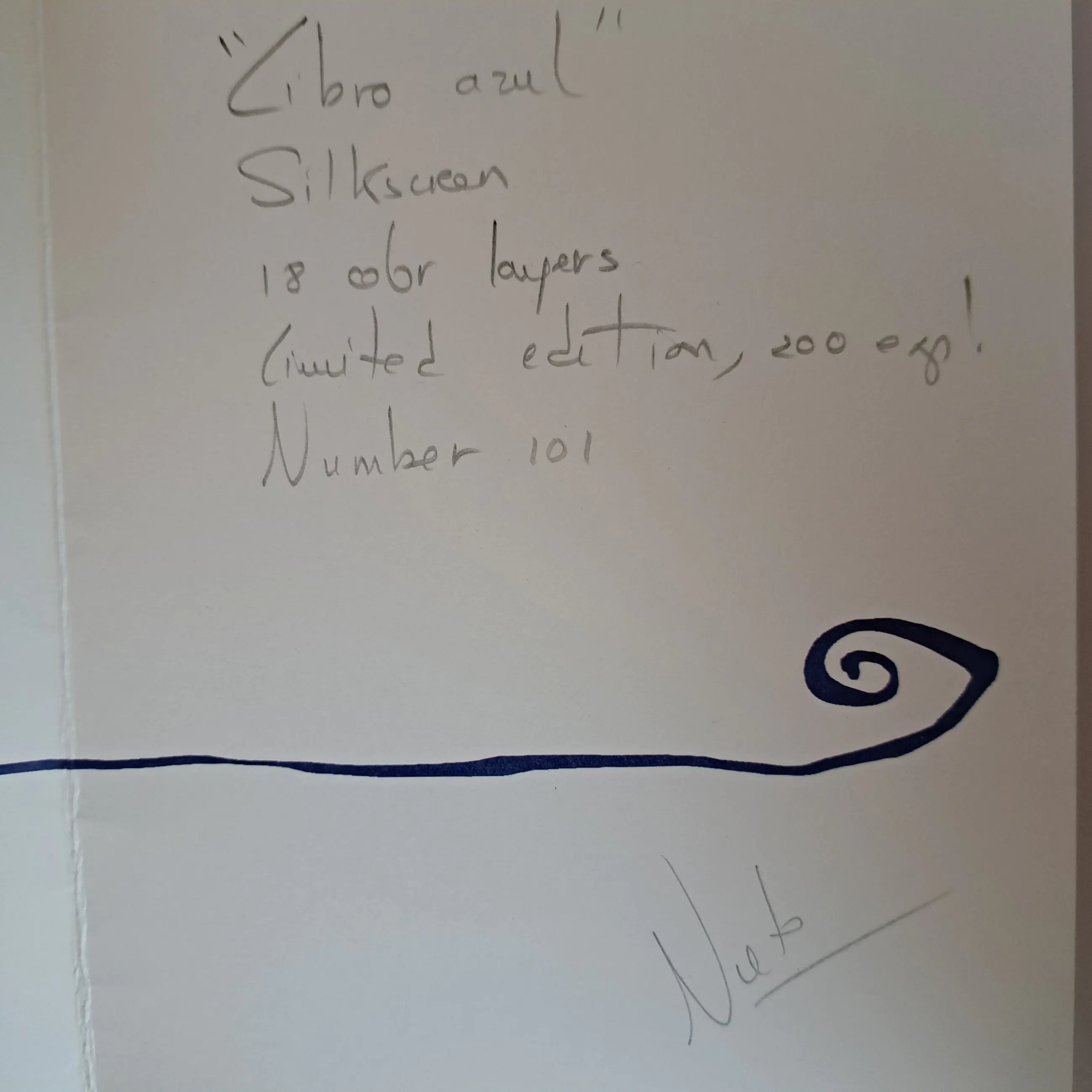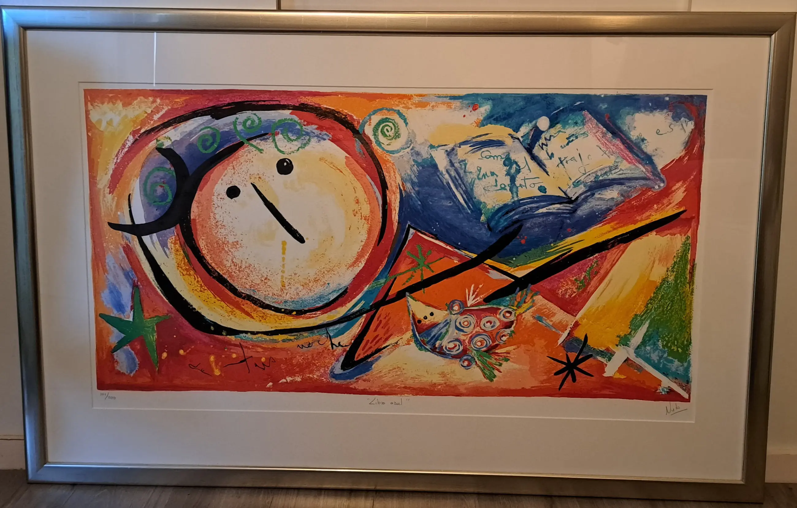 Libro azul of vertaald Blauw boek. Erg fleurige zeefdruk. Zuurvrij ingelijst met passepartou in zilveren lijst. De lijst is niet strak zilver maar heeft iets robuusts doordat er subtiele rode vegen in verwerkt zijn die je alleen van dichtbij ziet. Inclusief certificaat.