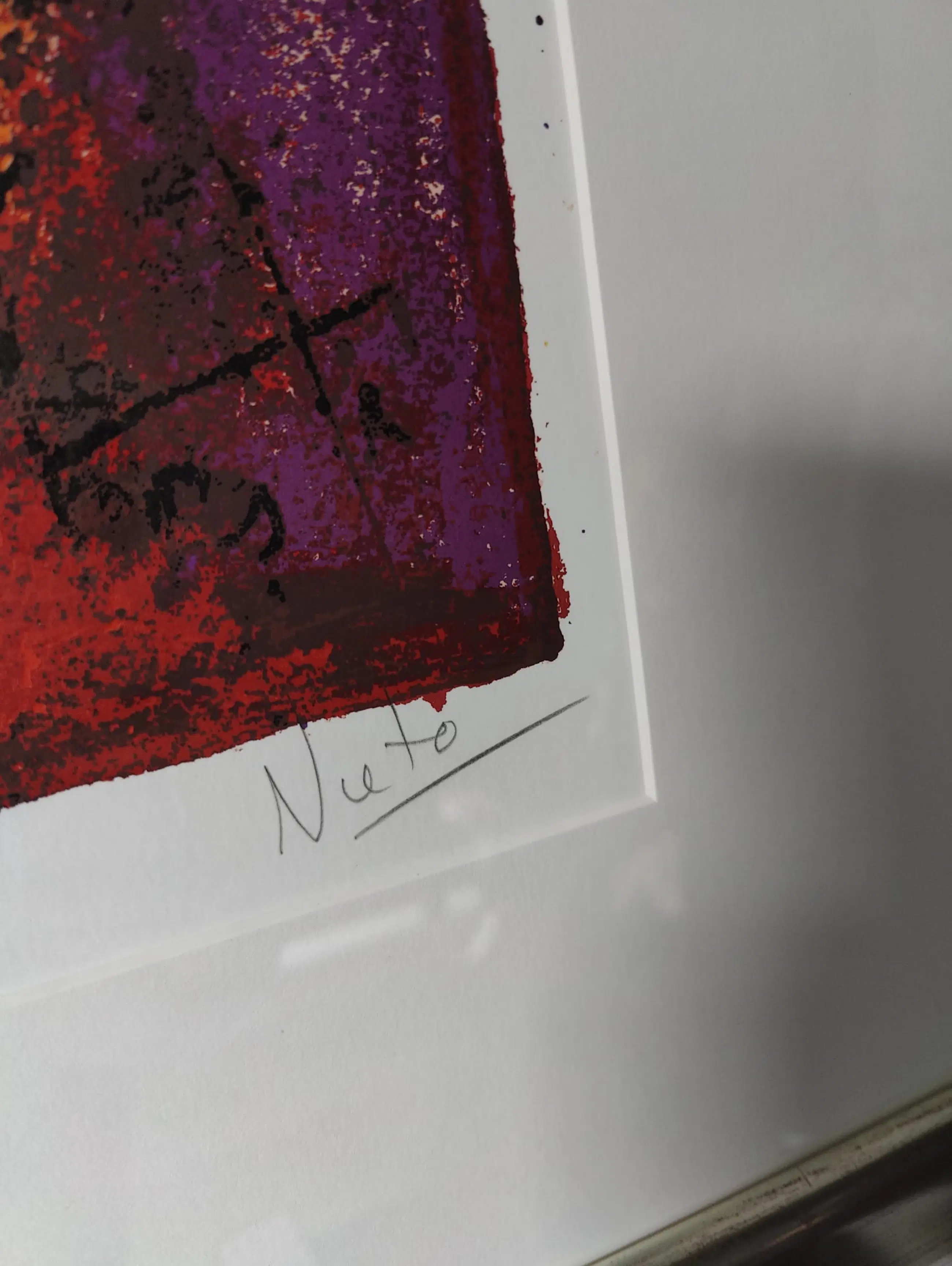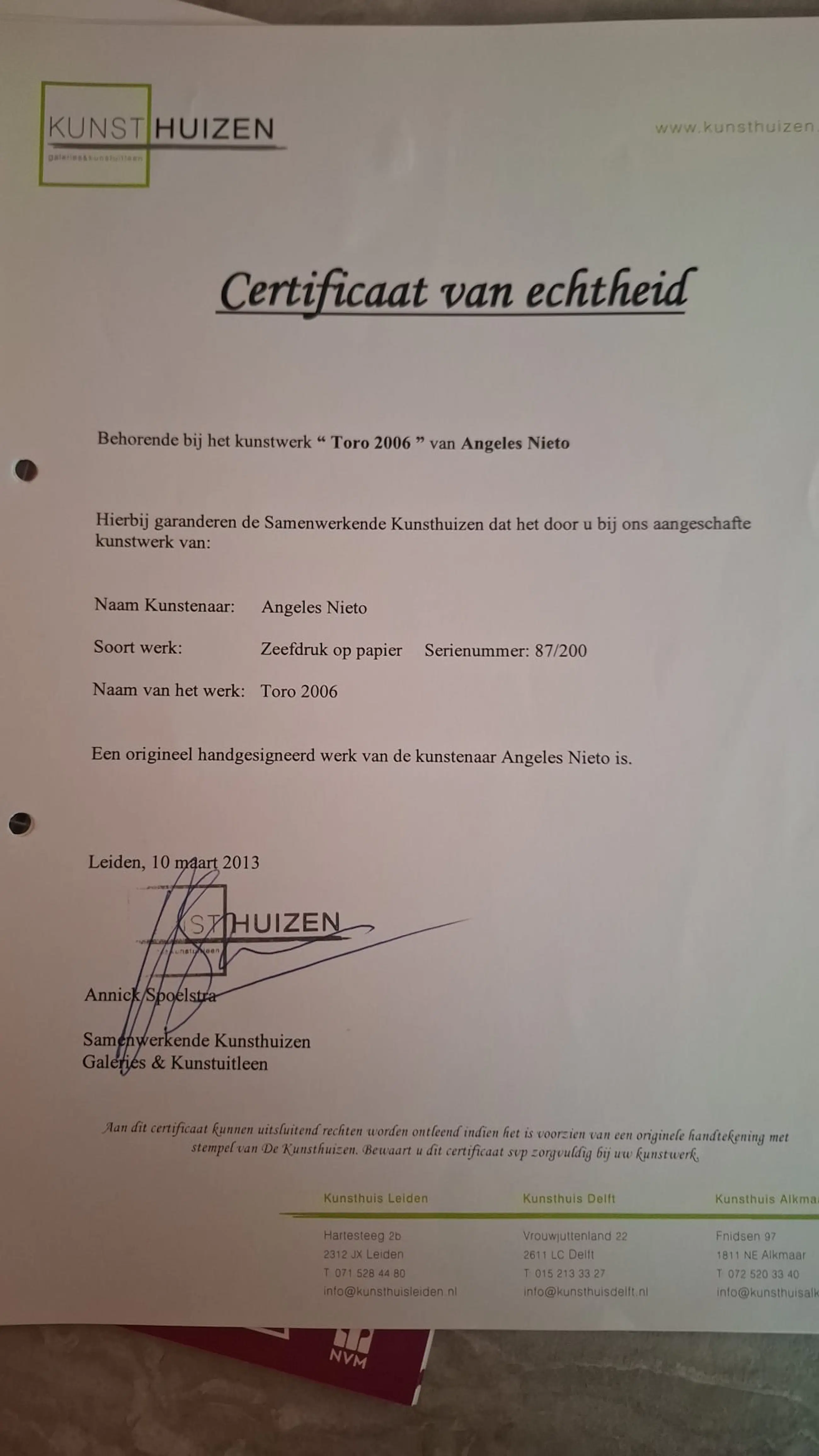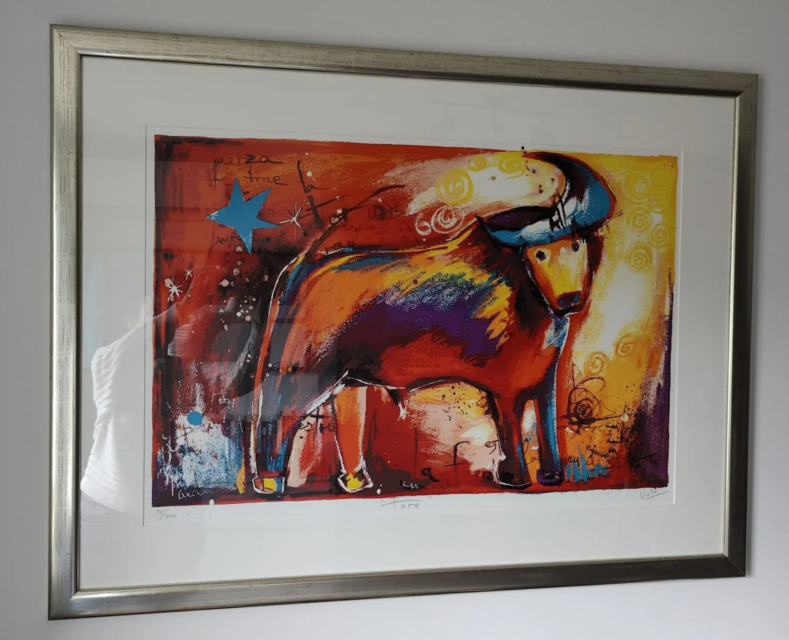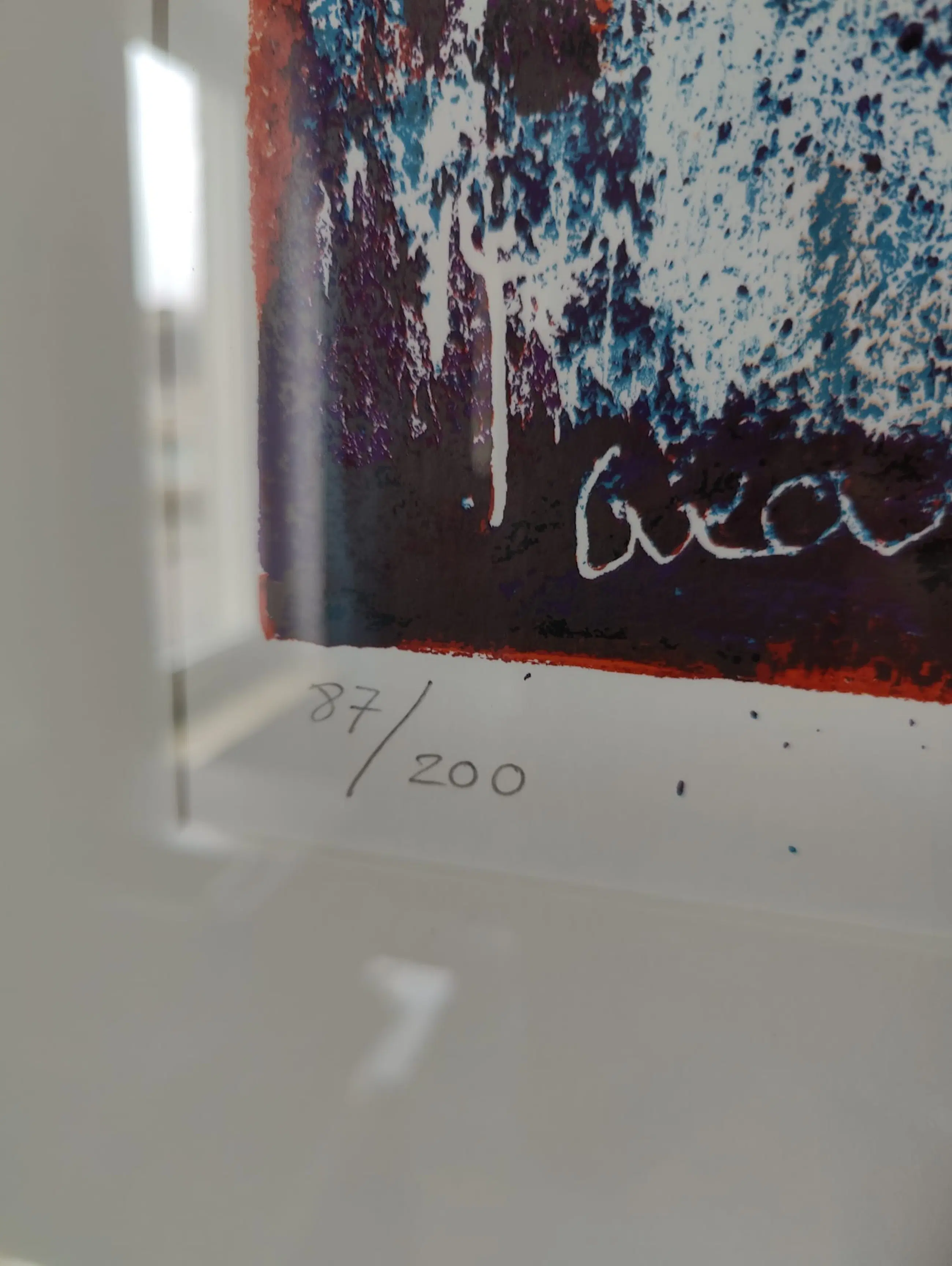 Prachtig kleurrijk werk in zeer goede staat. Overcompleet ivm verhuizing. Het werk is ingelijst in een zilverkleurige lijst door Kunsthuizen, waar het ook is aangeschaft. Het betreft zeefdruk 87/200, inclusief echtheidscertificaat.