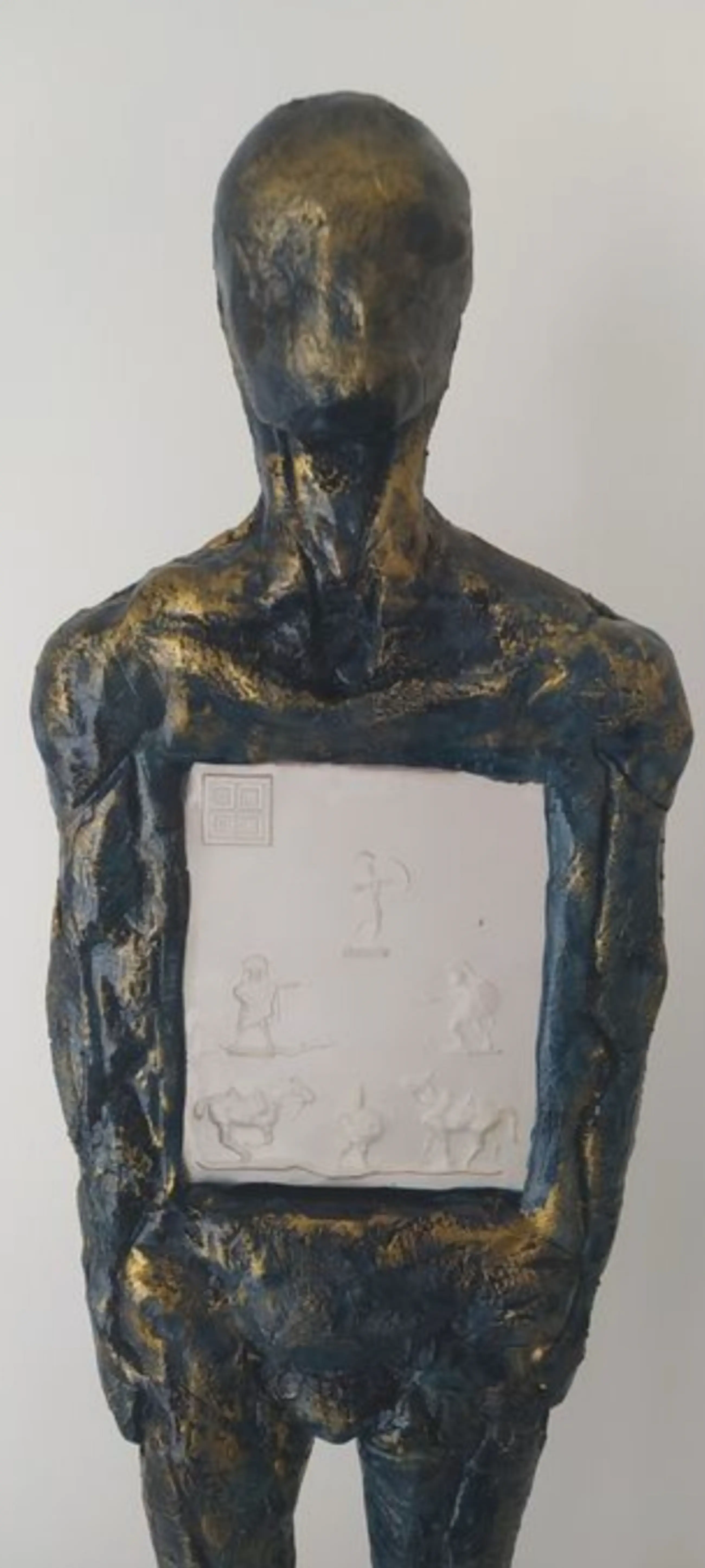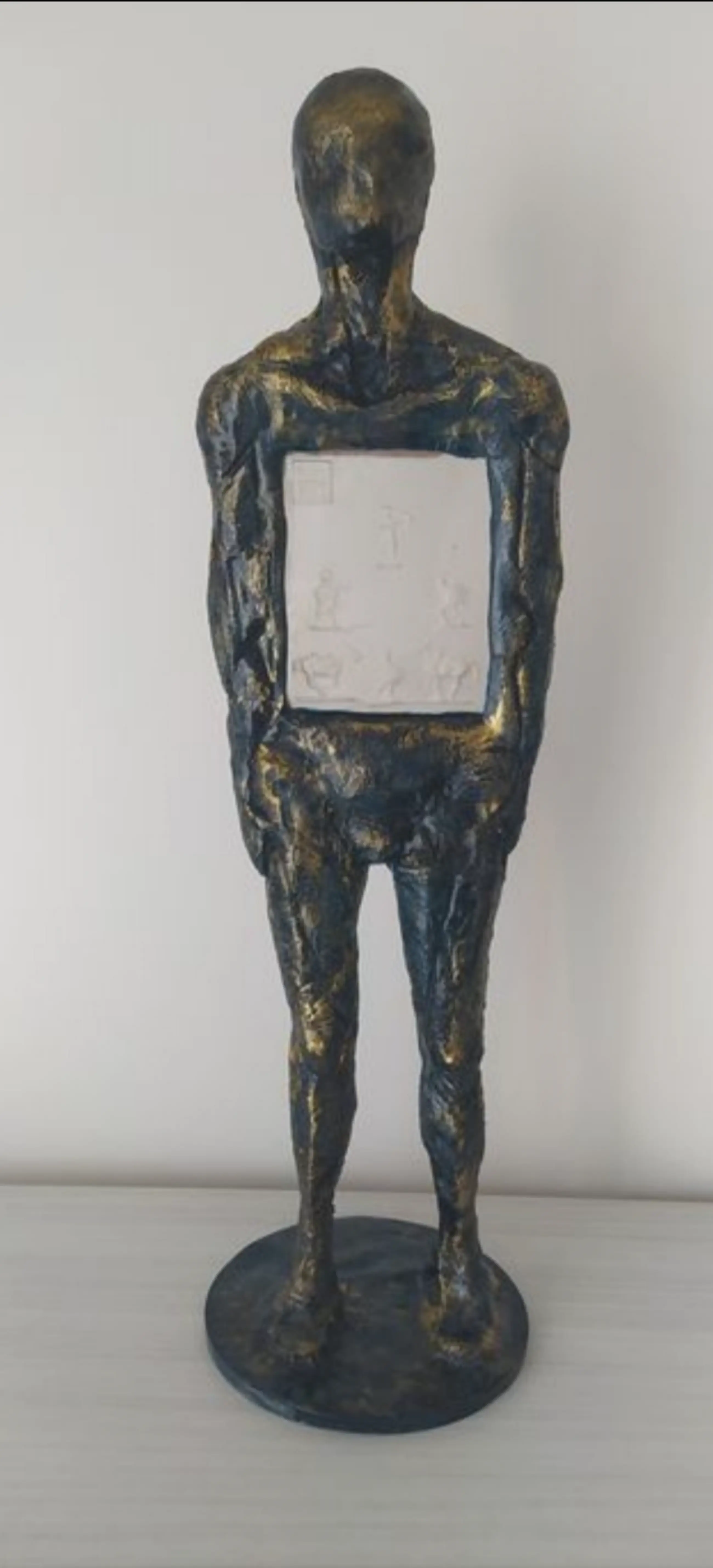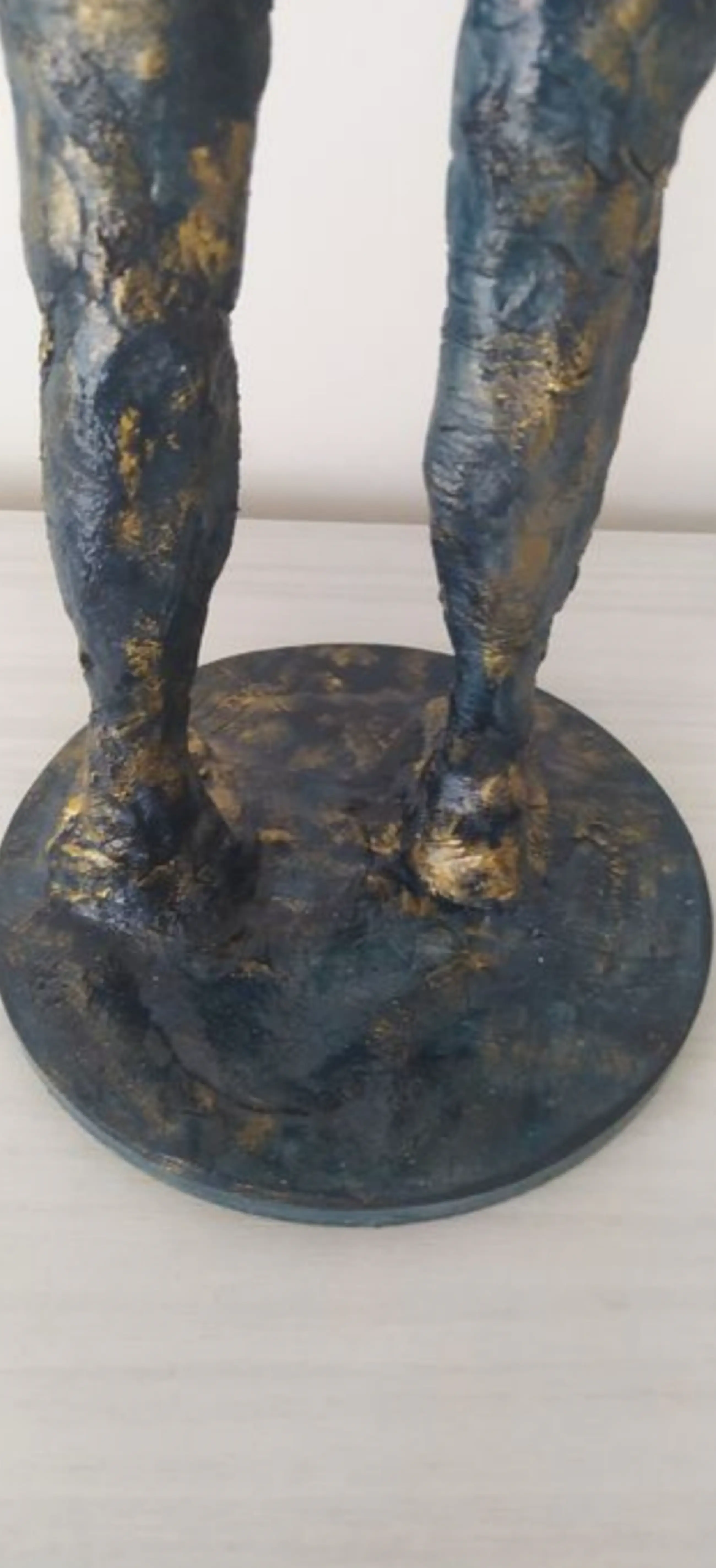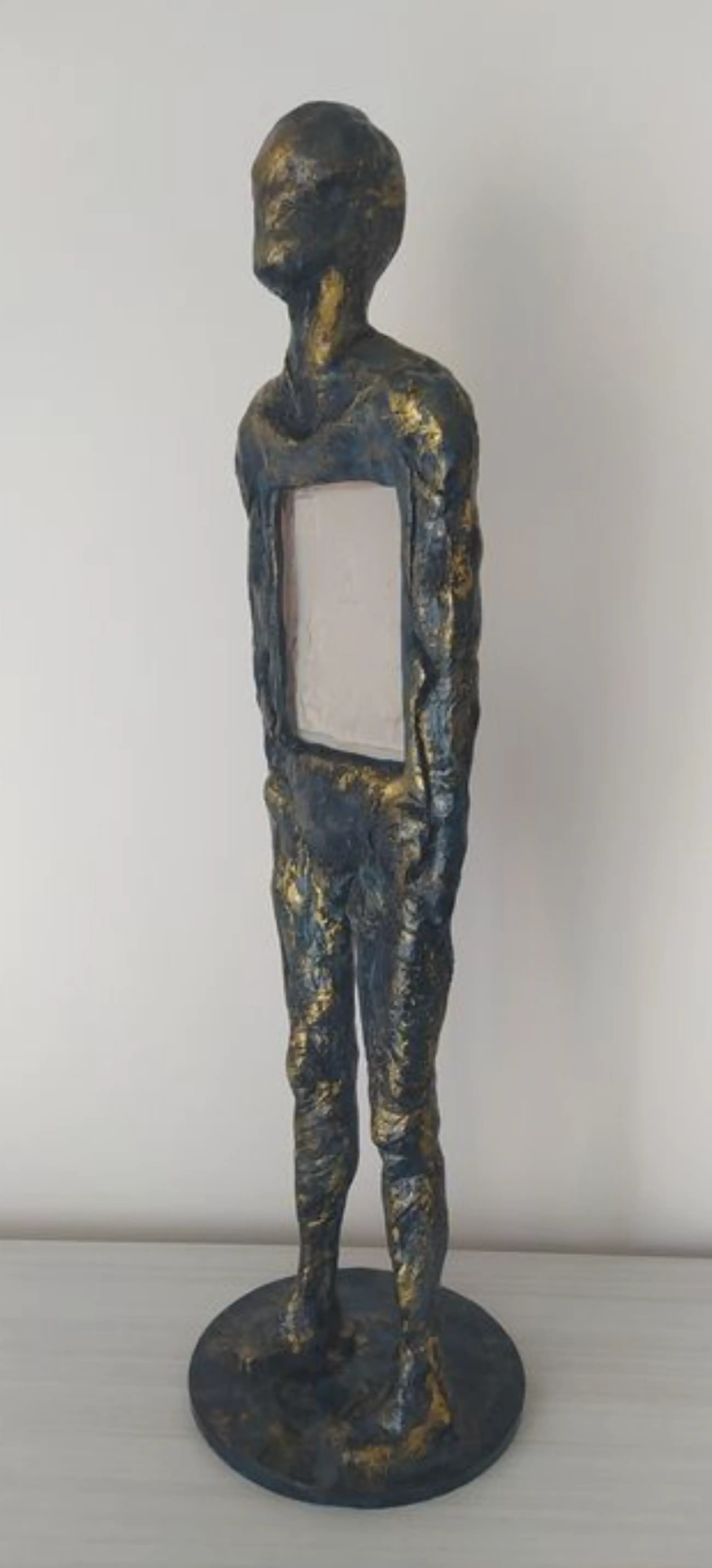 Figuratief beeldhouwwerk in hout en hars, volledig bedekt met een oppervlaktelaag van hars en email om het te beschermen.
