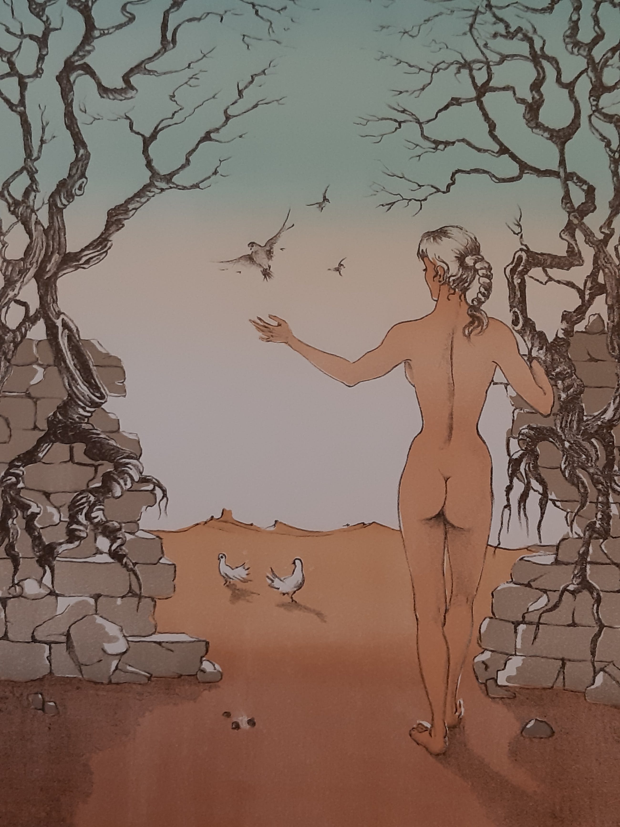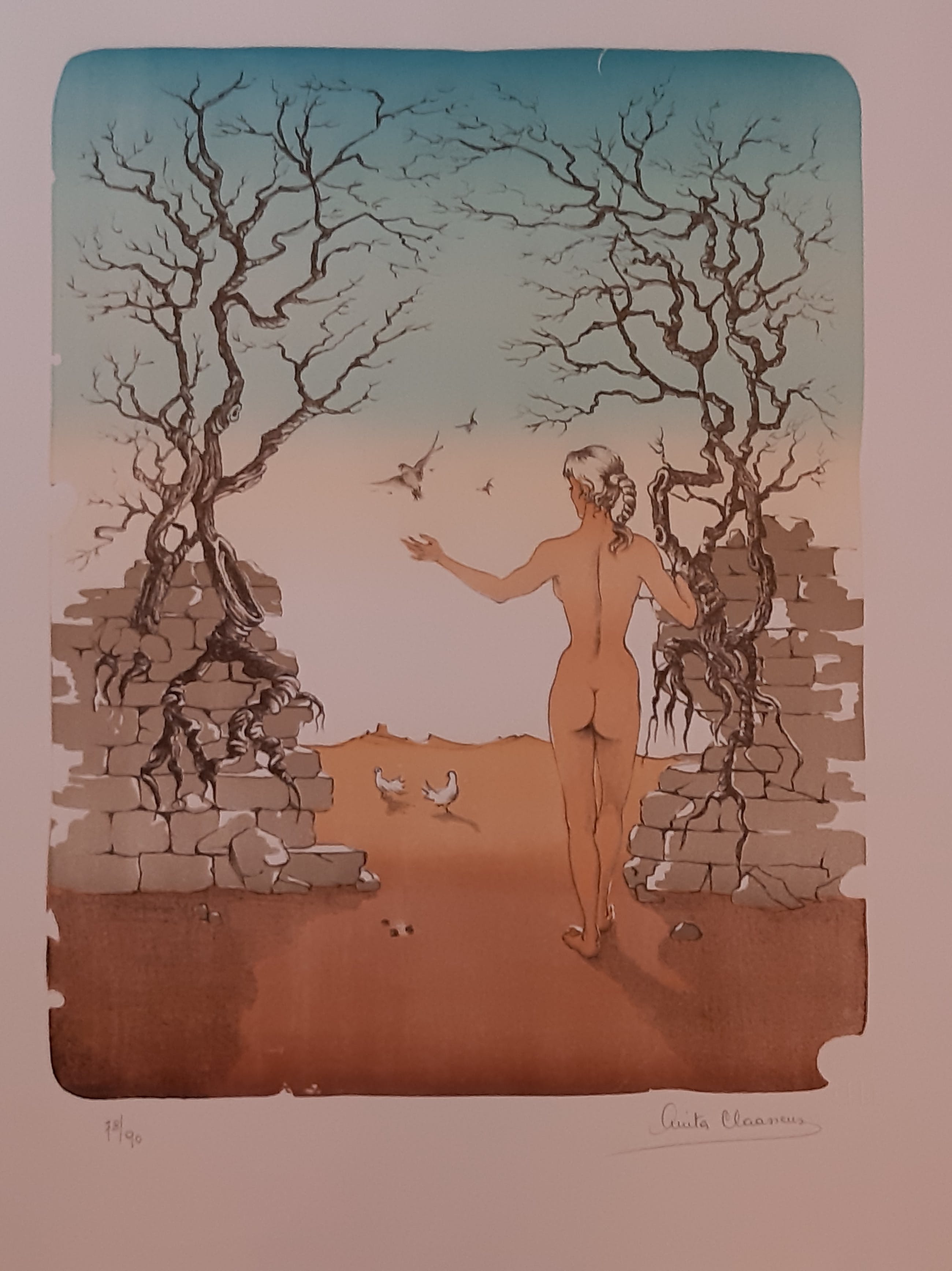 Mooie kleurenlitho in gelimiteerde oplage op geschept papier gemerkt met Rijkscentrum Frans Masereel stempel, van de Belgische kunstenares Anita Claassens, handgesigneerd, rechstonder; het betreft nummer 78/90. Afmeting: 65 x 50 cm.