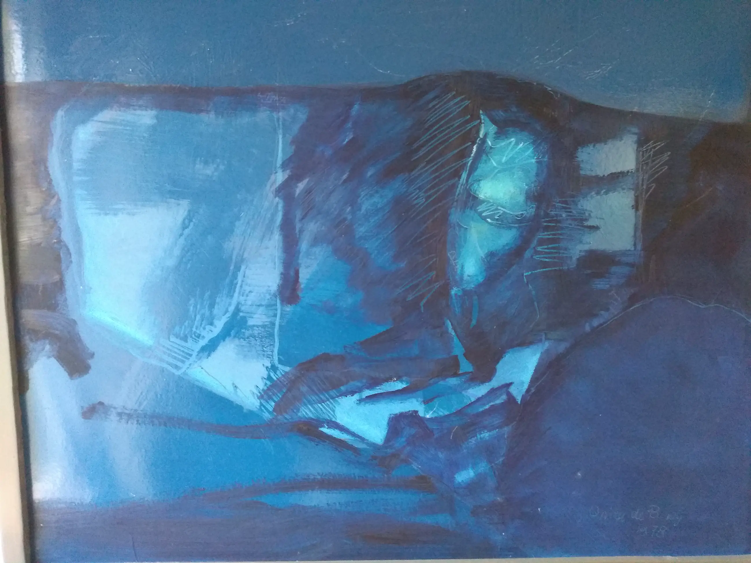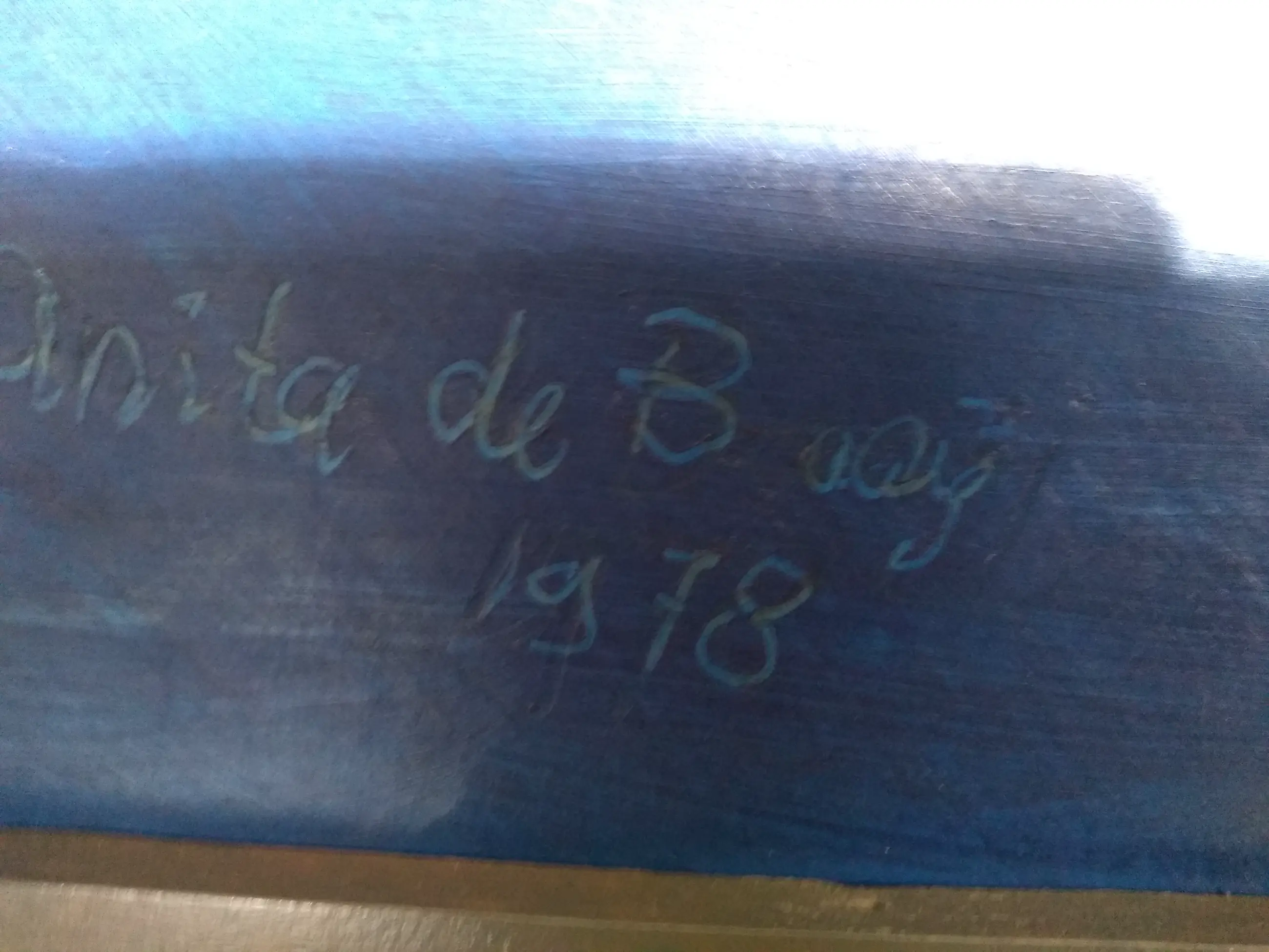 een zeer sprekend, abstract schilderij uit een vroegere periode van deze kunstenares. Het werk is in uitnemende staat.