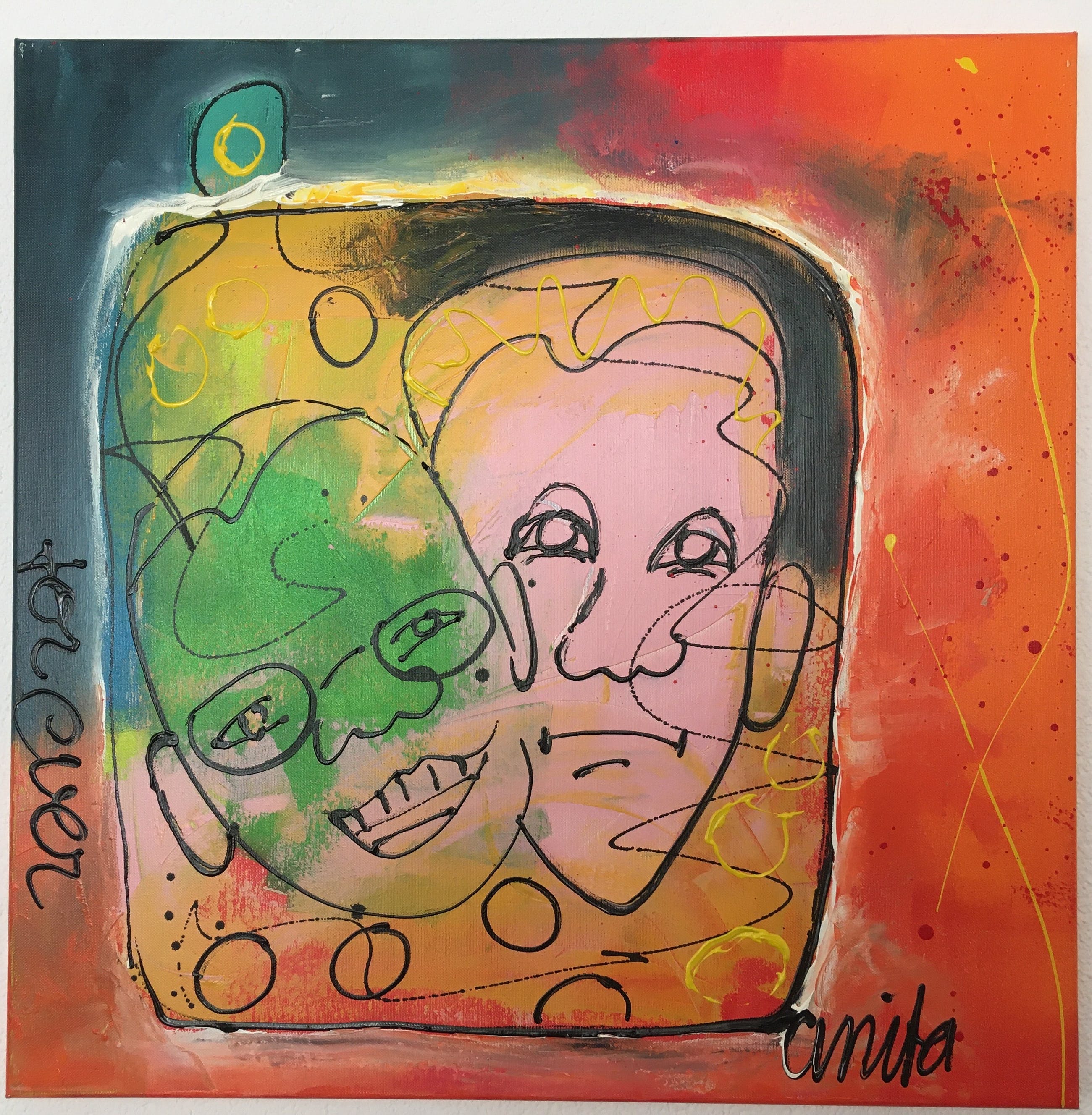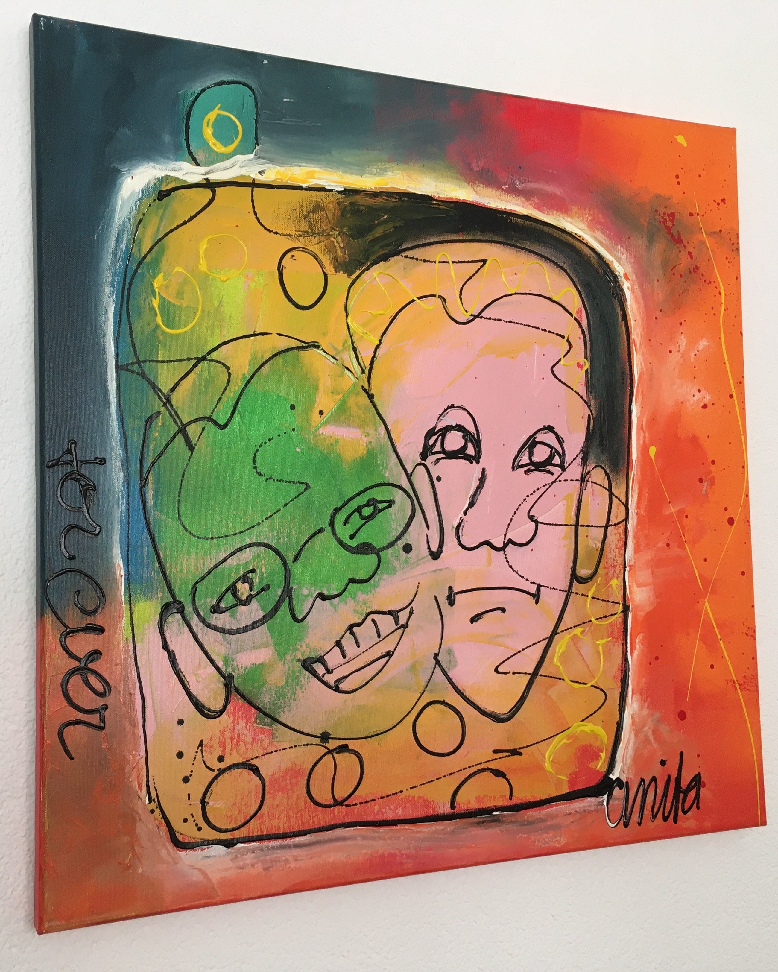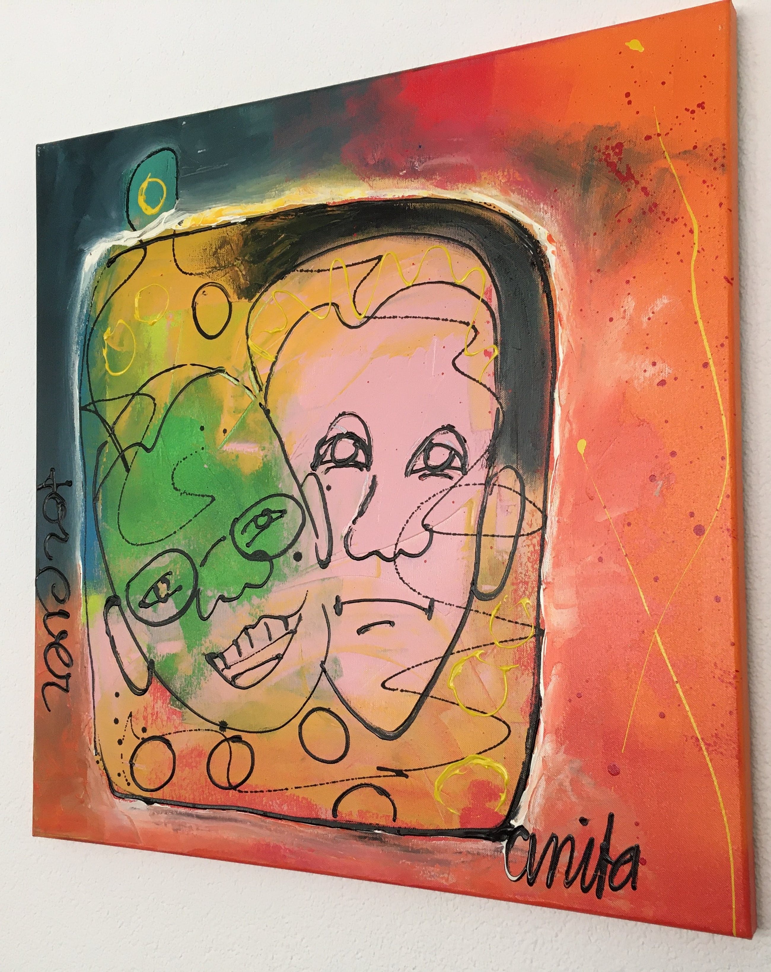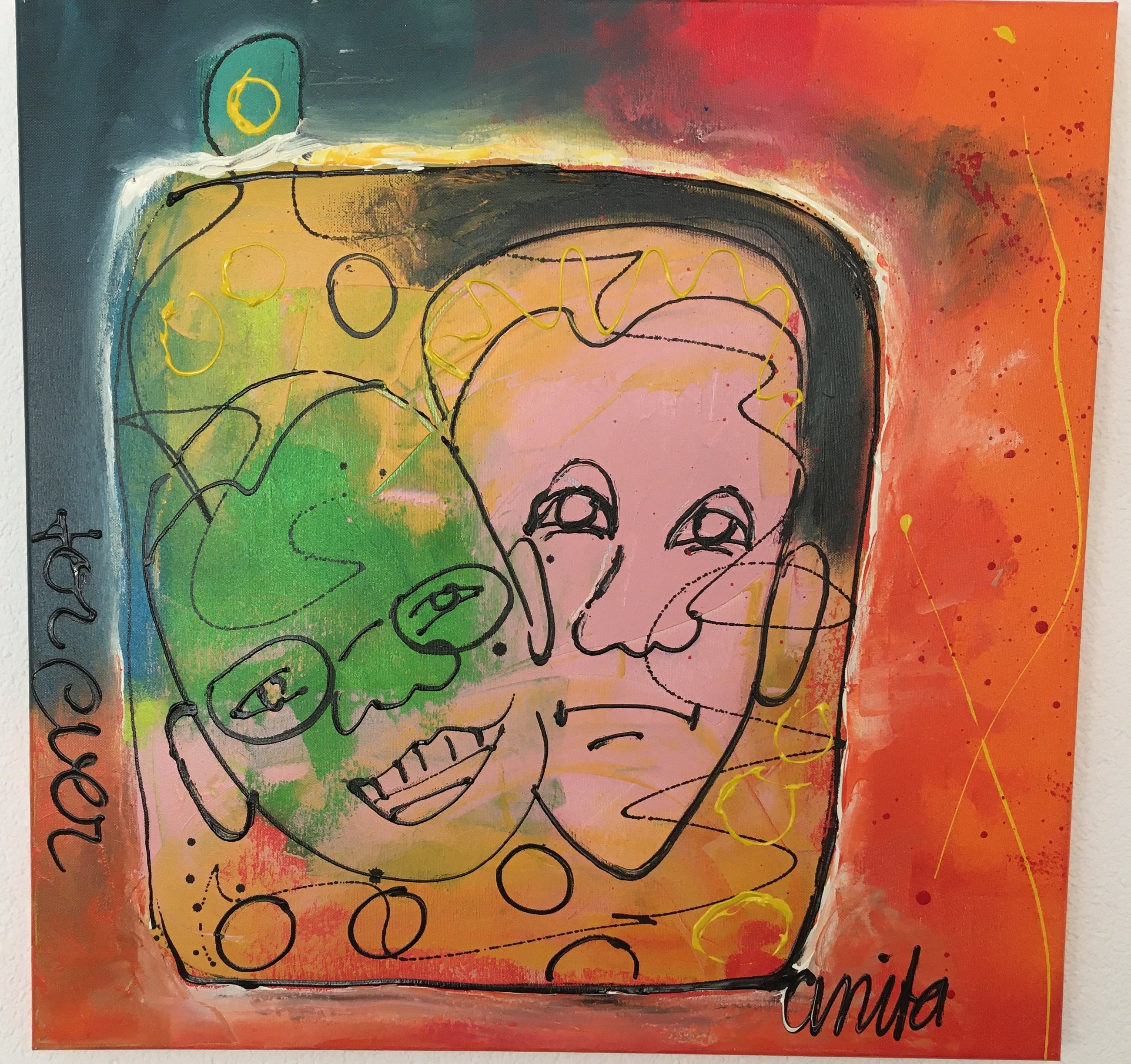 Anita is een zeer veelzijdig kunstenares ze maakt schilderijen en beelden. Haar schilderkunst gaat van zeer realistisch naar abstract. Haar grote passie voor dieren heeft zich vertaald in een hele serie Afrikaanse wilde dieren. Een periode was ze gefascineerd door de weergave van dieren door de prehistorische mens in grottekeningen. Met behulp van het batikken van rijstpapier heeft ze een grotachtige structuur weten te creëren waarop ze grottekeningen heeft afgebeeld. In haar abstracte werk maakt Anita gebruik van vele lagen acrylverf die met elkaar een interactie aangaan waardoor allerlei onvoorspelbare effecten ontstaan. Het schilderij krijgt als het ware een extra dimensie ook door het integreren van stukjes papier of karton. Mede door haar yoga achtergrond is ze de laatste jaren steeds meer bezig met beelden maken van figuren die in allerlei yoga of acrobatische houdingen staan. Het ideaal van yoga, een leven in harmonie en balans, en een perfecte integratie tussen lichaam en geest, wil ze hiermee tot uitdrukking brengen.