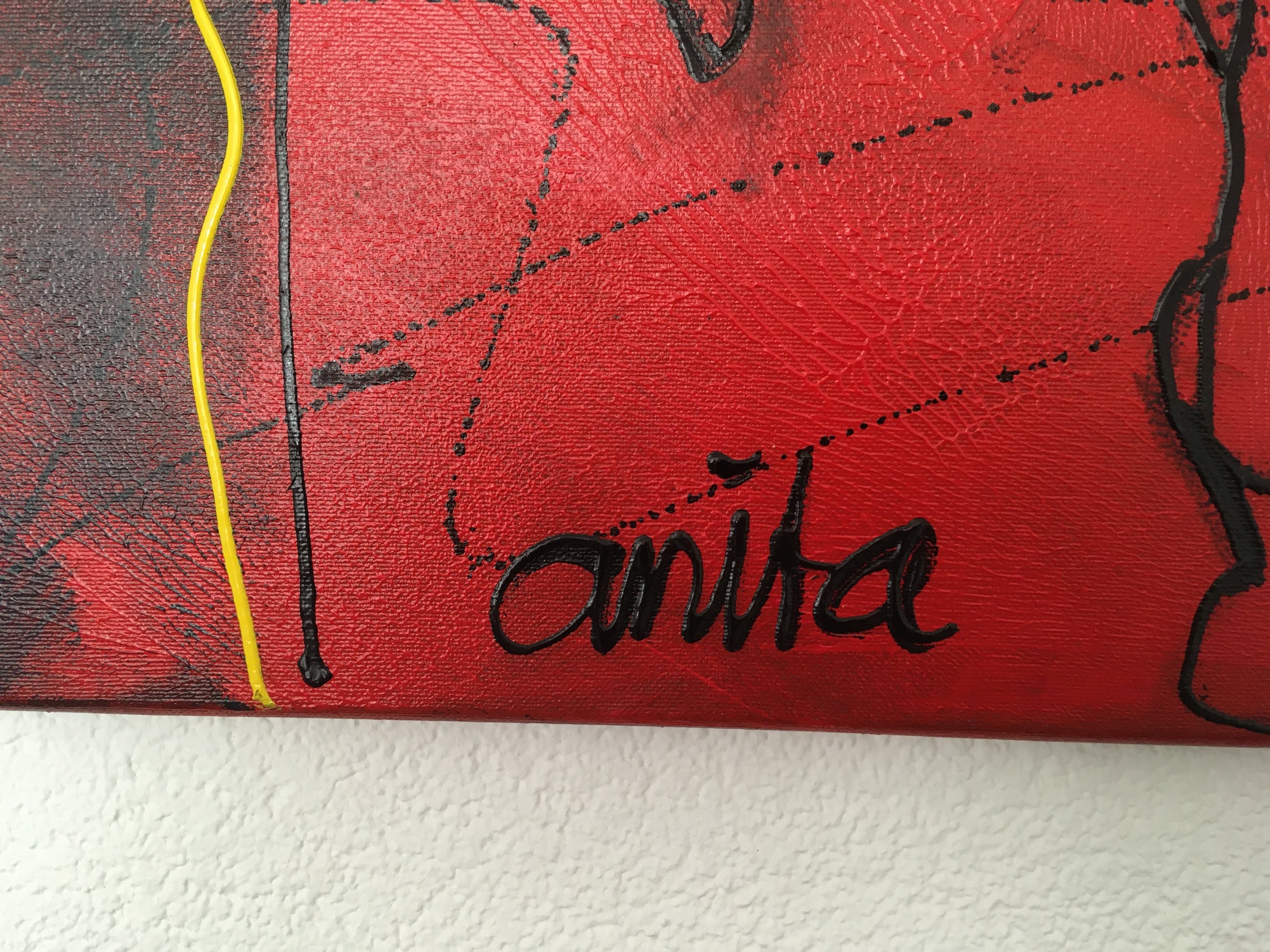 Anita is een zeer veelzijdig kunstenares ze maakt schilderijen en beelden. Haar schilderkunst gaat van zeer realistisch naar abstract. Haar grote passie voor dieren heeft zich vertaald in een hele serie Afrikaanse wilde dieren. Een periode was ze gefascineerd door de weergave van dieren door de prehistorische mens in grottekeningen. Met behulp van het batikken van rijstpapier heeft ze een grotachtige structuur weten te creëren waarop ze grottekeningen heeft afgebeeld. In haar abstracte werk maakt Anita gebruik van vele lagen acrylverf die met elkaar een interactie aangaan waardoor allerlei onvoorspelbare effecten ontstaan. Het schilderij krijgt als het ware een extra dimensie ook door het integreren van stukjes papier of karton. Mede door haar yoga achtergrond is ze de laatste jaren steeds meer bezig met beelden maken van figuren die in allerlei yoga of acrobatische houdingen staan. Het ideaal van yoga, een leven in harmonie en balans, en een perfecte integratie tussen lichaam en geest, wil ze hiermee tot uitdrukking brengen.